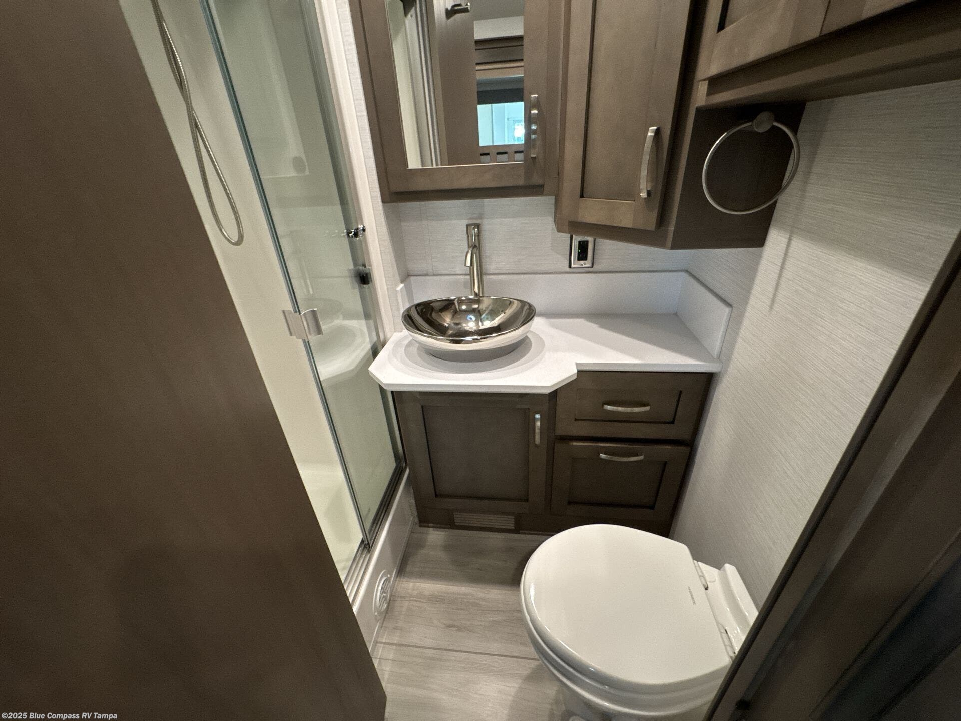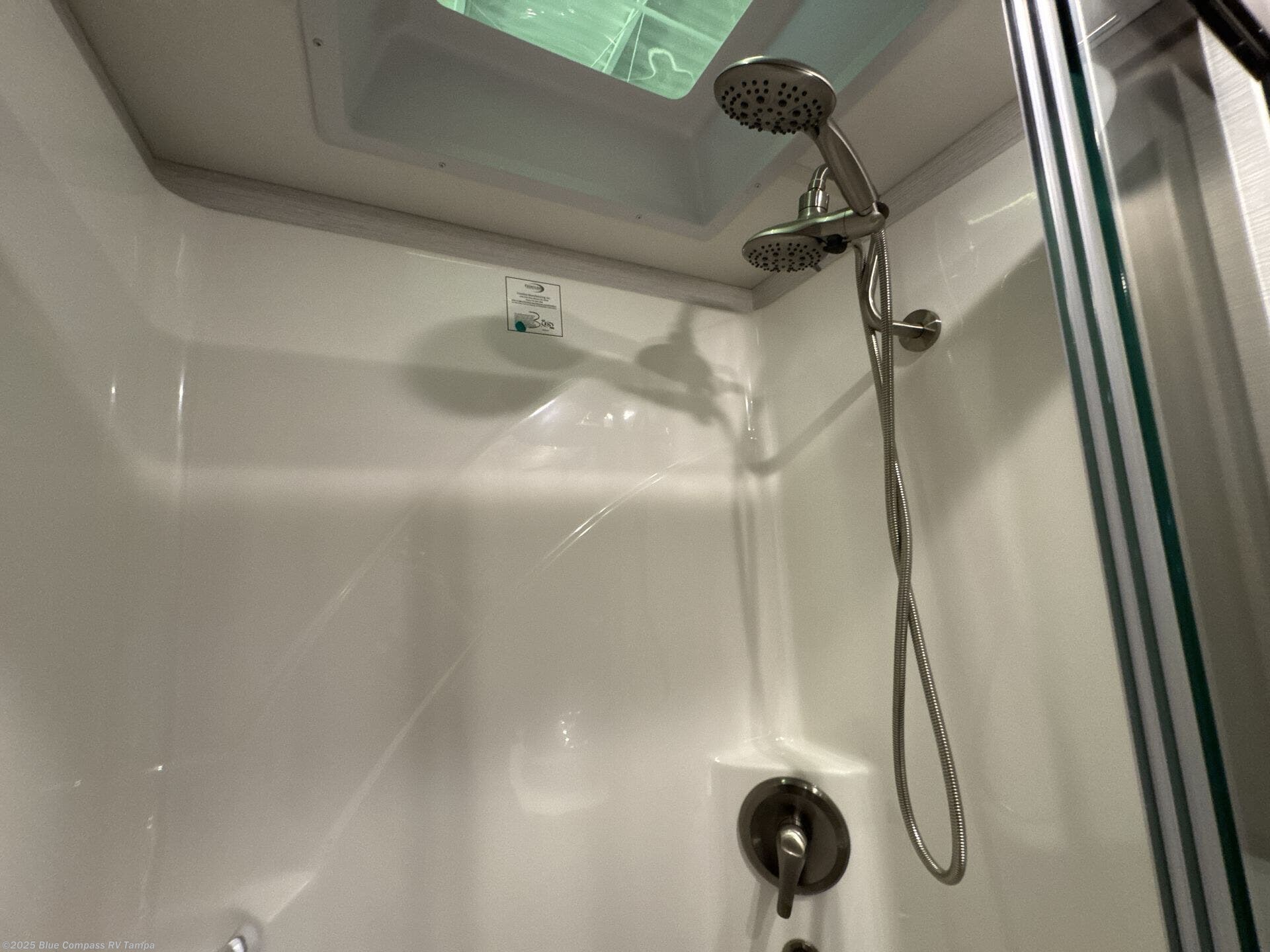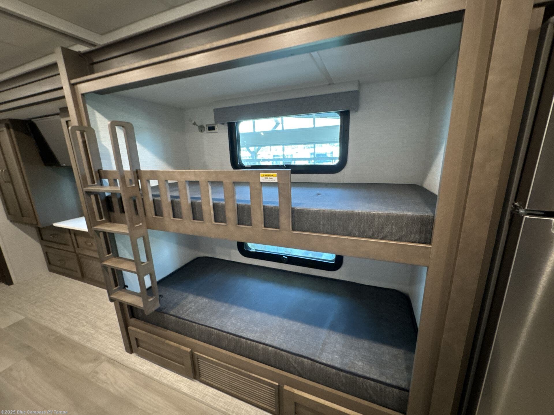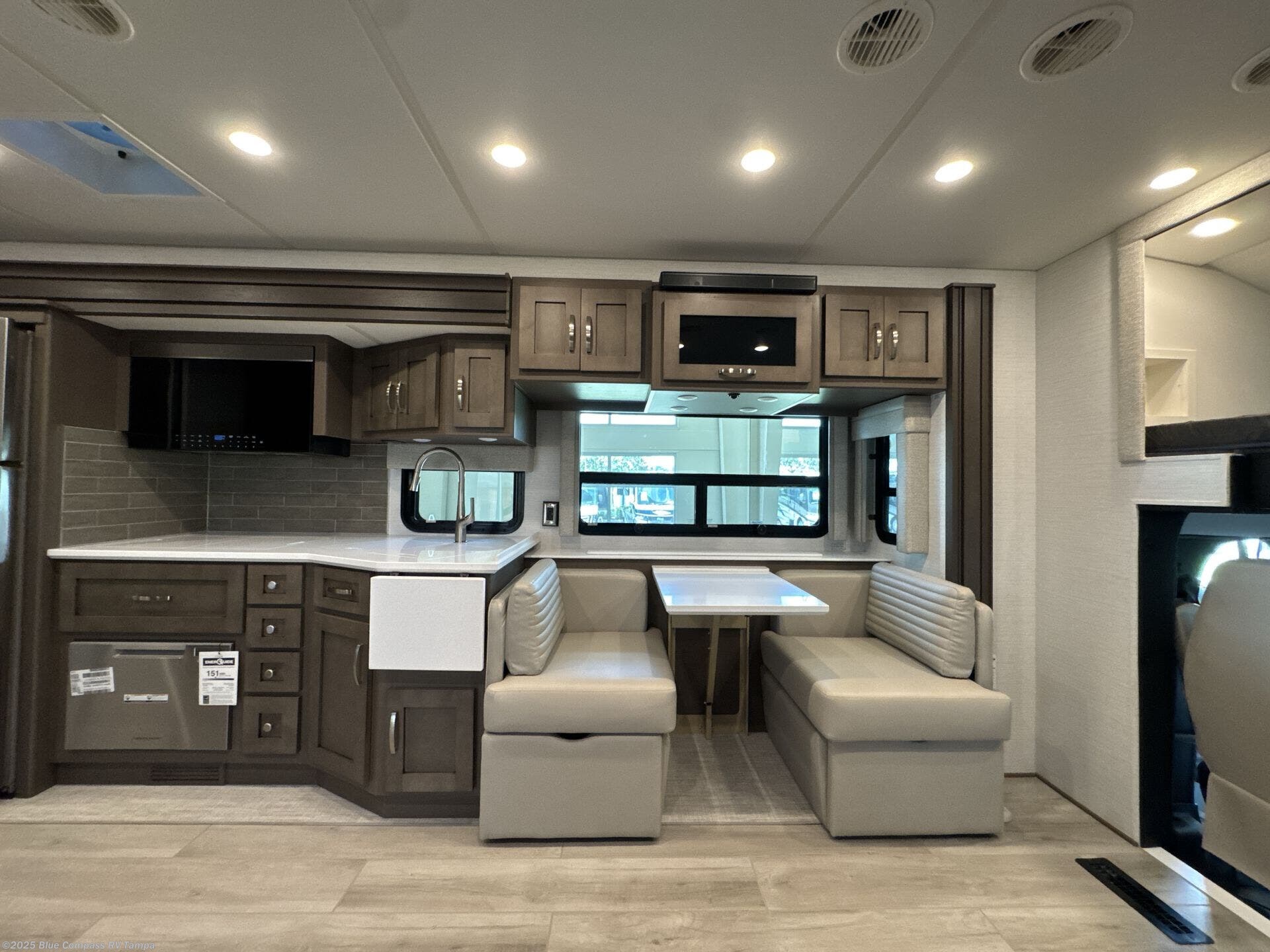 This motorhome is great for families with kids! The rear private bedroom has a retracting king bed slide across from shirt wardrobes and a dresser with a TV. If you need more sleeping space then you can utilize the set of 30" x 72" bunk beds with drawers below, the bunk over cab, or lay on the 74" sofa comfort lounge. The chef can prepare their best home cooked meals with the countertop extension, the microwave convection oven with air fryer and 18 cu. ft. residential refrigerator, plus you could add the optional induction cooktop or optional dishwasher for easy cleanup, and you can comfortably enjoy all of your meals at the booth dinette (non-sleeper). After a long day of traveling, you can easily freshen up in the full bathroom with the 40" x 30" shower and store any necessary toiletries in the overhead cabinets!