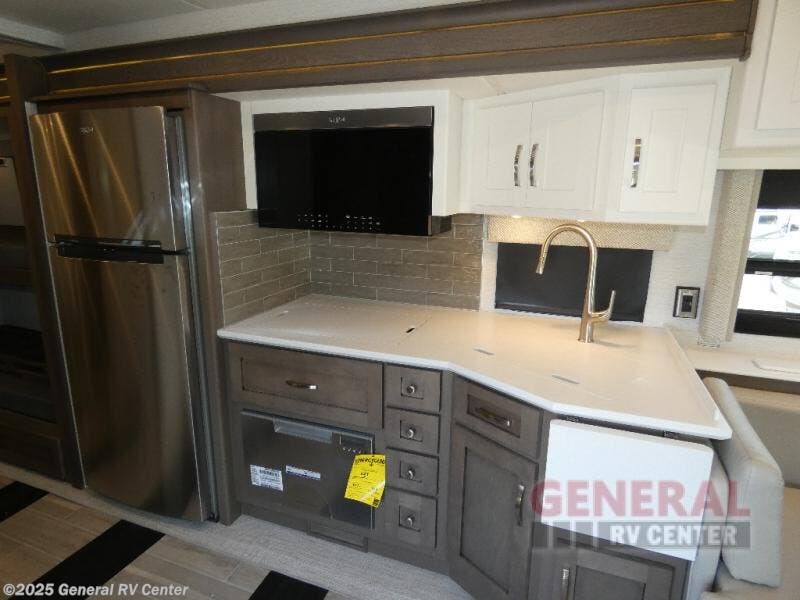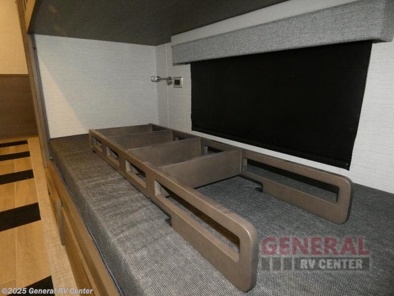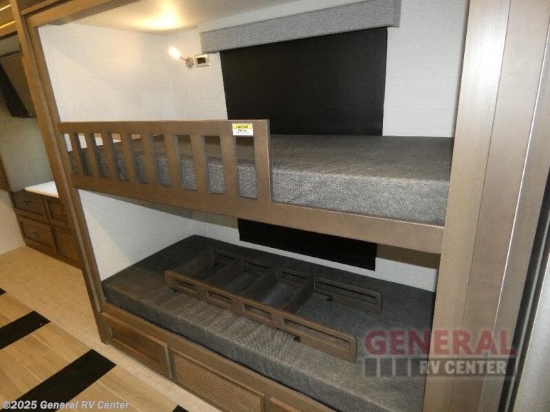 This motorhome is great for families with kids! The rear private bedroom has a retracting king bed slide across from shirt wardrobes and a dresser with a TV. If you need more sleeping space then you can utilize the set of 30" x 72" bunk beds with drawers below, the bunk over cab, or lay on the theater seats. The chef can prepare their best home cooked meals with the countertop extension, the microwave convection oven with air fryer and 18 cu. ft. residential refrigerator, and you can comfortably enjoy all of your meals at the booth dinette (non-sleeper). After a long day of traveling, you can easily freshen up in the full bathroom with the 40" x 30" shower and store any necessary toiletries in the overhead cabinets!