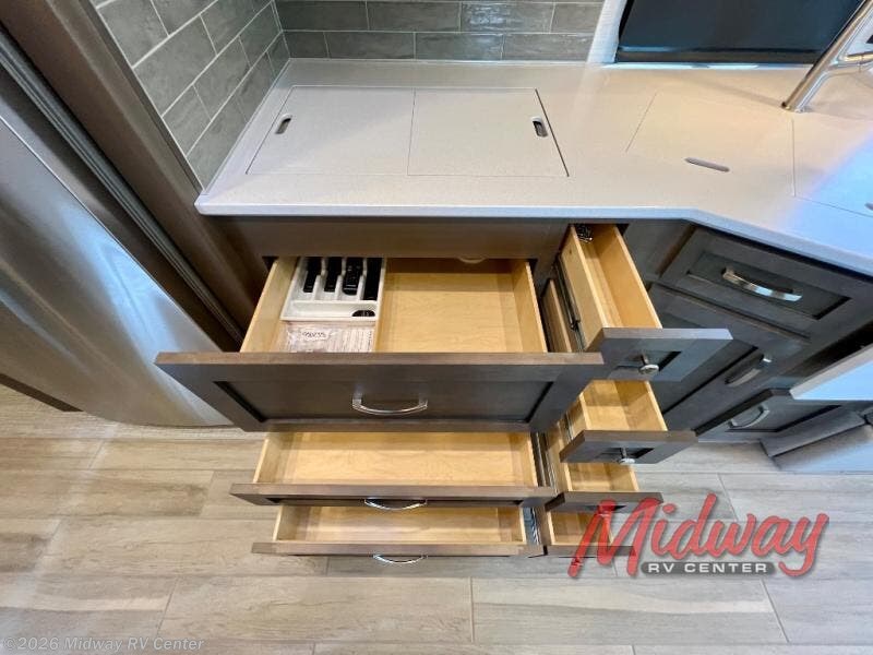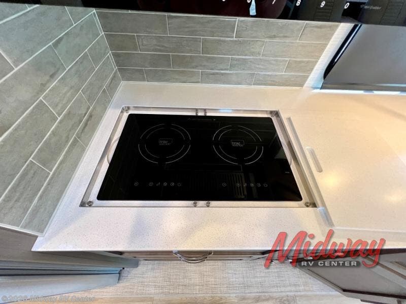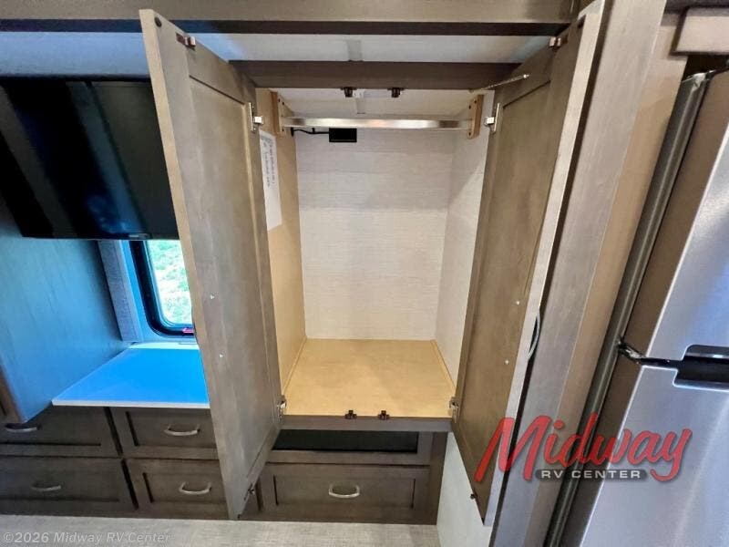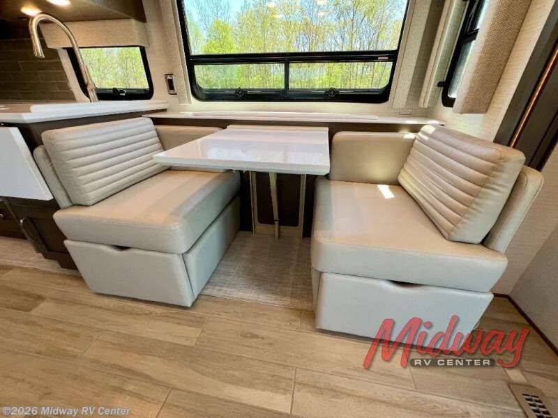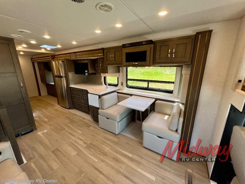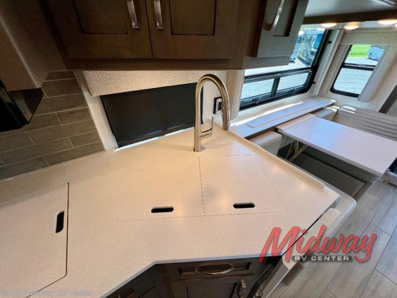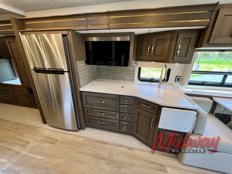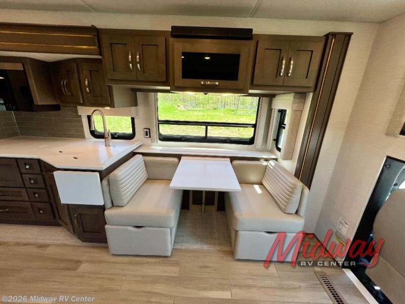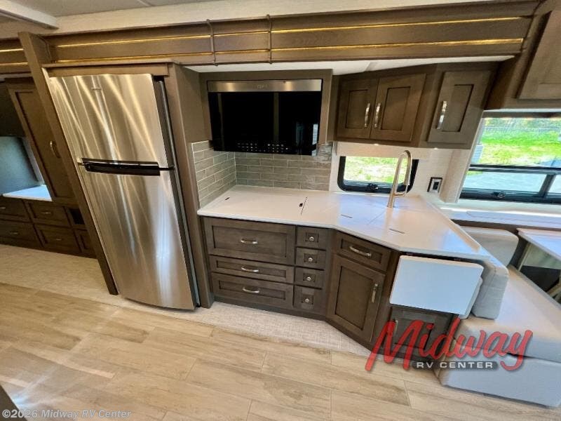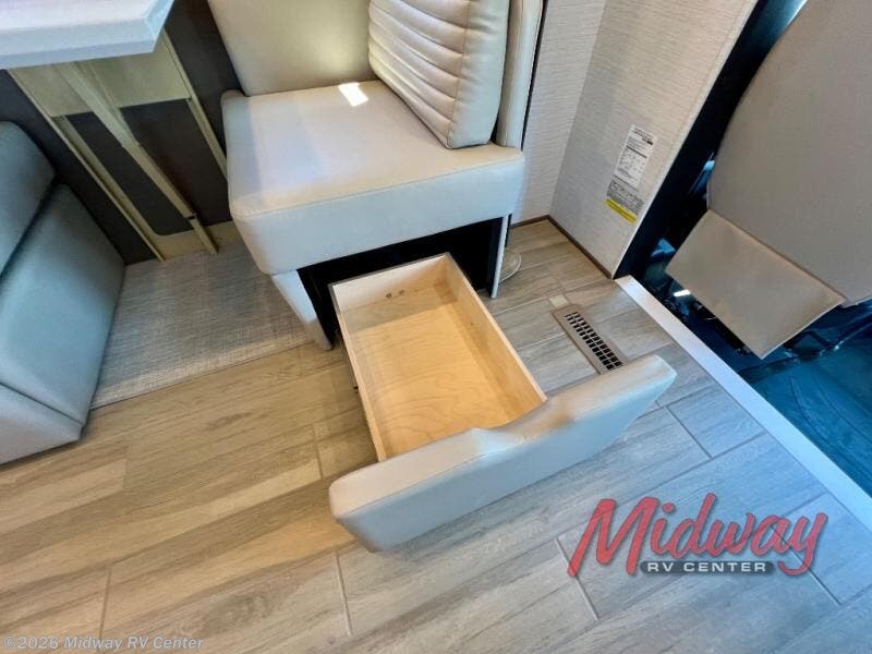 If you're looking for more space then this motorhome is for you! With a bath and a half, it's easy for everyone to use the restroom without having to use the camp's facilities. The full rear bathroom not only has a 40" x 30" shower, a wardrobe with shelves, and an area for either a wardrobe or an optional washer and dryer, but also an emergency exit behind the toilet. The private bedroom has a retracting king bed slide across from shirt wardrobes and a dresser with a TV. If you need more sleeping space then you can utilize the bunk over cab or lay on the 74" sofa comfort lounge. The chef can prepare their best home cooked meals with the countertop extension, the microwave convection oven with air fryer and 18 cu. ft. residential refrigerator, plus you could add the optional induction cooktop or optional dishwasher for easy cleanup, and you can comfortably enjoy all of your meals at the booth dinette which can also transform into an extra sleeping space if needed!