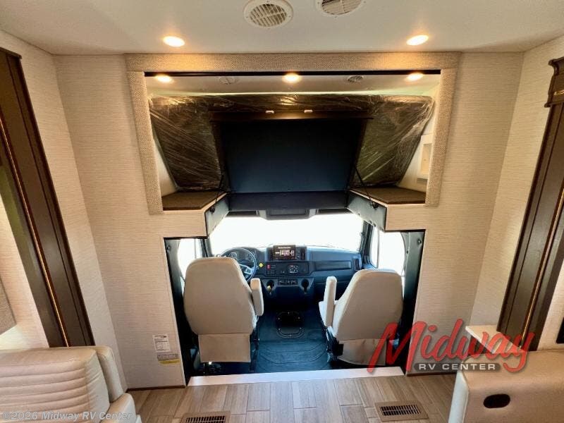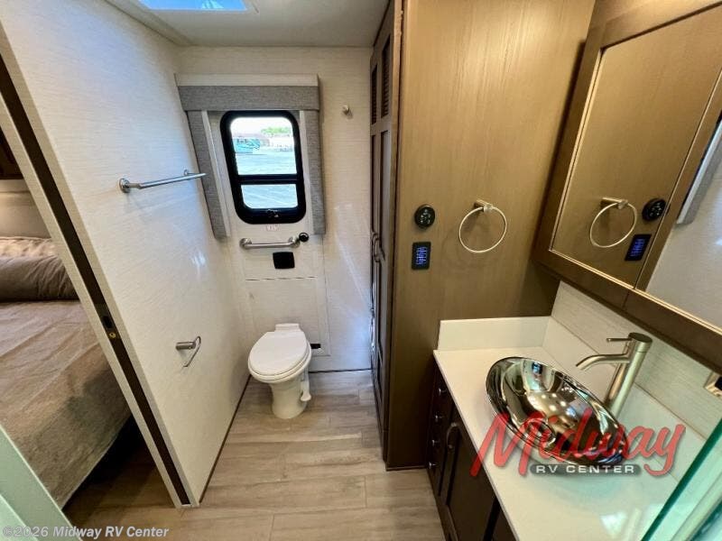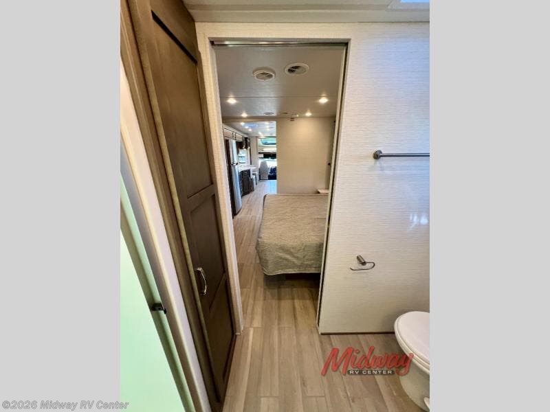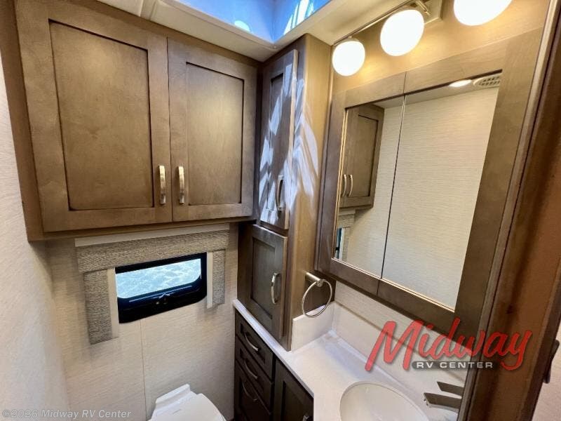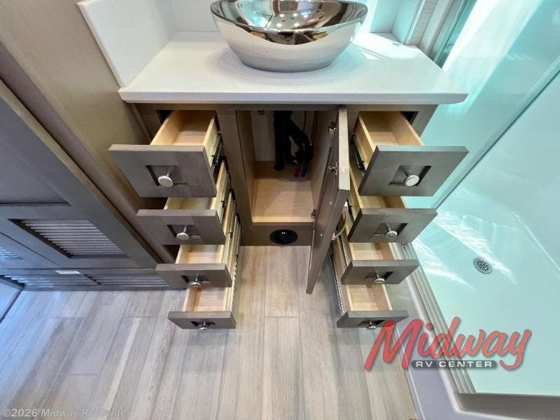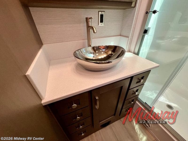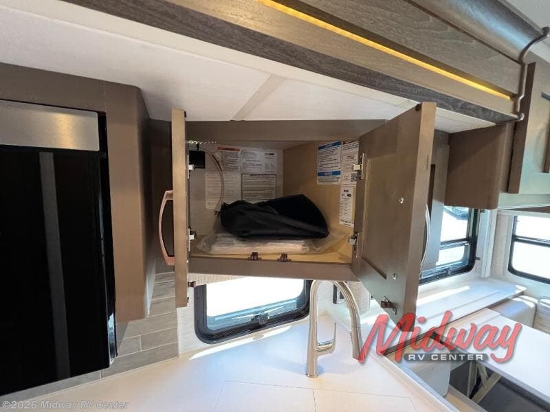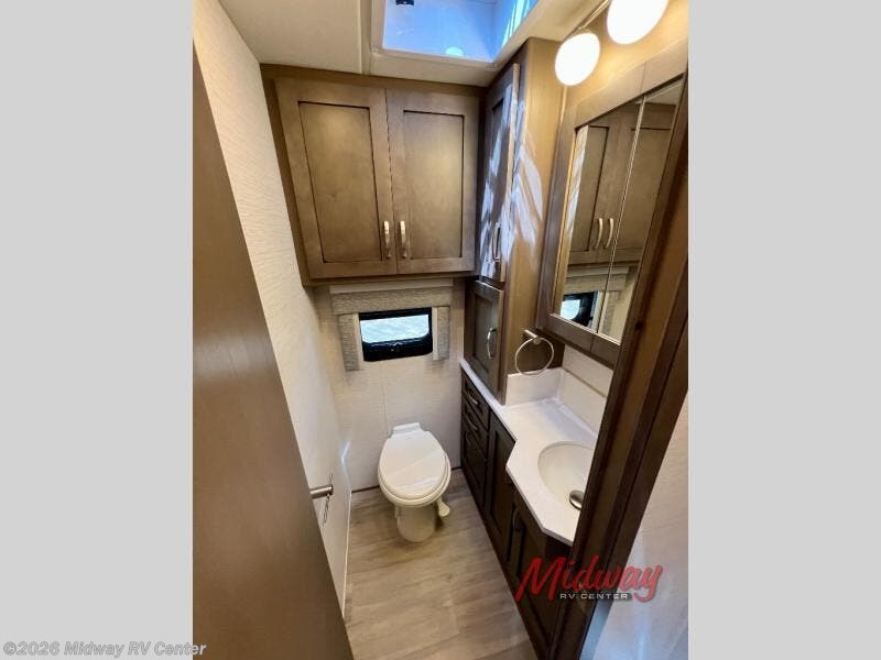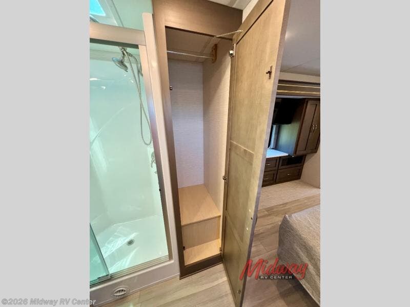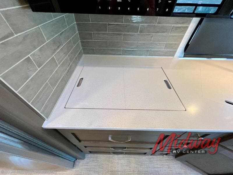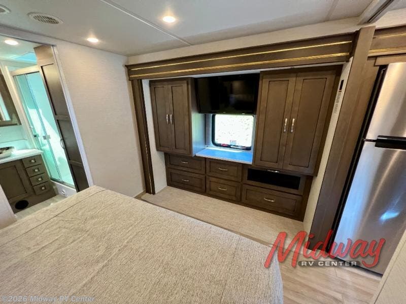 If you're looking for more space then this motorhome is for you! With a bath and a half, it's easy for everyone to use the restroom without having to use the camp's facilities. The full rear bathroom not only has a 40" x 30" shower, a wardrobe with shelves, and an area for either a wardrobe or an optional washer and dryer, but also an emergency exit behind the toilet. The private bedroom has a retracting king bed slide across from shirt wardrobes and a dresser with a TV. If you need more sleeping space then you can utilize the bunk over cab or lay on the 74" sofa comfort lounge. The chef can prepare their best home cooked meals with the countertop extension, the microwave convection oven with air fryer and 18 cu. ft. residential refrigerator, plus you could add the optional induction cooktop or optional dishwasher for easy cleanup, and you can comfortably enjoy all of your meals at the booth dinette which can also transform into an extra sleeping space if needed!