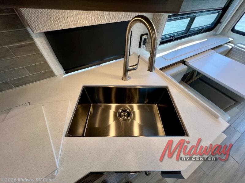 - S2RV Chassis, 360HP, Azure Full Paint, Stowe Decor, Mesa Glazed Maple Cabinets, Central Vacuum, Induction Cook Top, Sirius Radio Capable, Spendide Washer/Dryer, Winegard Rayzar Antenna, Theater Seating, Solar Prep, Stainless Trim, Egress Door w/ Ladder System