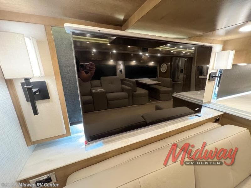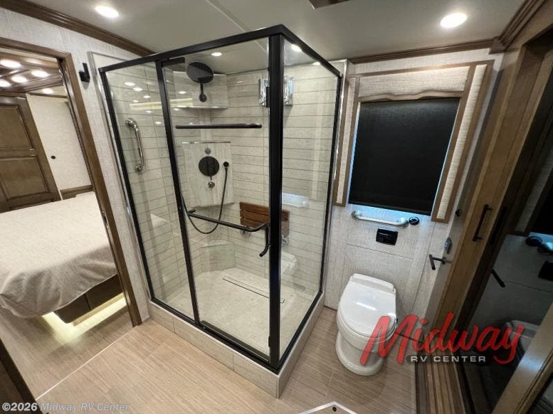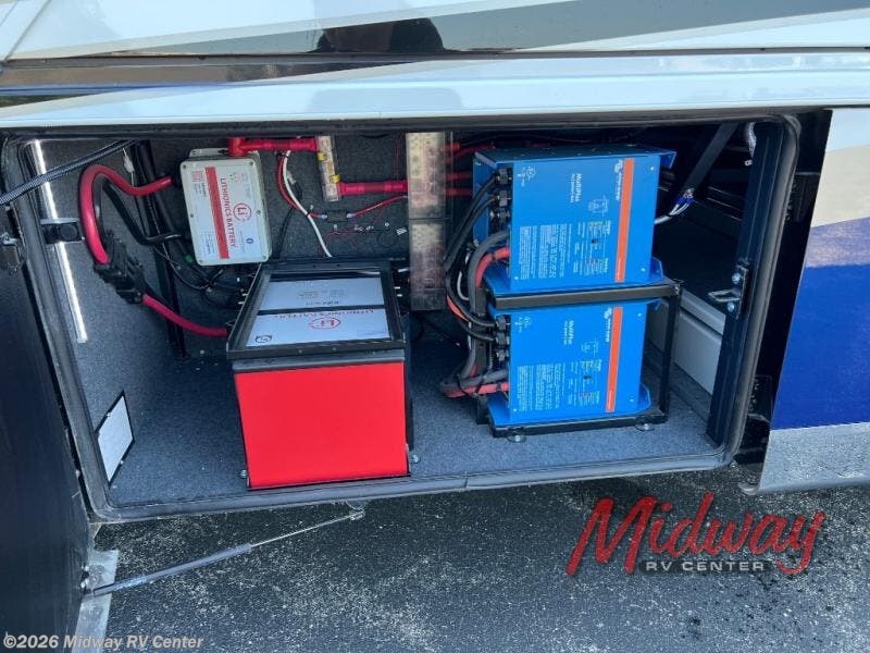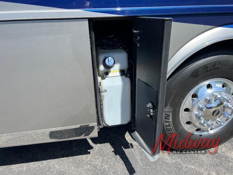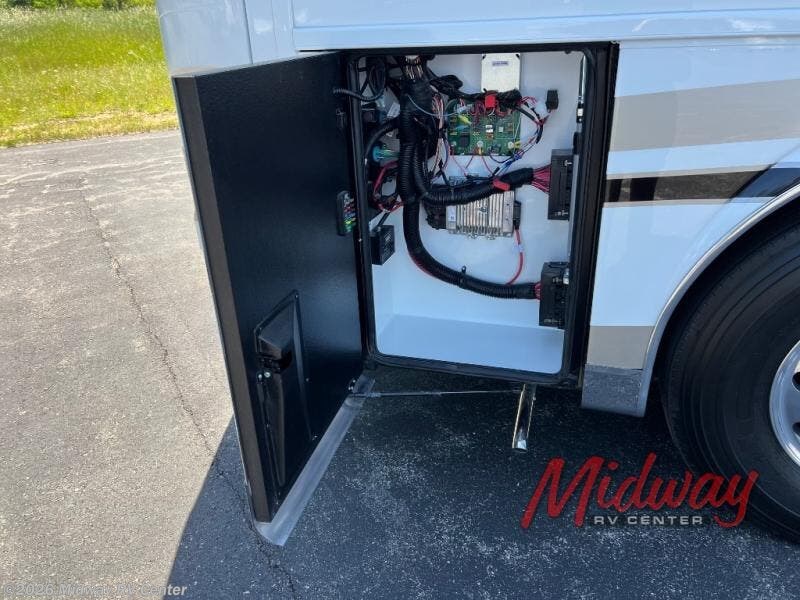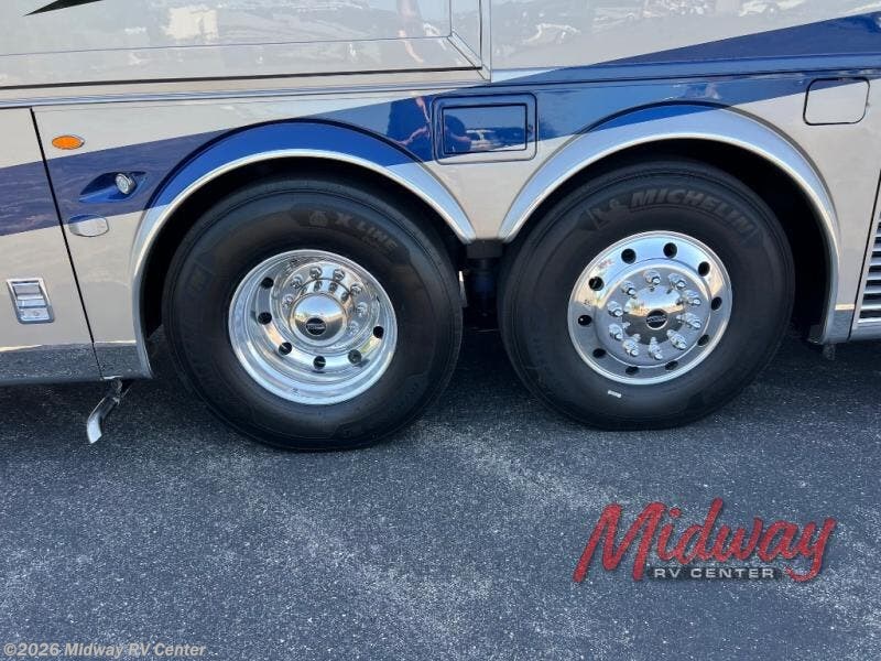 - Freightliner Chassis, Special Order Full Paint, Wentworth Decor, Chestnut Glazed Maple Cabinets, Dishwasher, Monitor on Passenger Side, Rear Camera Prep for Stacker Trailer, Starlink Internet System, Universal Toll Module, WIFI System w/ Everest Router, Premier Air Mattress, Theater Seating, Lithium Ion 640 w/2 3K Invertors, 4 Merlin Solar Panels, Assist Handle in Each Shower, Stainless Baggage Door Trim, Power Storage Trays