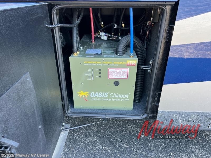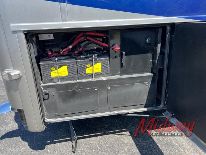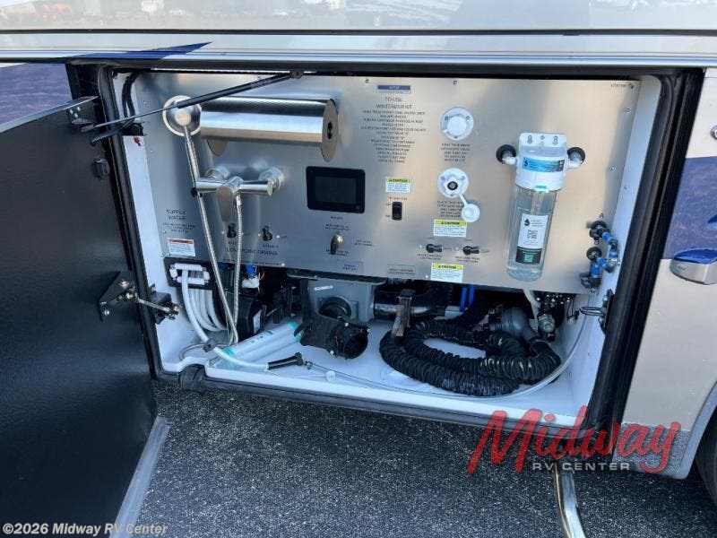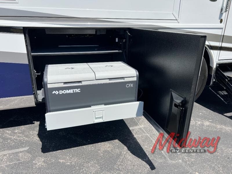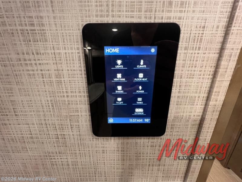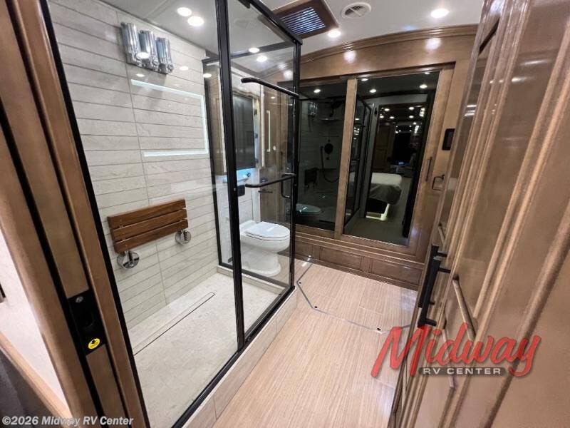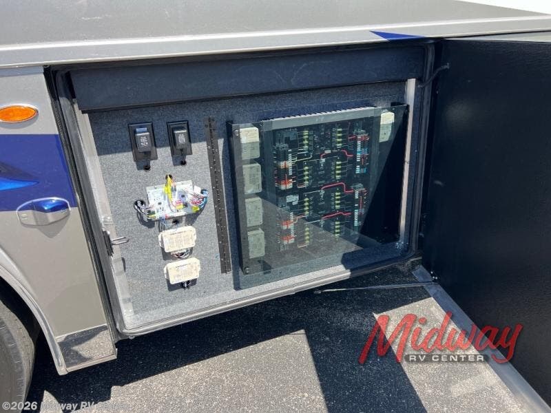 - Freightliner Chassis, Special Order Full Paint, Wentworth Decor, Chestnut Glazed Maple Cabinets, Dishwasher, Monitor on Passenger Side, Rear Camera Prep for Stacker Trailer, Starlink Internet System, Universal Toll Module, WIFI System w/ Everest Router, Premier Air Mattress, Theater Seating, Lithium Ion 640 w/2 3K Invertors, 4 Merlin Solar Panels, Assist Handle in Each Shower, Stainless Baggage Door Trim, Power Storage Trays