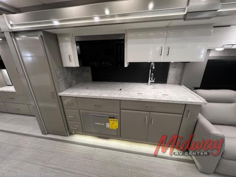 This motorhome has everything you need for a comfortable road trip! The master suite has a king bed slide for a good night's rest across from a dresser with a Samsung LED TV and shirt wardrobes on either side. Attached to the bedroom is your very own full rear bathroom which has a 42" x 35" angled shower next to a wardrobe with drawers and a Splendide washer and dryer next to the vanity sink. The chef will have everything they need to prepare delicious home cooked meals including a stainless steel 30" convection microwave with air fryer feature and a Whirlpool 19.7 cu. ft. refrigerator to keep the perishables fresh, plus the half bathroom is by the kitchen for quick bathroom breaks while cooking. Enjoy your meals at the Euro booth dinette (non-sleeper) and relax on the 74" hide-a-bed sofa while watching your favorite movies on the Samsung LED TV on power lift!