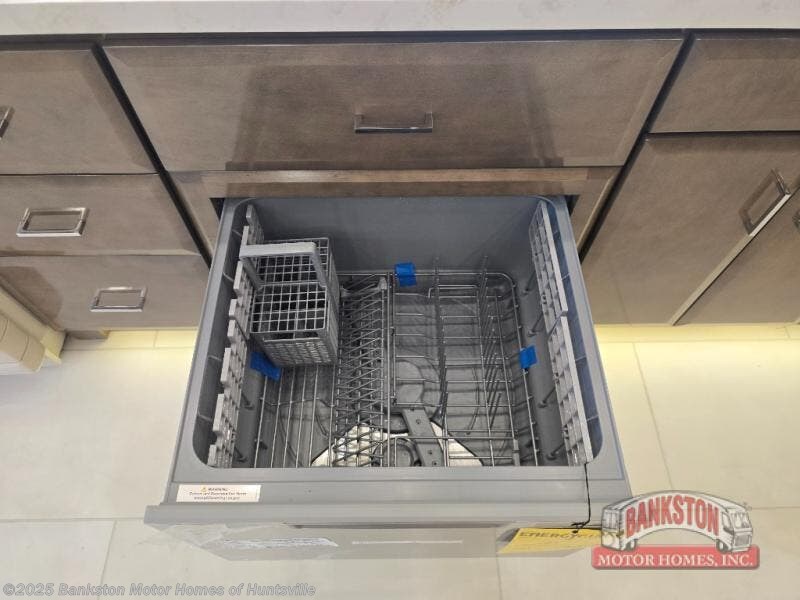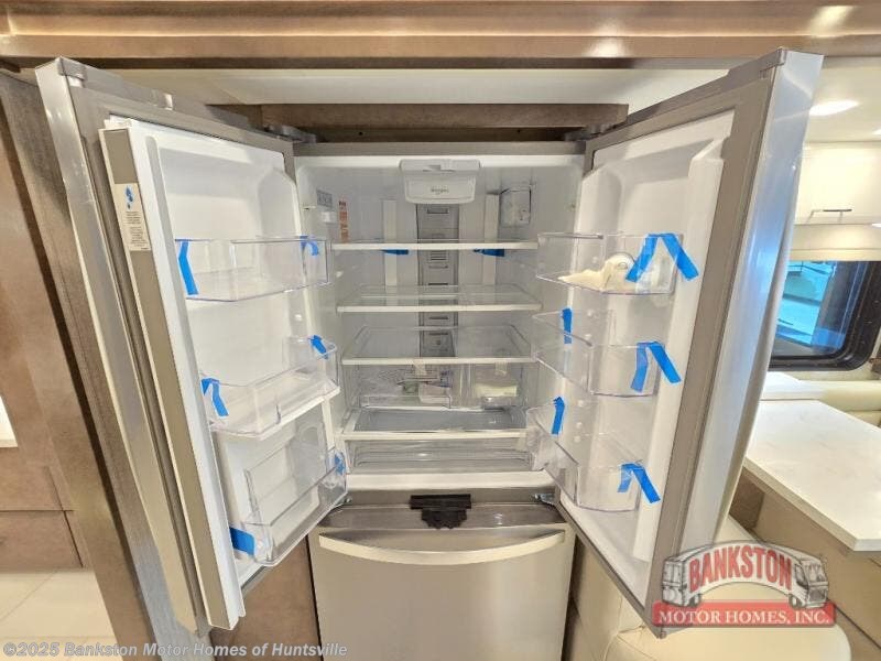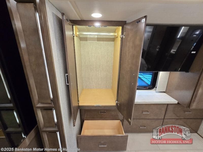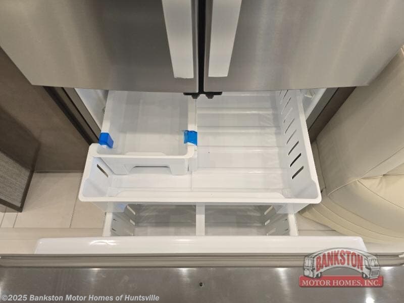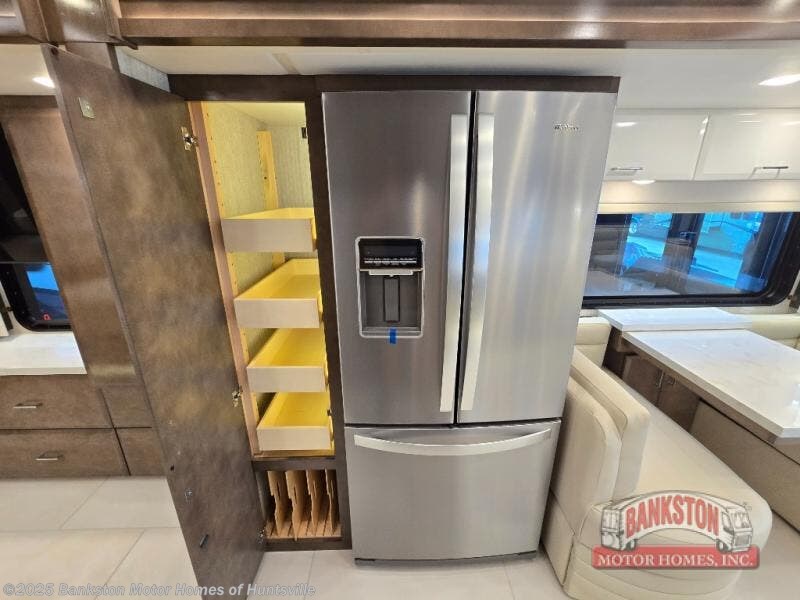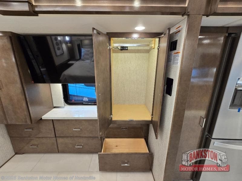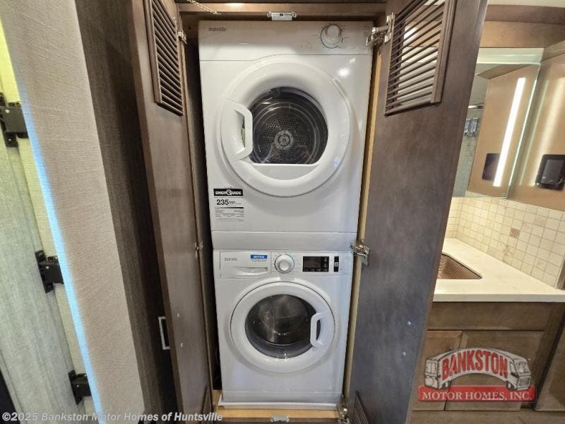 Don't pass up your opportunity to travel in pure luxury with this motorhome! The master suite has a king bed slide for a good night's rest across from a dresser with a Samsung LED TV and shirt wardrobes on either side. Attached to the bedroom is your very own full rear bathroom which has a 40" x 32" shower with a seat next to a linen closet and wardrobe, as well as a Splendide two-piece washer and dryer next to the vanity sink. The chef will have everything they need to prepare delicious home cooked meals including a cabinet pull-out, a stainless steel 30" convection microwave with air fryer feature and a Whirlpool 19.7 cu. ft. refrigerator to keep the perishables fresh, plus the half bathroom is by the kitchen for quick bathroom breaks while cooking. Enjoy your meals at the hide-a-leaf dinette and relax on either the 84" hide-a-bed sofa or the 62" jackknife sofa while watching your favorite movies on the Samsung LED TV on power lift!