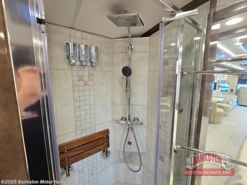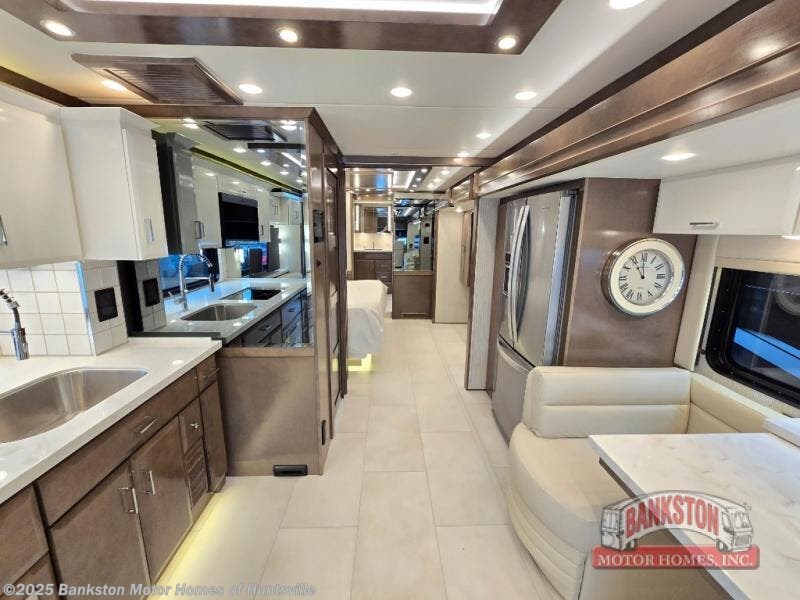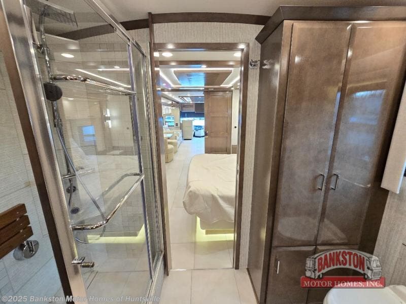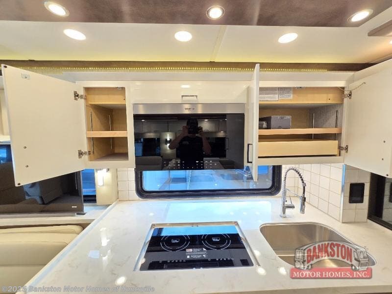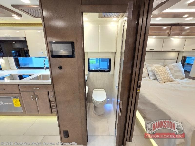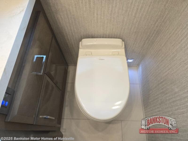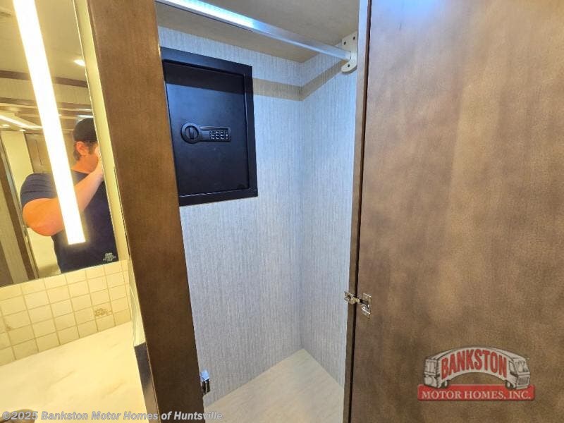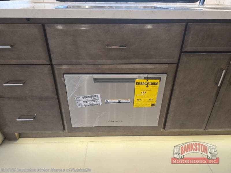 Don't pass up your opportunity to travel in pure luxury with this motorhome! The master suite has a king bed slide for a good night's rest across from a dresser with a Samsung LED TV and shirt wardrobes on either side. Attached to the bedroom is your very own full rear bathroom which has a 40" x 32" shower with a seat next to a linen closet and wardrobe, as well as a Splendide two-piece washer and dryer next to the vanity sink. The chef will have everything they need to prepare delicious home cooked meals including a cabinet pull-out, a stainless steel 30" convection microwave with air fryer feature and a Whirlpool 19.7 cu. ft. refrigerator to keep the perishables fresh, plus the half bathroom is by the kitchen for quick bathroom breaks while cooking. Enjoy your meals at the hide-a-leaf dinette and relax on either the 84" hide-a-bed sofa or the 62" jackknife sofa while watching your favorite movies on the Samsung LED TV on power lift!