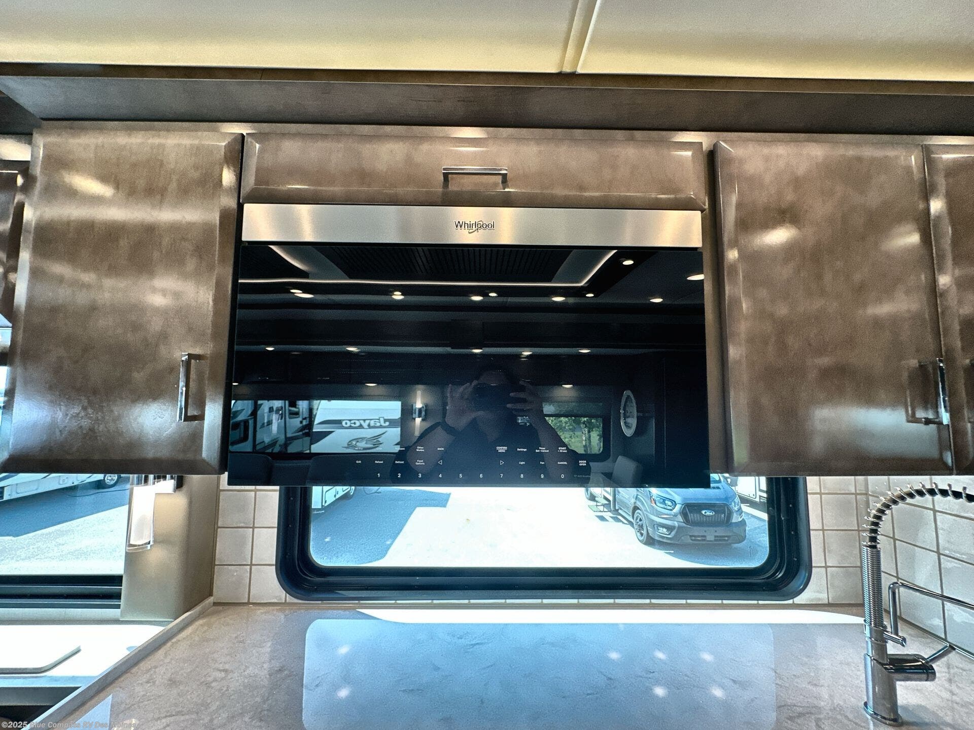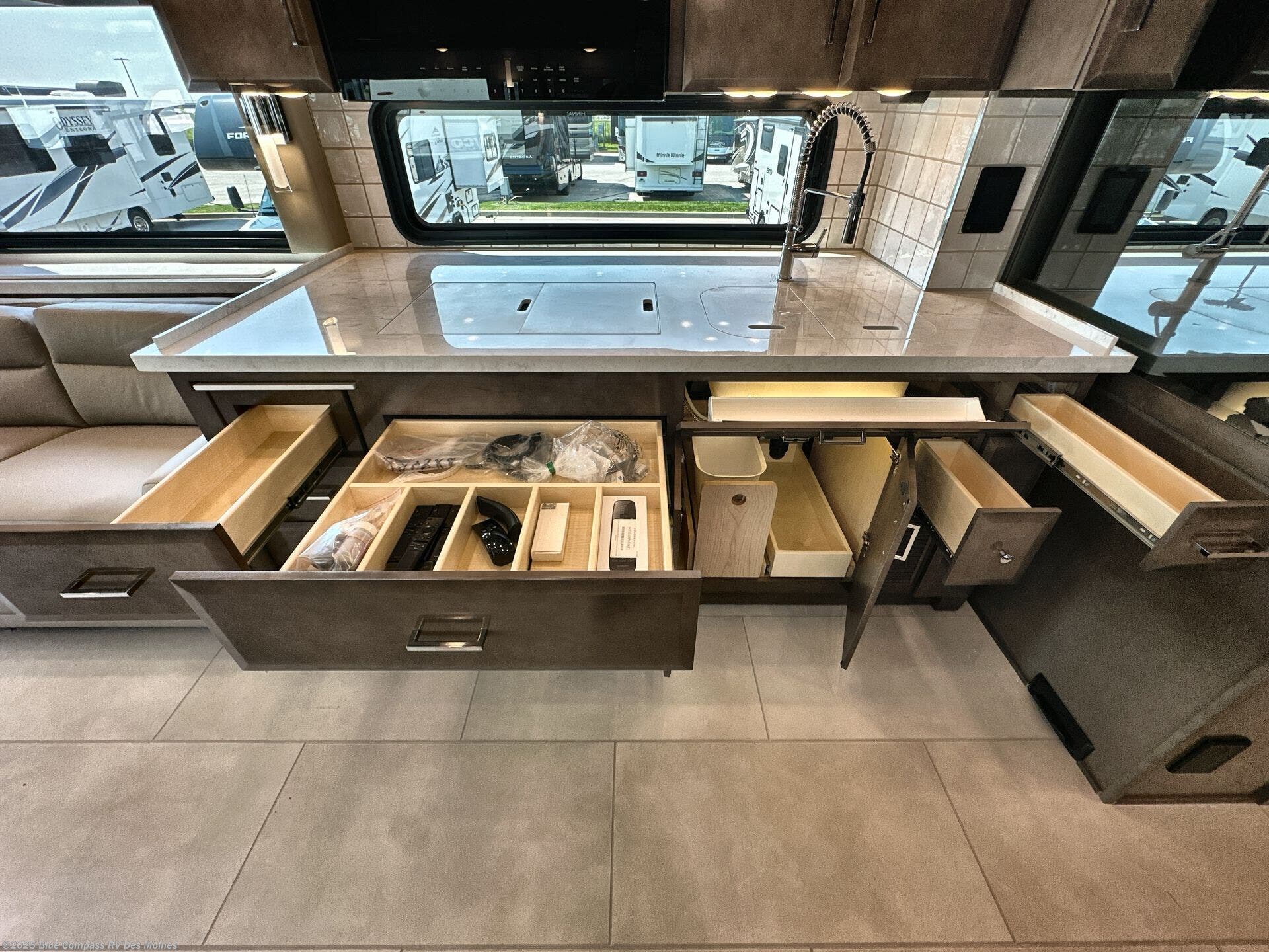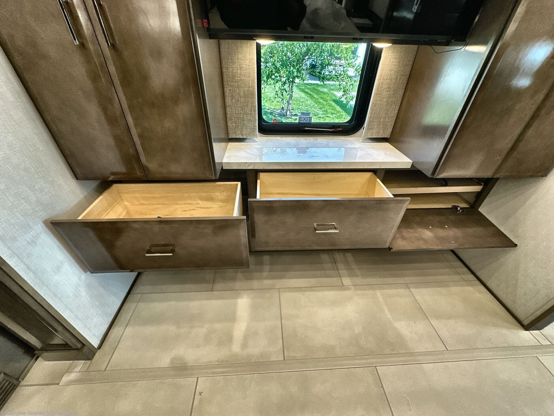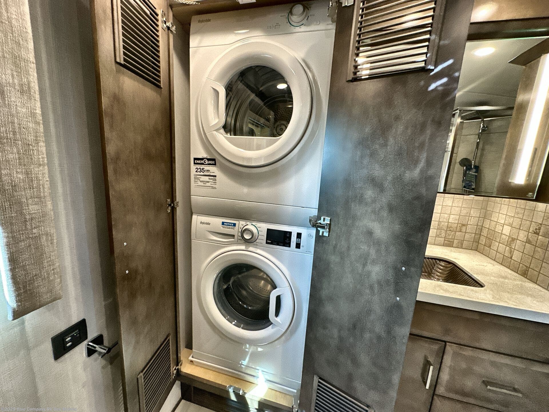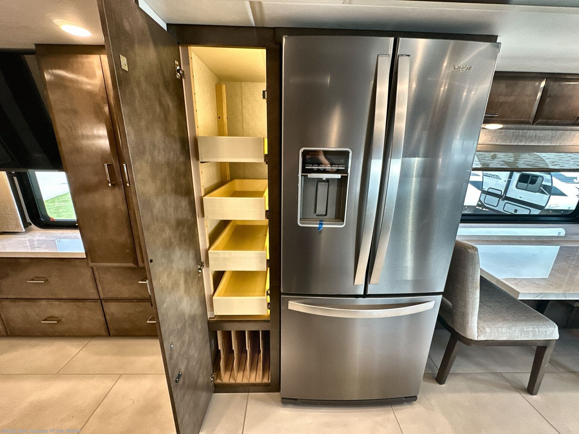 Don't pass up your opportunity to travel in pure luxury with this motorhome! The master suite has a king bed slide for a good night's rest across from a dresser with a Samsung LED TV and shirt wardrobes on either side. Attached to the bedroom is your very own full rear bathroom which has a 40" x 32" shower with a seat next to a linen closet and wardrobe, as well as a Splendide two-piece washer and dryer next to the vanity sink. The chef will have everything they need to prepare delicious home cooked meals including a cabinet pull-out, a stainless steel 30" convection microwave with air fryer feature and a Whirlpool 19.7 cu. ft. refrigerator to keep the perishables fresh, plus the half bathroom is by the kitchen for quick bathroom breaks while cooking. Enjoy your meals at the hide-a-leaf dinette and relax on either the 84" hide-a-bed sofa or the 62" jackknife sofa while watching your favorite movies on the Samsung LED TV on power lift!