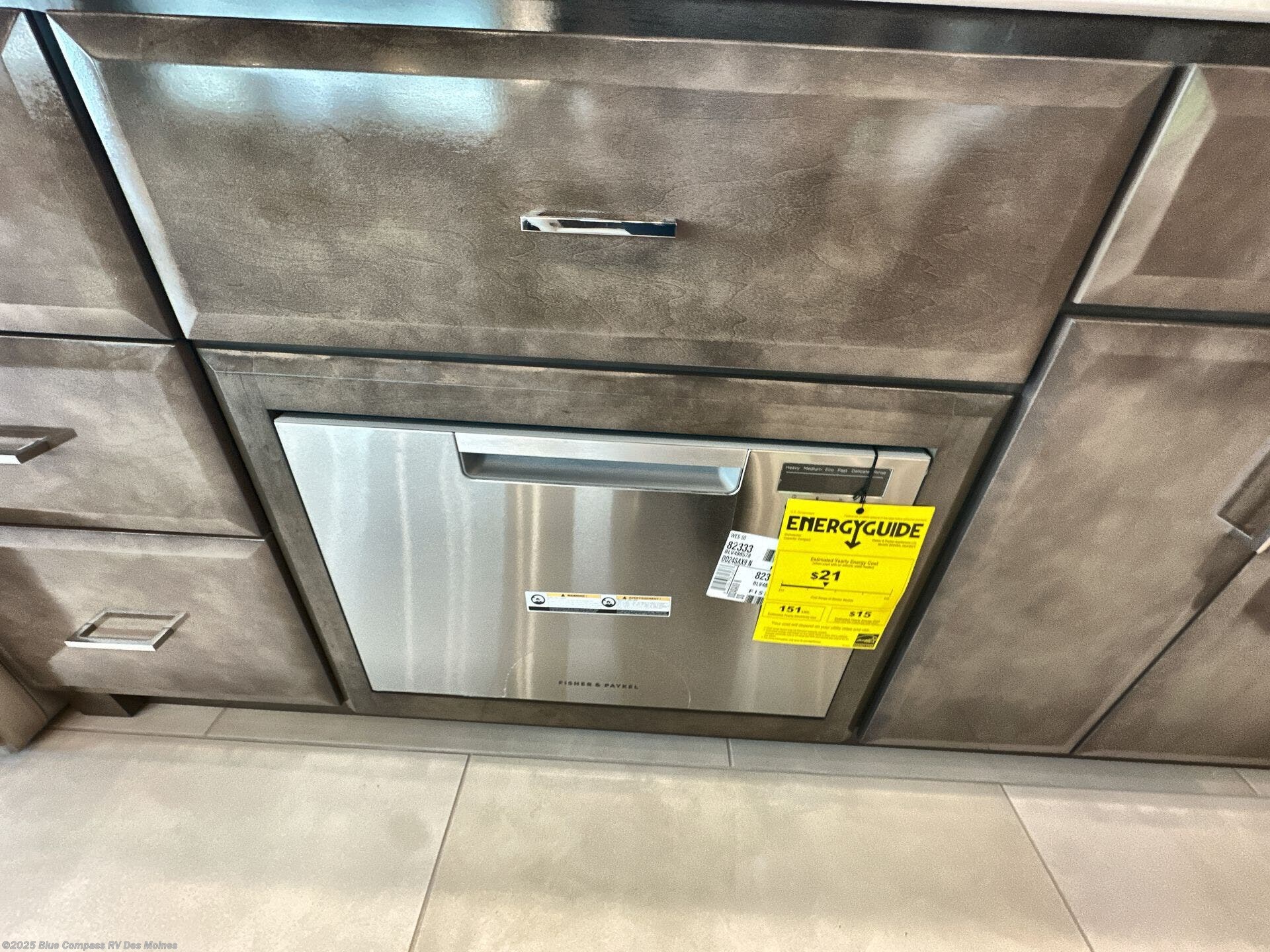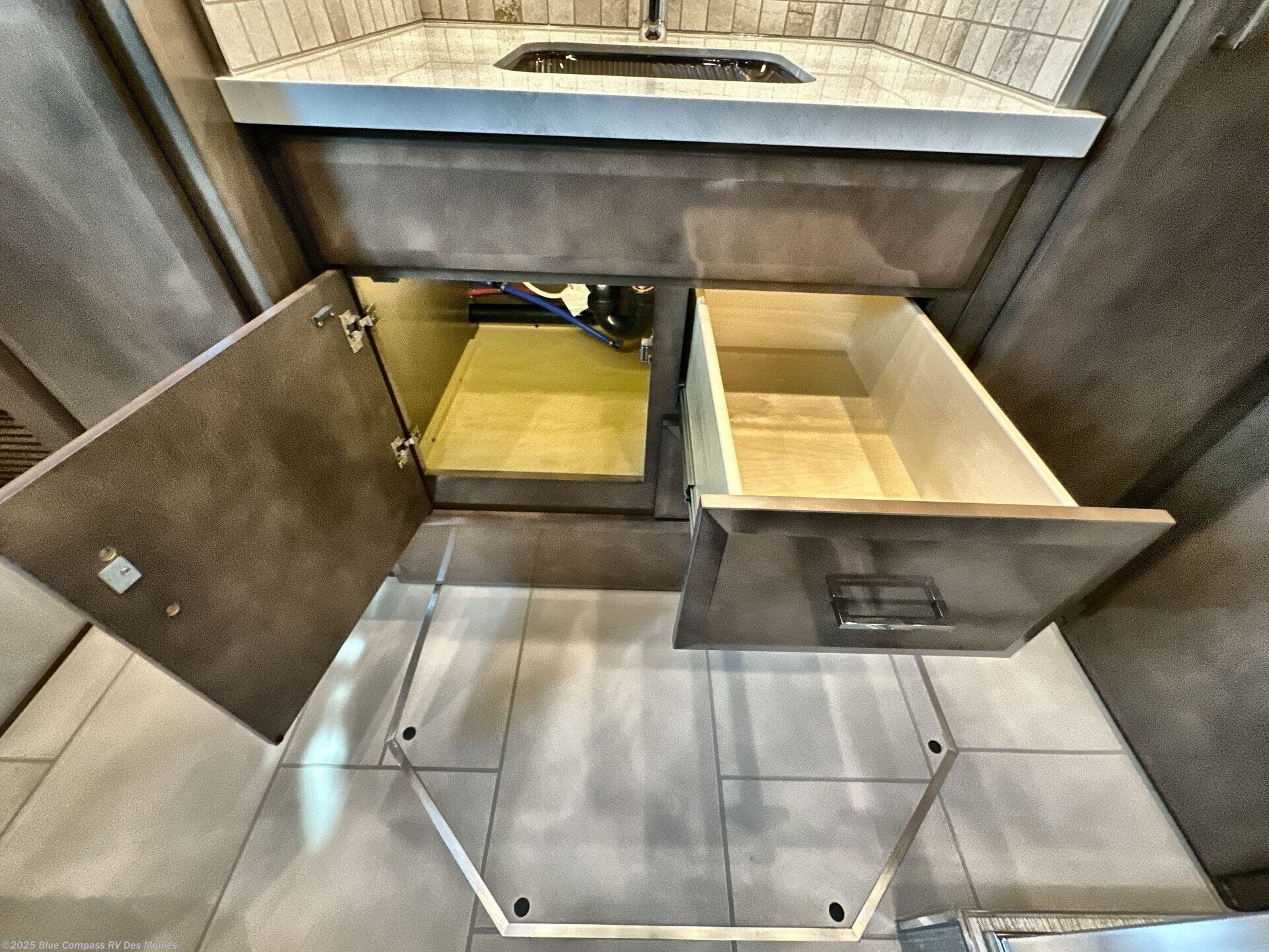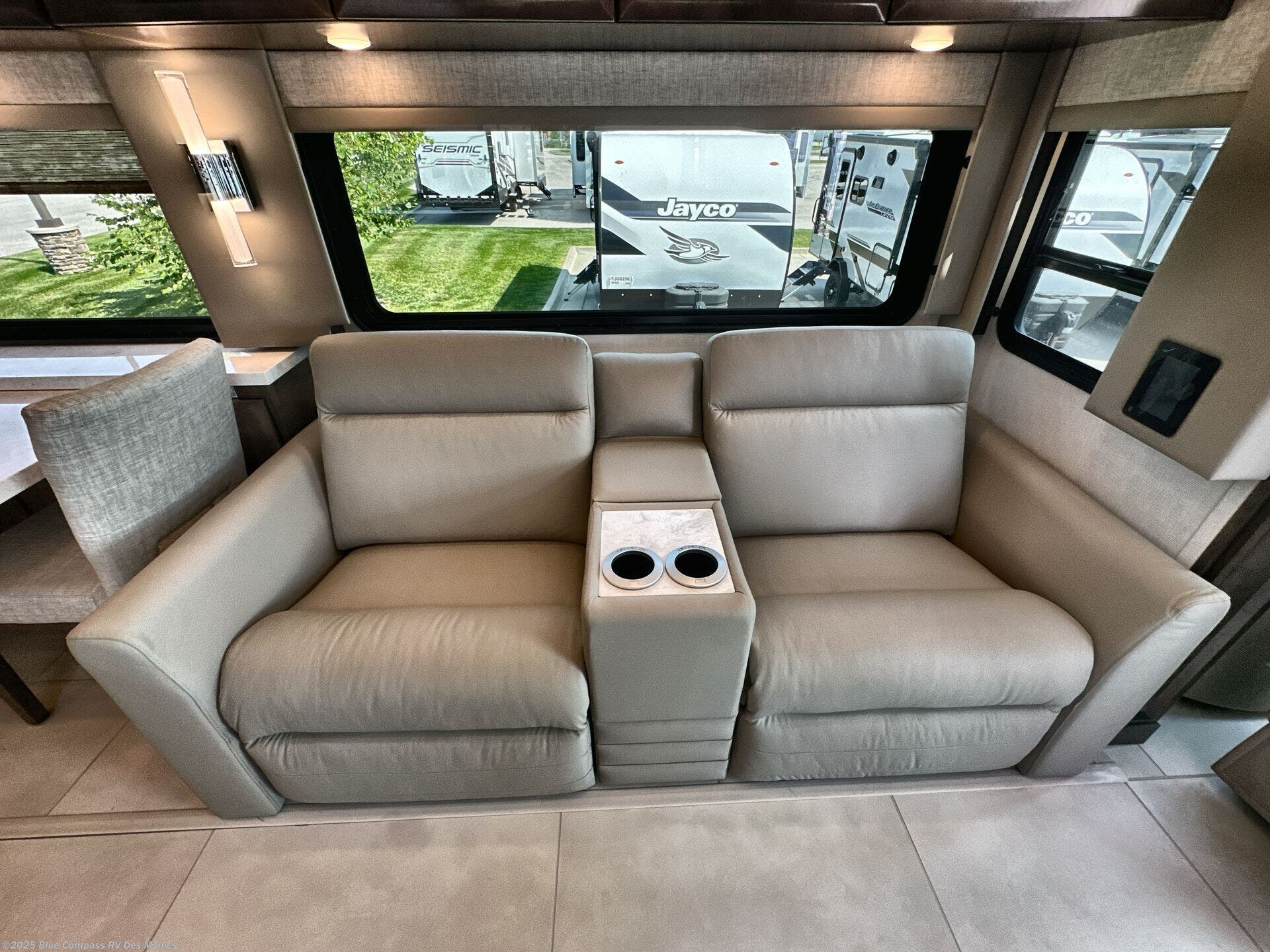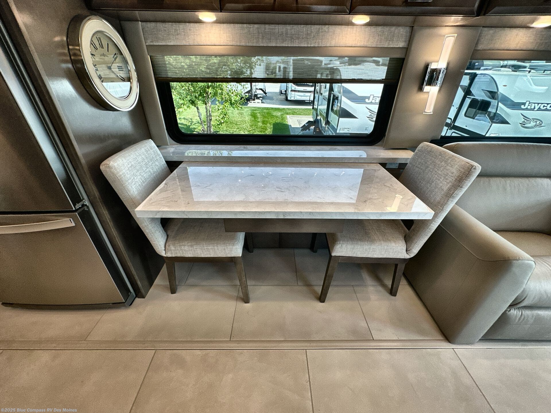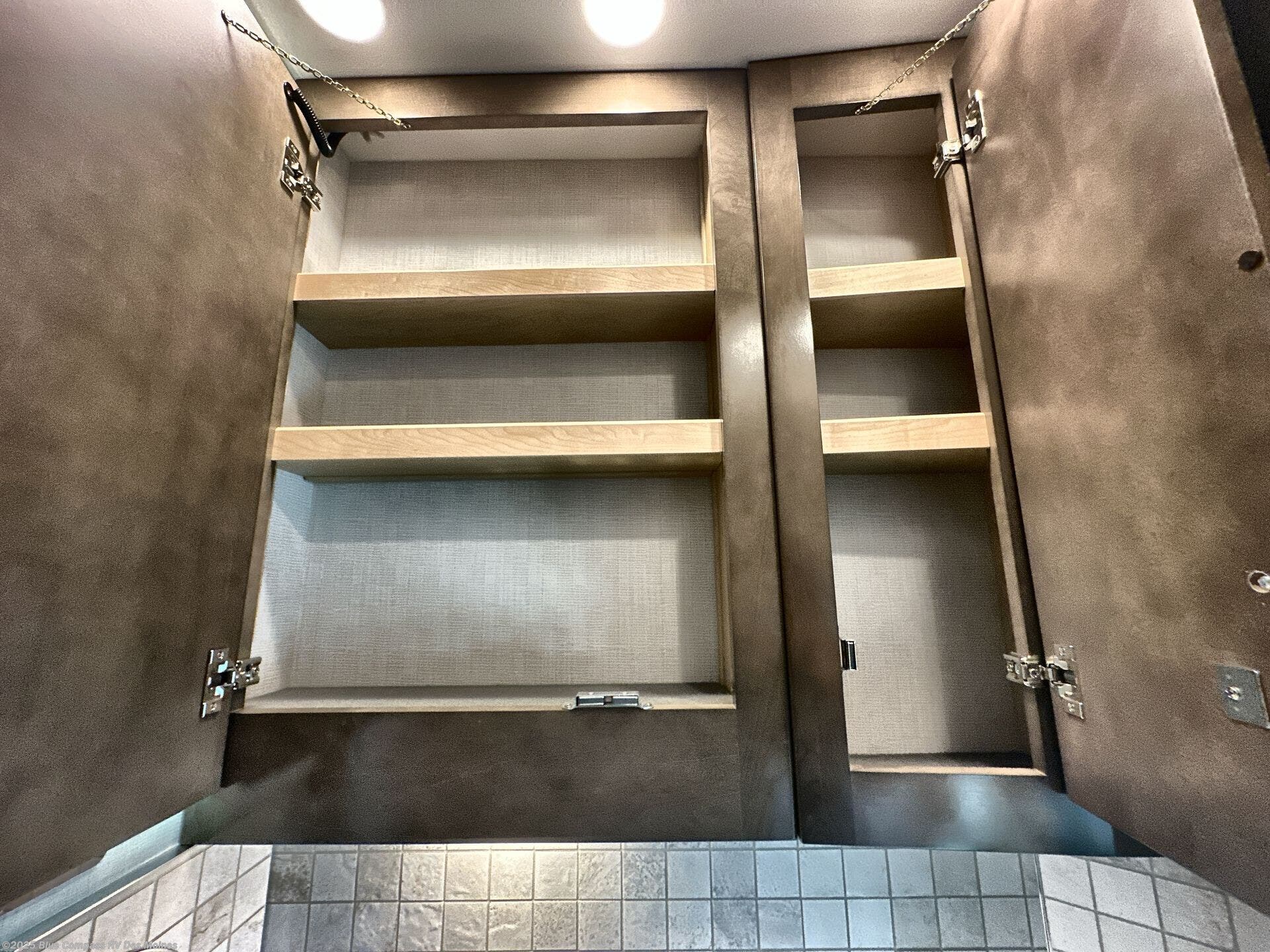 Don't pass up your opportunity to travel in pure luxury with this motorhome! The master suite has a king bed slide for a good night's rest across from a dresser with a Samsung LED TV and shirt wardrobes on either side. Attached to the bedroom is your very own full rear bathroom which has a 40" x 32" shower with a seat next to a linen closet and wardrobe, as well as a Splendide two-piece washer and dryer next to the vanity sink. The chef will have everything they need to prepare delicious home cooked meals including a cabinet pull-out, a stainless steel 30" convection microwave with air fryer feature and a Whirlpool 19.7 cu. ft. refrigerator to keep the perishables fresh, plus the half bathroom is by the kitchen for quick bathroom breaks while cooking. Enjoy your meals at the hide-a-leaf dinette and relax on either the 84" hide-a-bed sofa or the 62" jackknife sofa while watching your favorite movies on the Samsung LED TV on power lift!