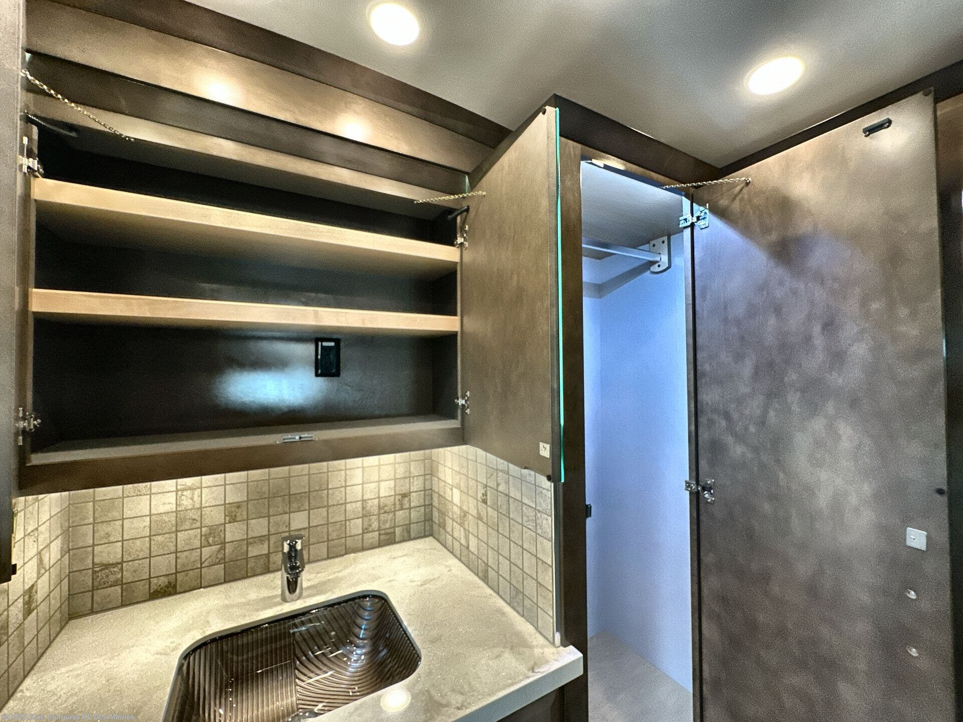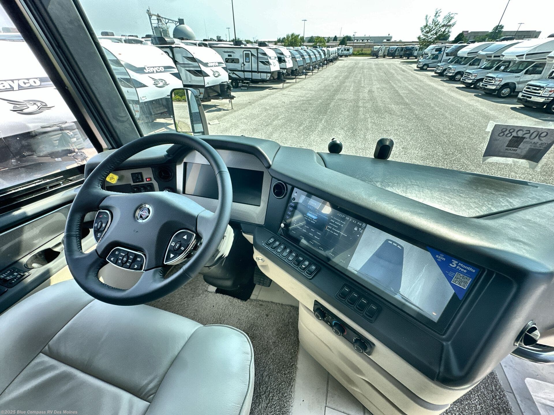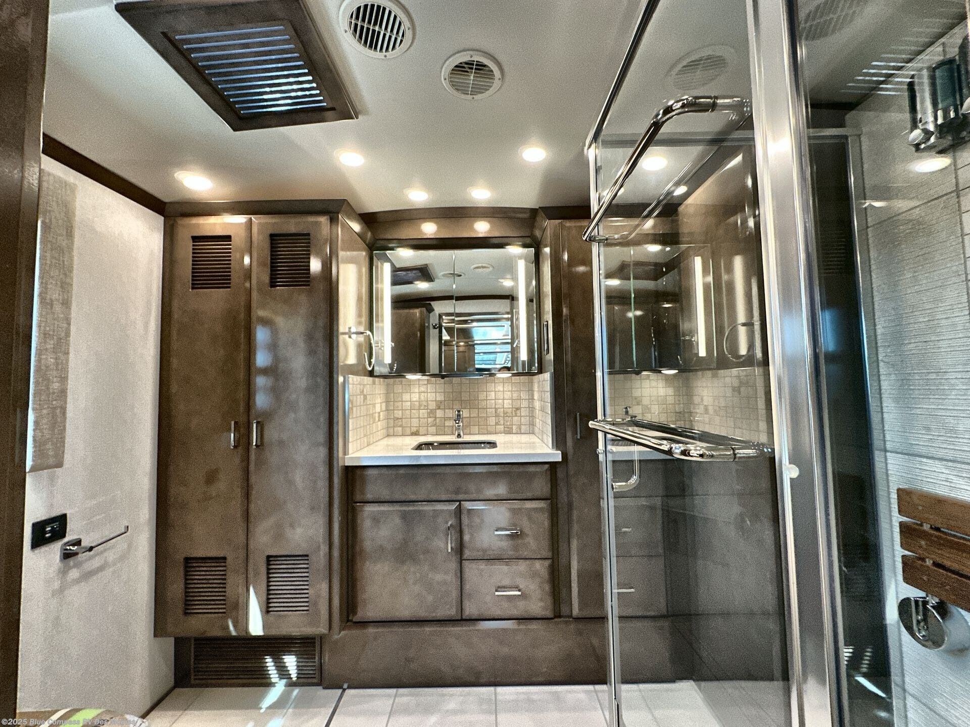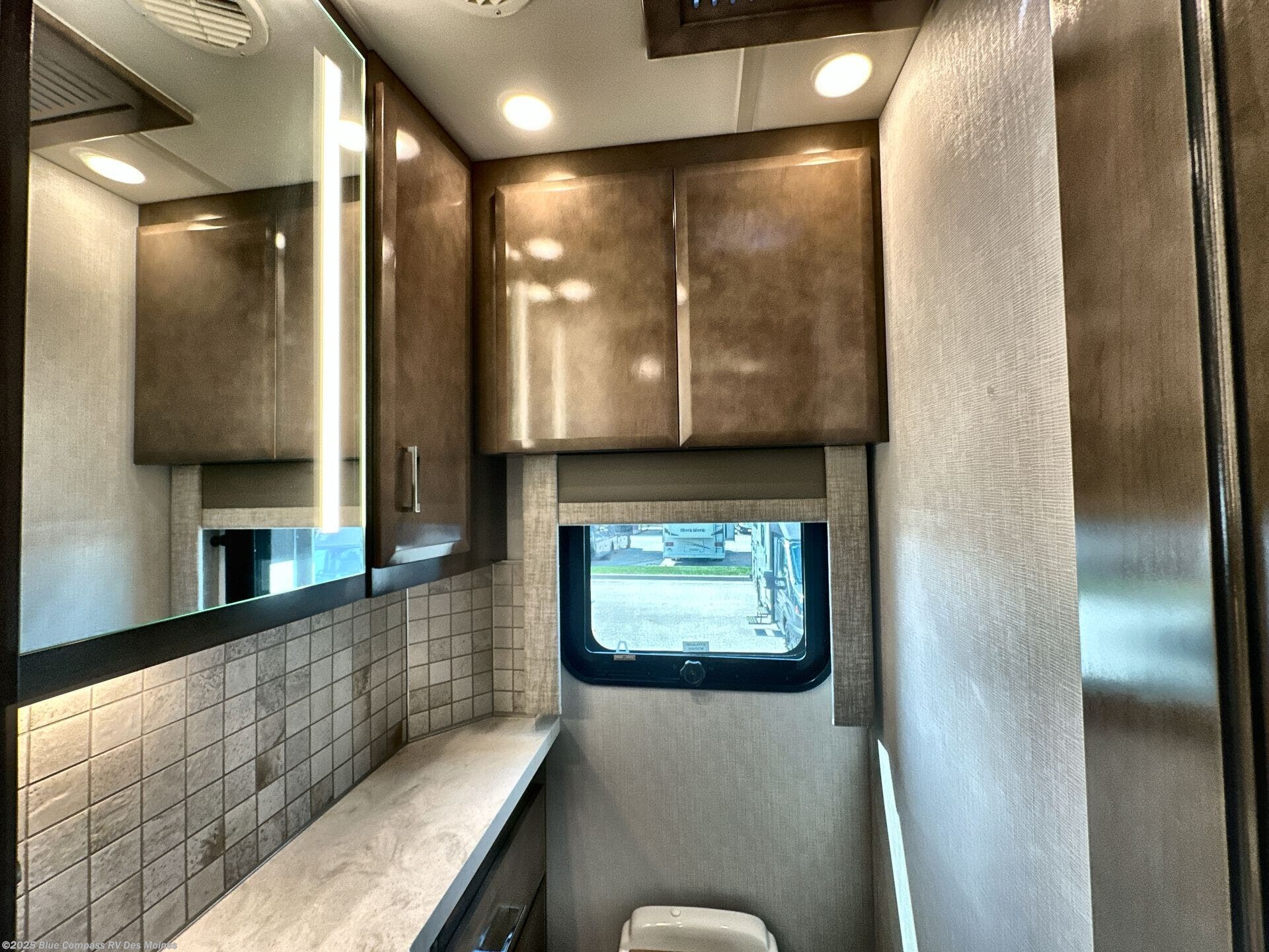 Don't pass up your opportunity to travel in pure luxury with this motorhome! The master suite has a king bed slide for a good night's rest across from a dresser with a Samsung LED TV and shirt wardrobes on either side. Attached to the bedroom is your very own full rear bathroom which has a 40" x 32" shower with a seat next to a linen closet and wardrobe, as well as a Splendide two-piece washer and dryer next to the vanity sink. The chef will have everything they need to prepare delicious home cooked meals including a cabinet pull-out, a stainless steel 30" convection microwave with air fryer feature and a Whirlpool 19.7 cu. ft. refrigerator to keep the perishables fresh, plus the half bathroom is by the kitchen for quick bathroom breaks while cooking. Enjoy your meals at the hide-a-leaf dinette and relax on either the 84" hide-a-bed sofa or the 62" jackknife sofa while watching your favorite movies on the Samsung LED TV on power lift!