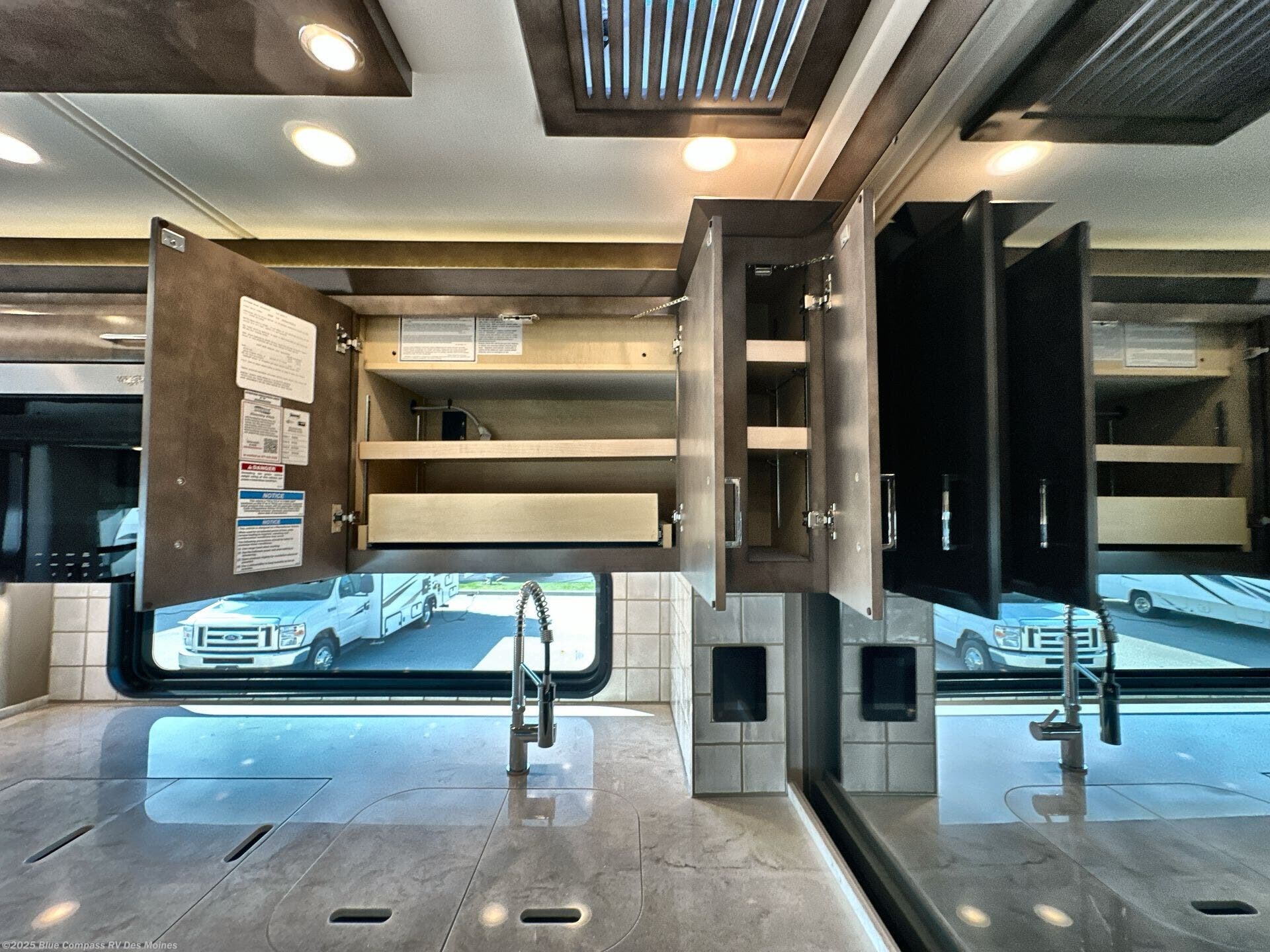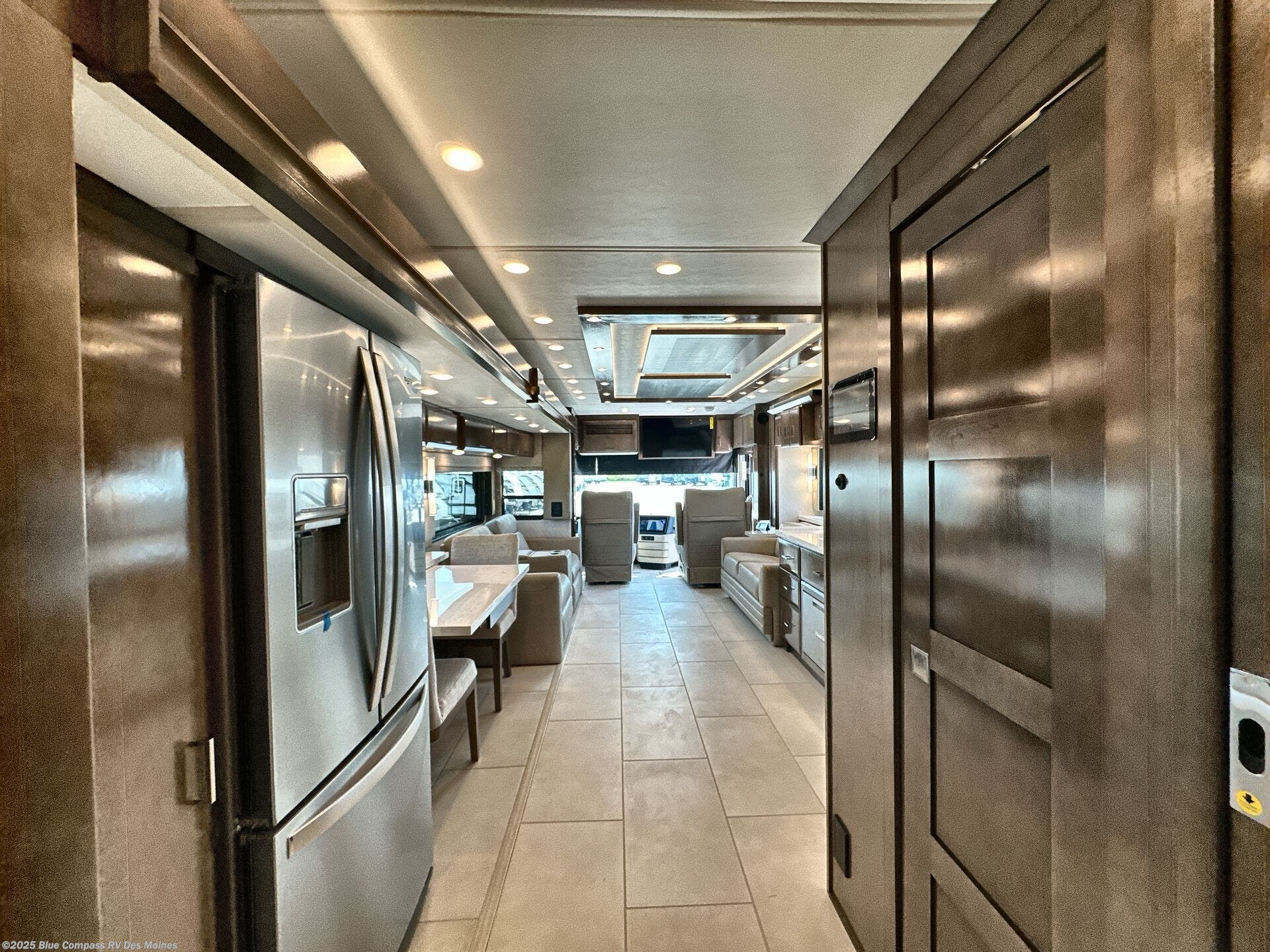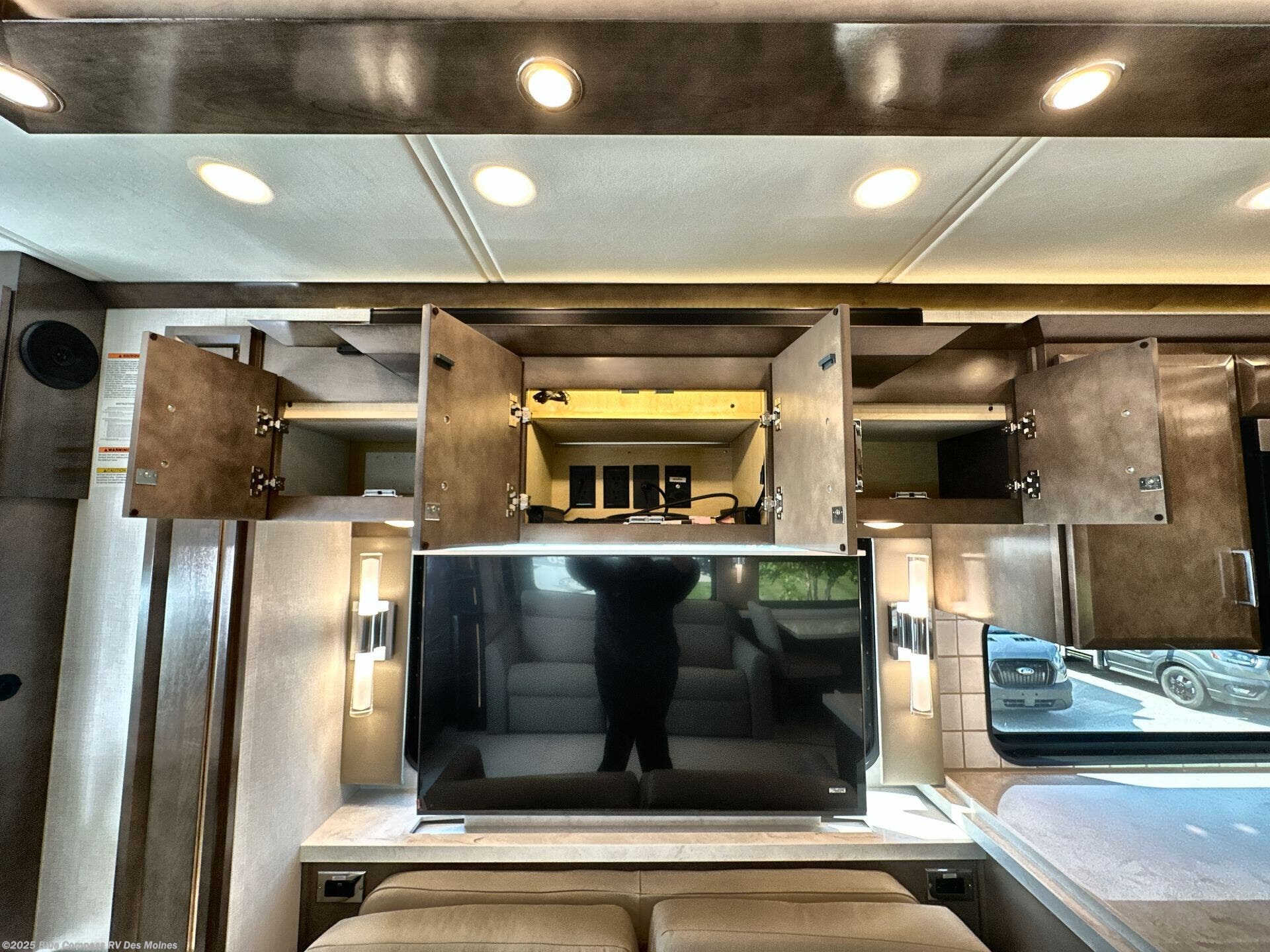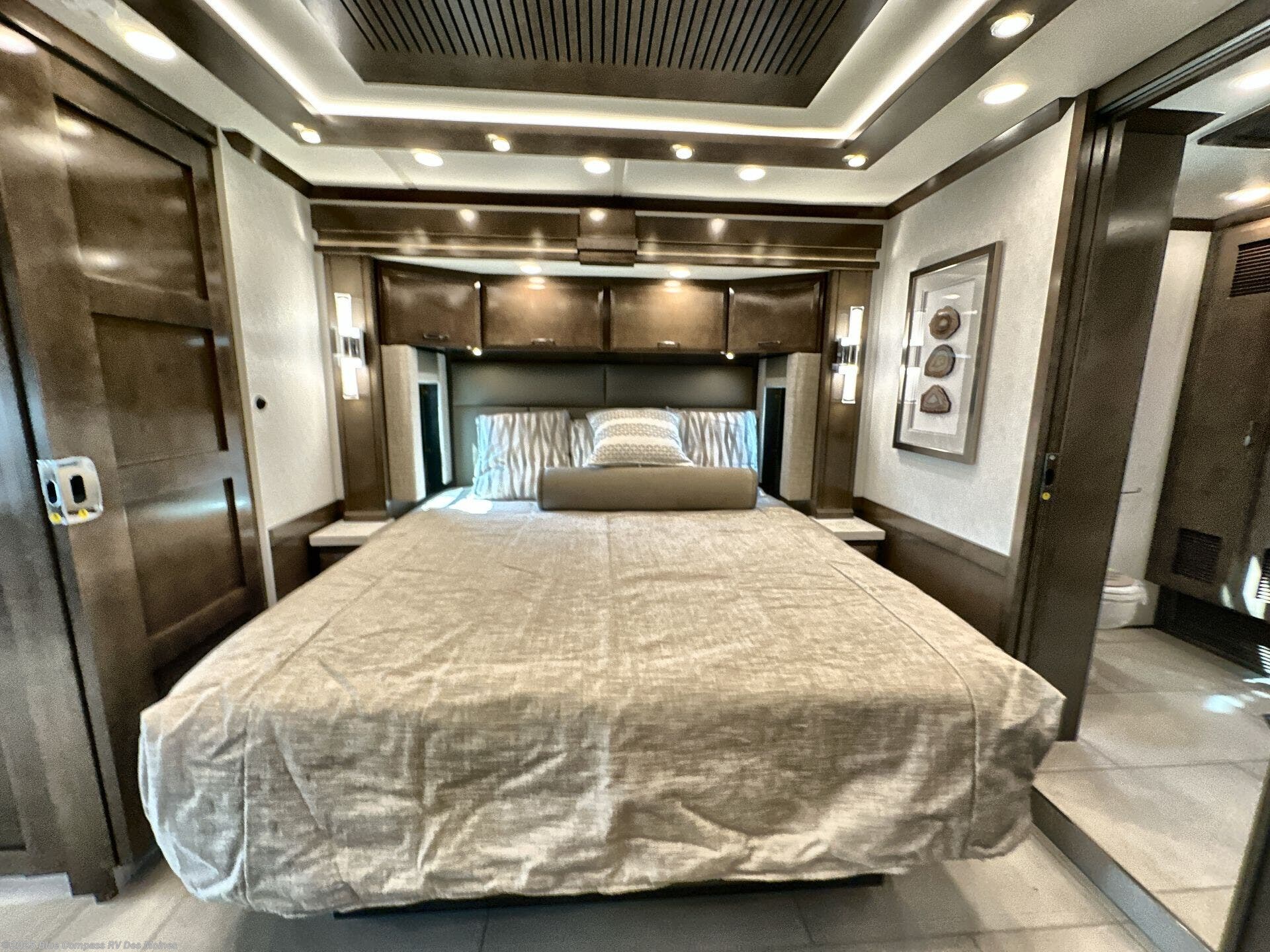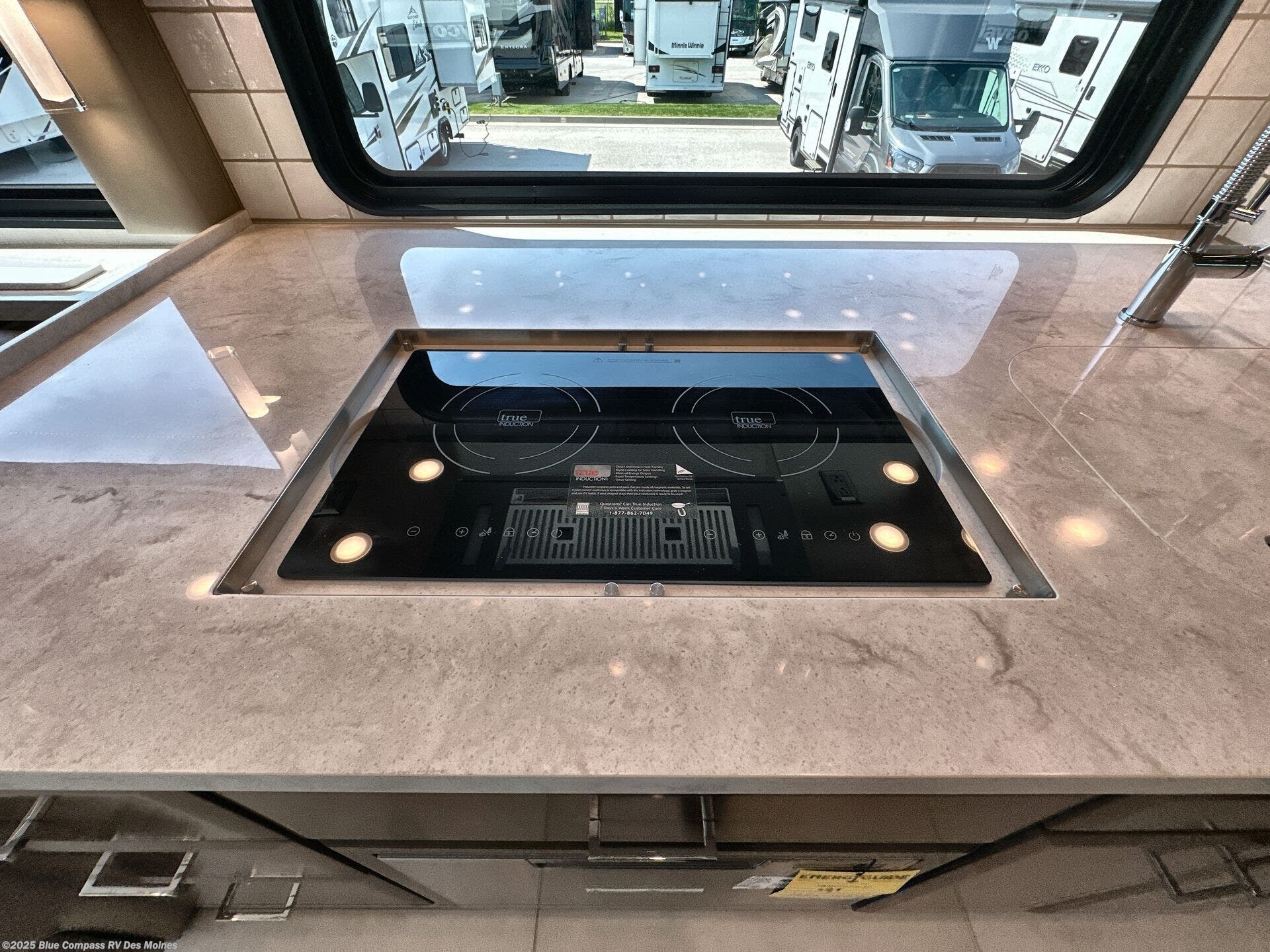 Don't pass up your opportunity to travel in pure luxury with this motorhome! The master suite has a king bed slide for a good night's rest across from a dresser with a Samsung LED TV and shirt wardrobes on either side. Attached to the bedroom is your very own full rear bathroom which has a 40" x 32" shower with a seat next to a linen closet and wardrobe, as well as a Splendide two-piece washer and dryer next to the vanity sink. The chef will have everything they need to prepare delicious home cooked meals including a cabinet pull-out, a stainless steel 30" convection microwave with air fryer feature and a Whirlpool 19.7 cu. ft. refrigerator to keep the perishables fresh, plus the half bathroom is by the kitchen for quick bathroom breaks while cooking. Enjoy your meals at the hide-a-leaf dinette and relax on either the 84" hide-a-bed sofa or the 62" jackknife sofa while watching your favorite movies on the Samsung LED TV on power lift!