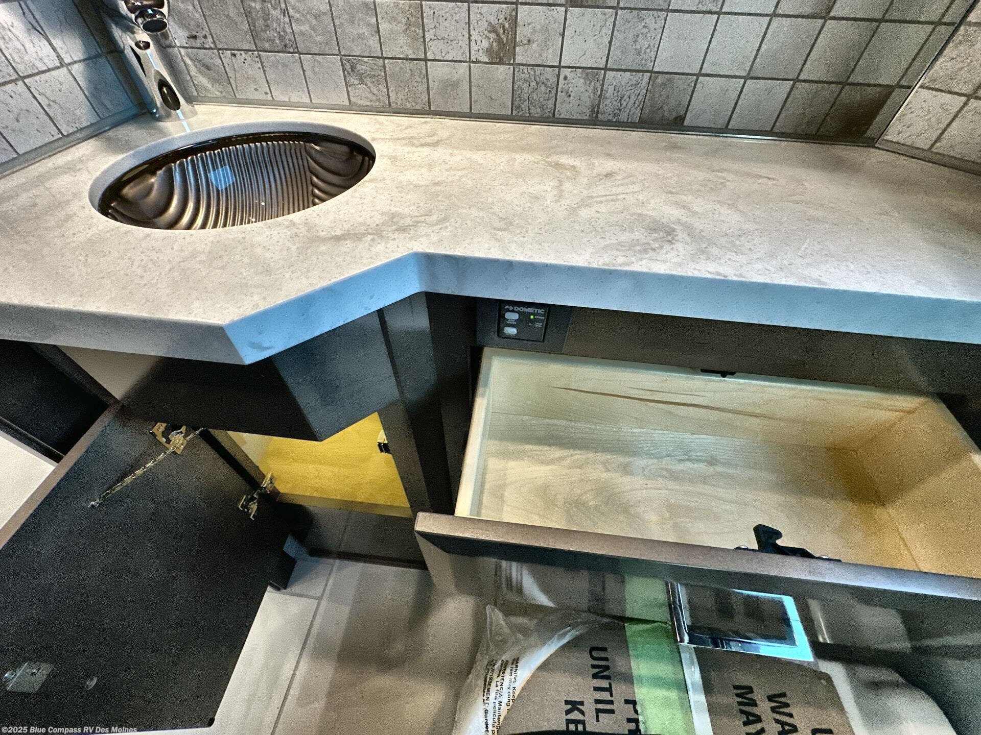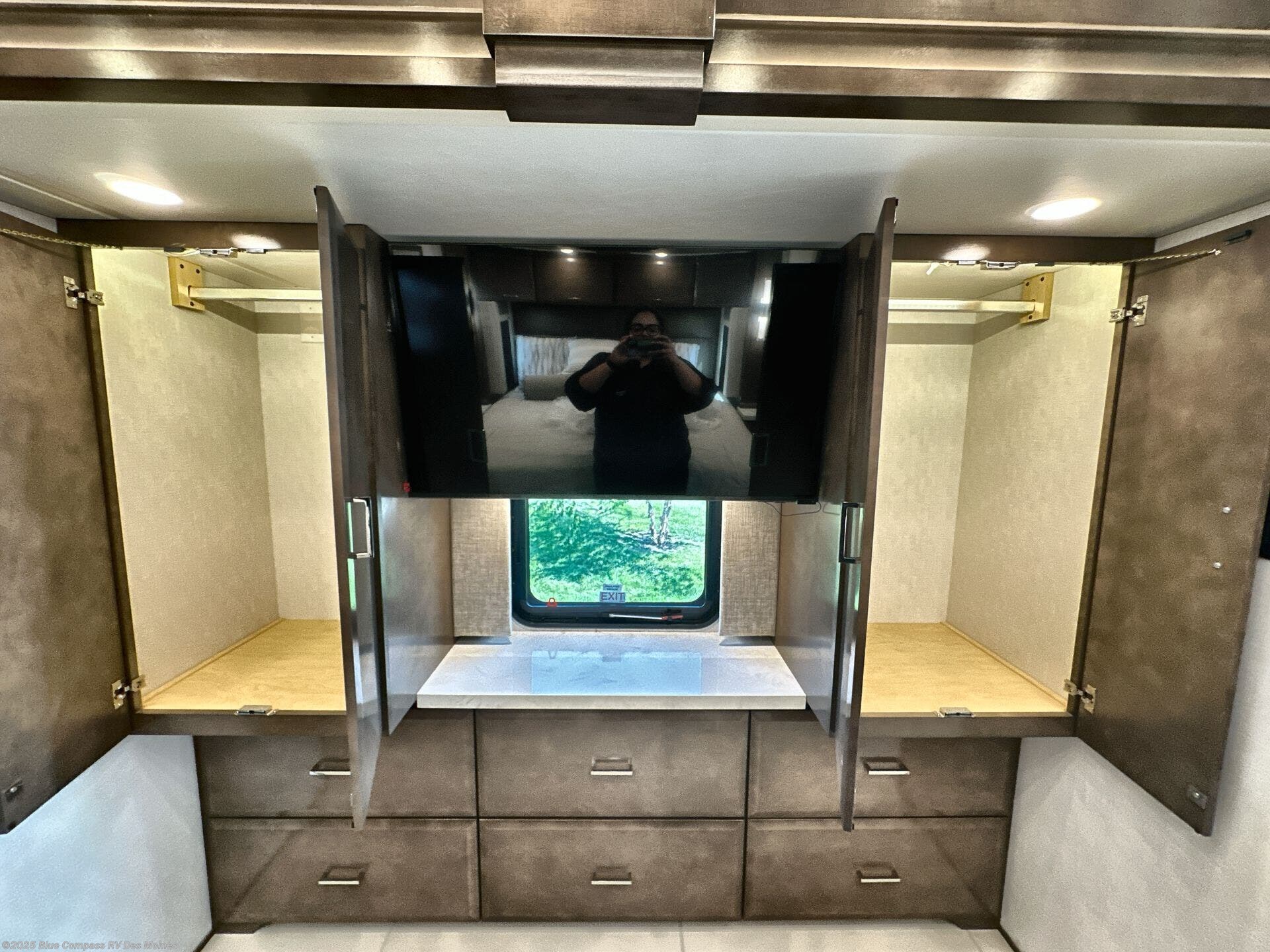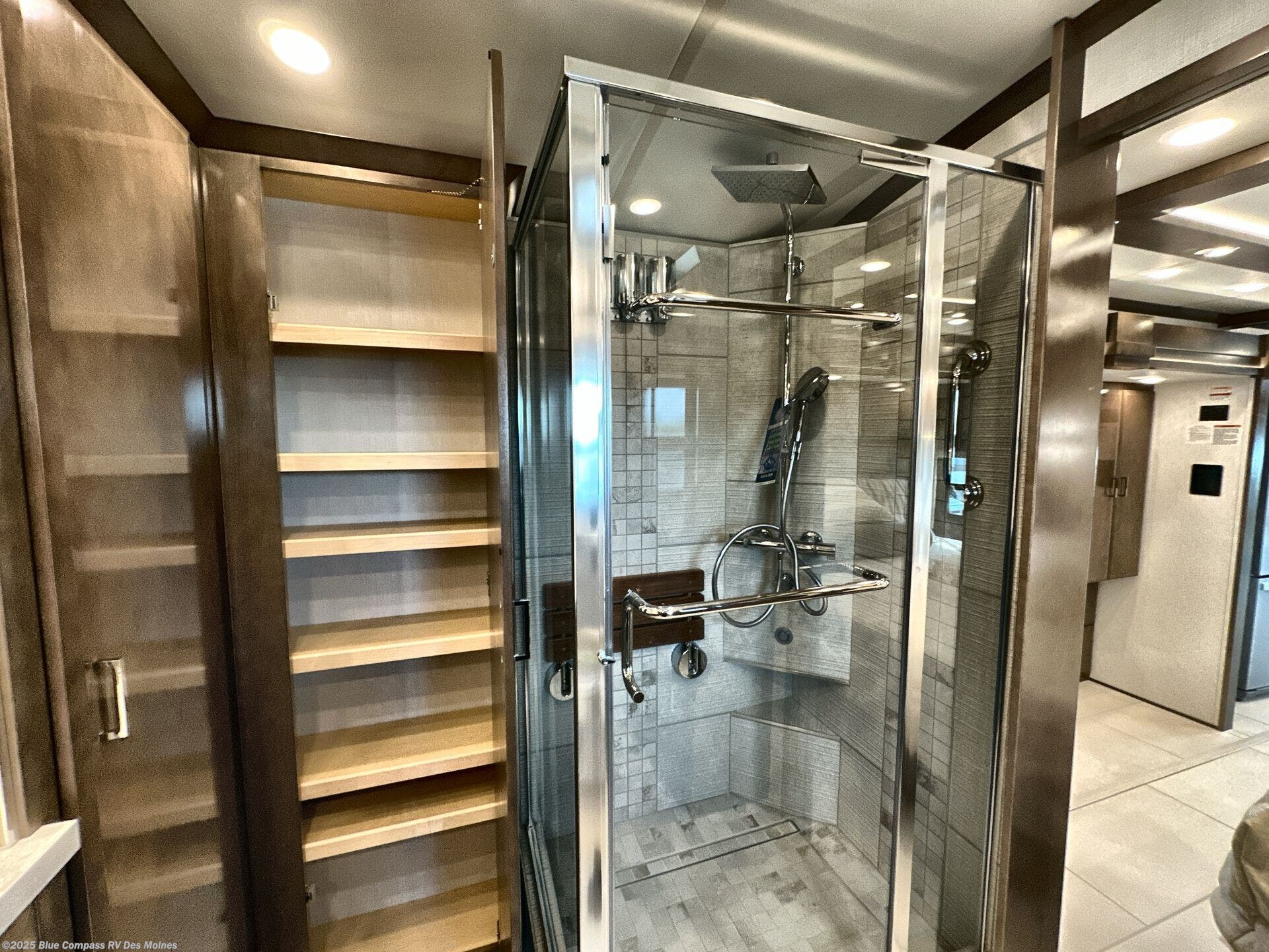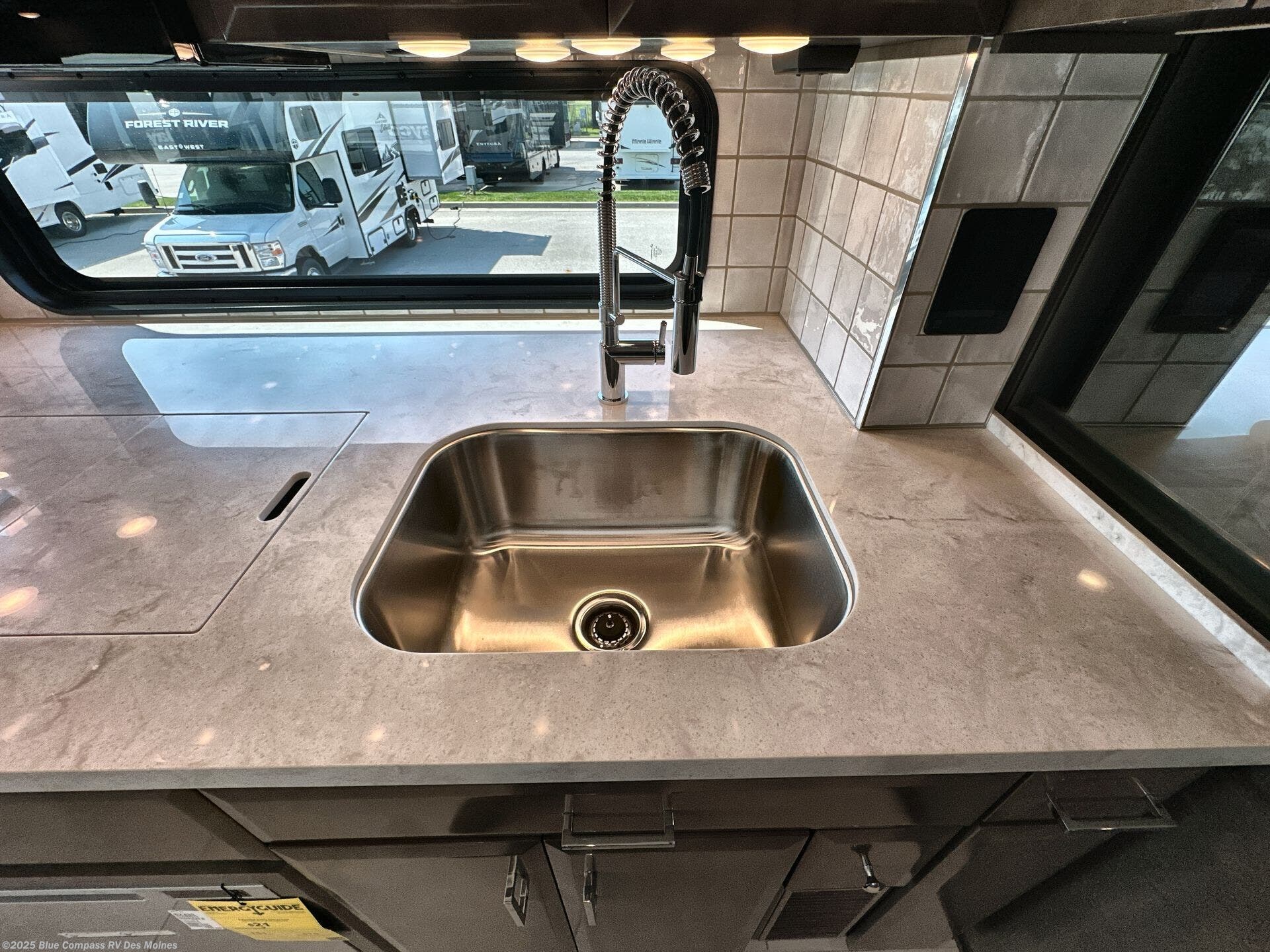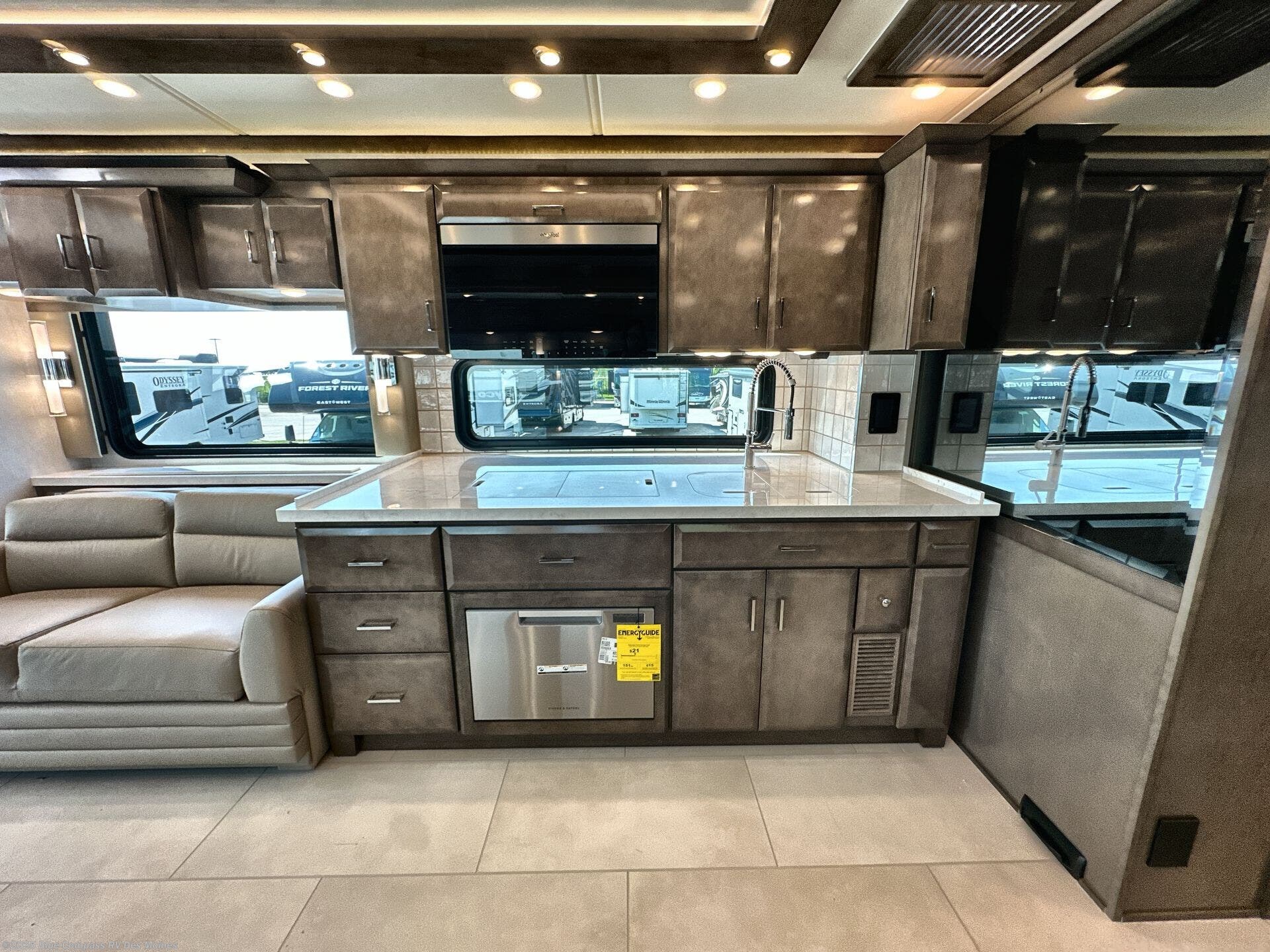Don't pass up your opportunity to travel in pure luxury with this motorhome! The master suite has a king bed slide for a good night's rest across from a dresser with a Samsung LED TV and shirt wardrobes on either side. Attached to the bedroom is your very own full rear bathroom which has a 40" x 32" shower with a seat next to a linen closet and wardrobe, as well as a Splendide two-piece washer and dryer next to the vanity sink. The chef will have everything they need to prepare delicious home cooked meals including a cabinet pull-out, a stainless steel 30" convection microwave with air fryer feature and a Whirlpool 19.7 cu. ft. refrigerator to keep the perishables fresh, plus the half bathroom is by the kitchen for quick bathroom breaks while cooking. Enjoy your meals at the hide-a-leaf dinette and relax on either the 84" hide-a-bed sofa or the 62" jackknife sofa while watching your favorite movies on the Samsung LED TV on power lift!