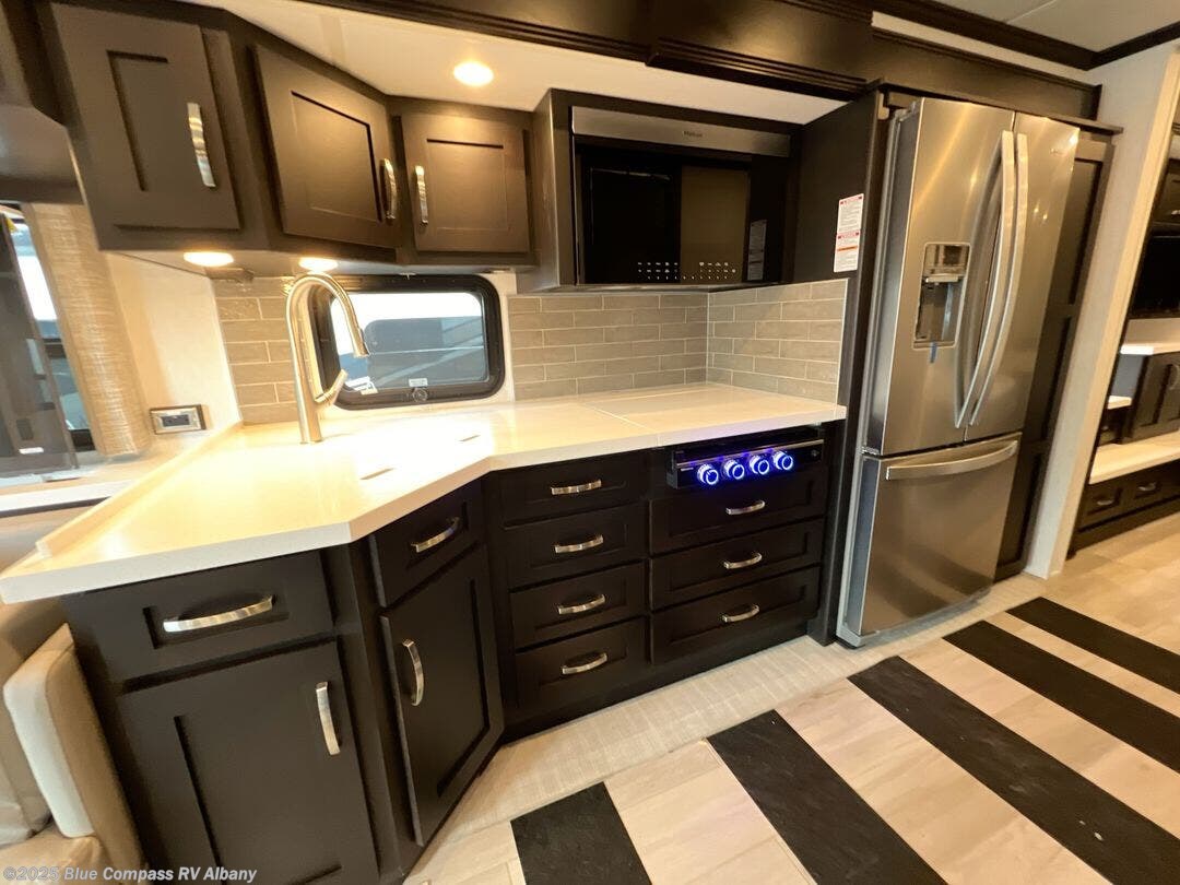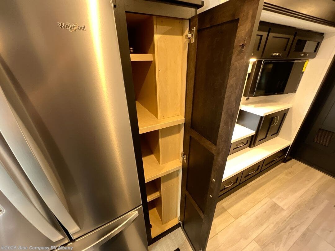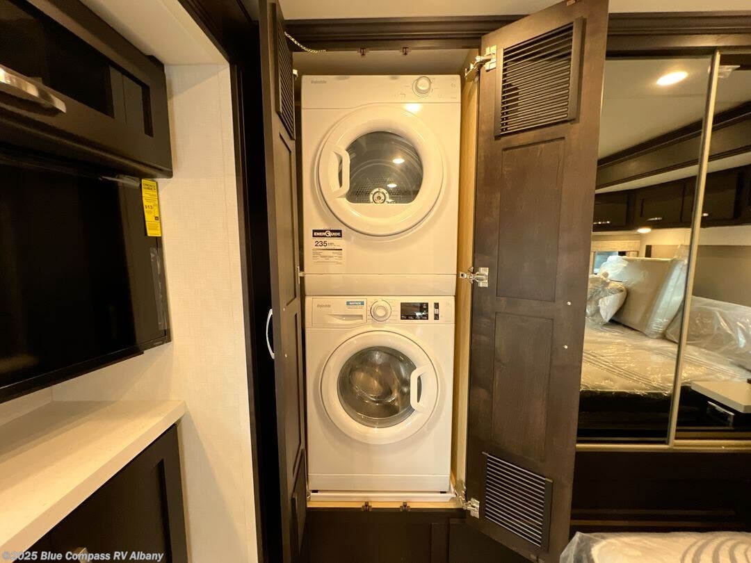 Pack your bags for an extended vacation in this four slide out coach! Once you've parked for the day, you can make lunch in the full kitchen that includes a 30" stainless steel convection microwave with a three burner cooktop and an air fryer feature. There is a 10 cu. ft. Norcold refrigerator and pantry to store your food, plus a booth dinette where you can dine together. A Jackknife sofa provides more seating space, or you may just find yourselves outdoors under the Carefree Travel'r awning. The mid-coach full bath will be easily accessible for everyone to use, and the rear private bedroom provides you with your own space at night. Here, you'll enjoy a queen bed slide out with overhead storage, a dresser with a Samsung LED TV, plus a wardrobe with sliding mirror doors. There is even a second wardrobe with an optional Splendide two-piece stacked washer and dryer if you plan to go full-time!