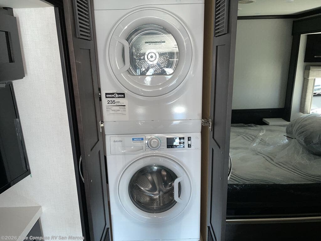 Pack your bags for an extended vacation in this four slide out coach! Once you've parked for the day, you can make lunch in the full kitchen that includes a 30" stainless steel convection microwave with a three burner cooktop and an air fryer feature. There is a 10 cu. ft. Norcold refrigerator and pantry to store your food, plus a booth dinette where you can dine together. A Jackknife sofa provides more seating space, or you may just find yourselves outdoors under the Carefree Travel'r awning. The mid-coach full bath will be easily accessible for everyone to use, and the rear private bedroom provides you with your own space at night. Here, you'll enjoy a queen bed slide out with overhead storage, a dresser with a Samsung LED TV, plus a wardrobe with sliding mirror doors. There is even a second wardrobe with an optional Splendide two-piece stacked washer and dryer if you plan to go full-time!