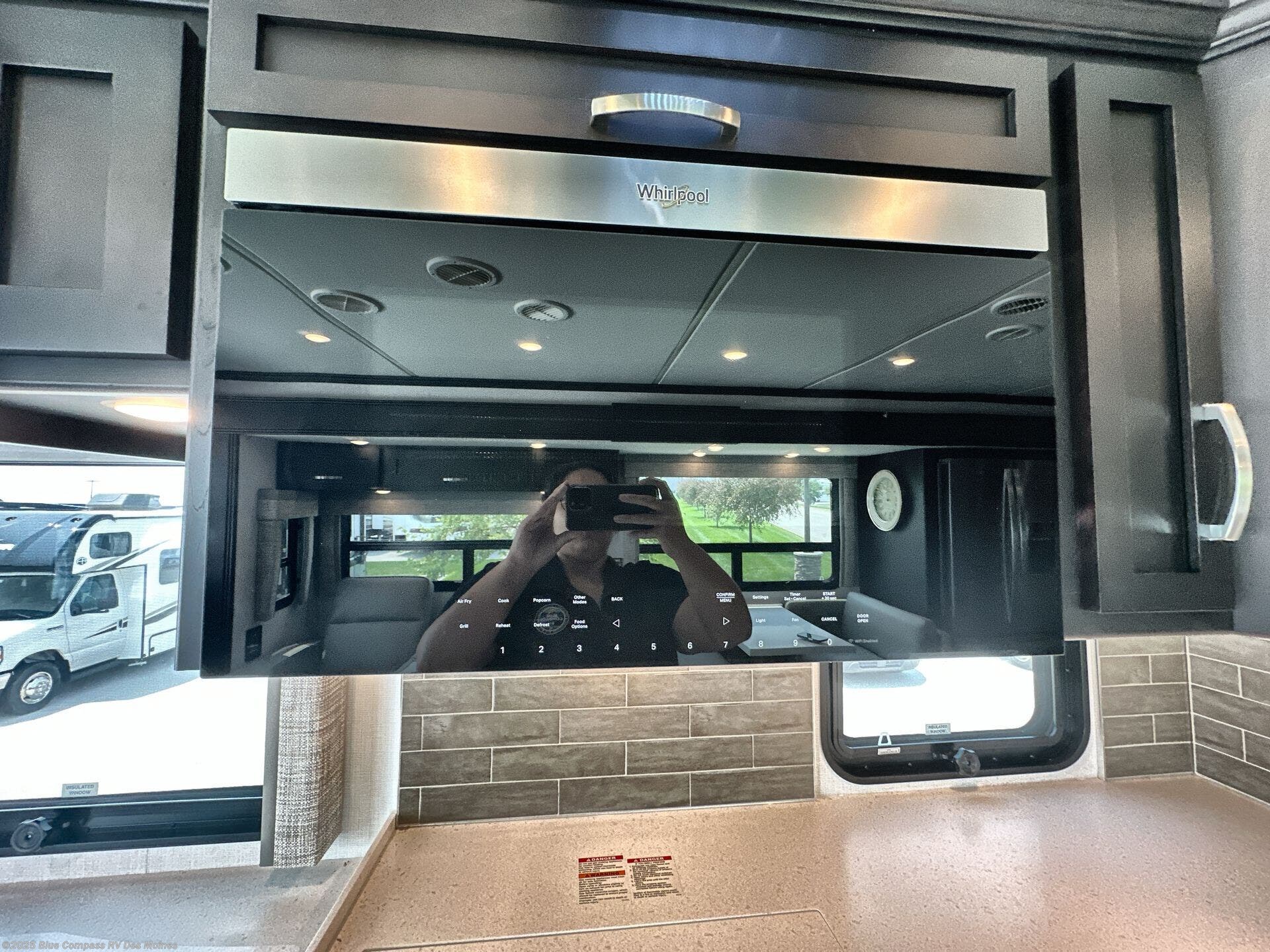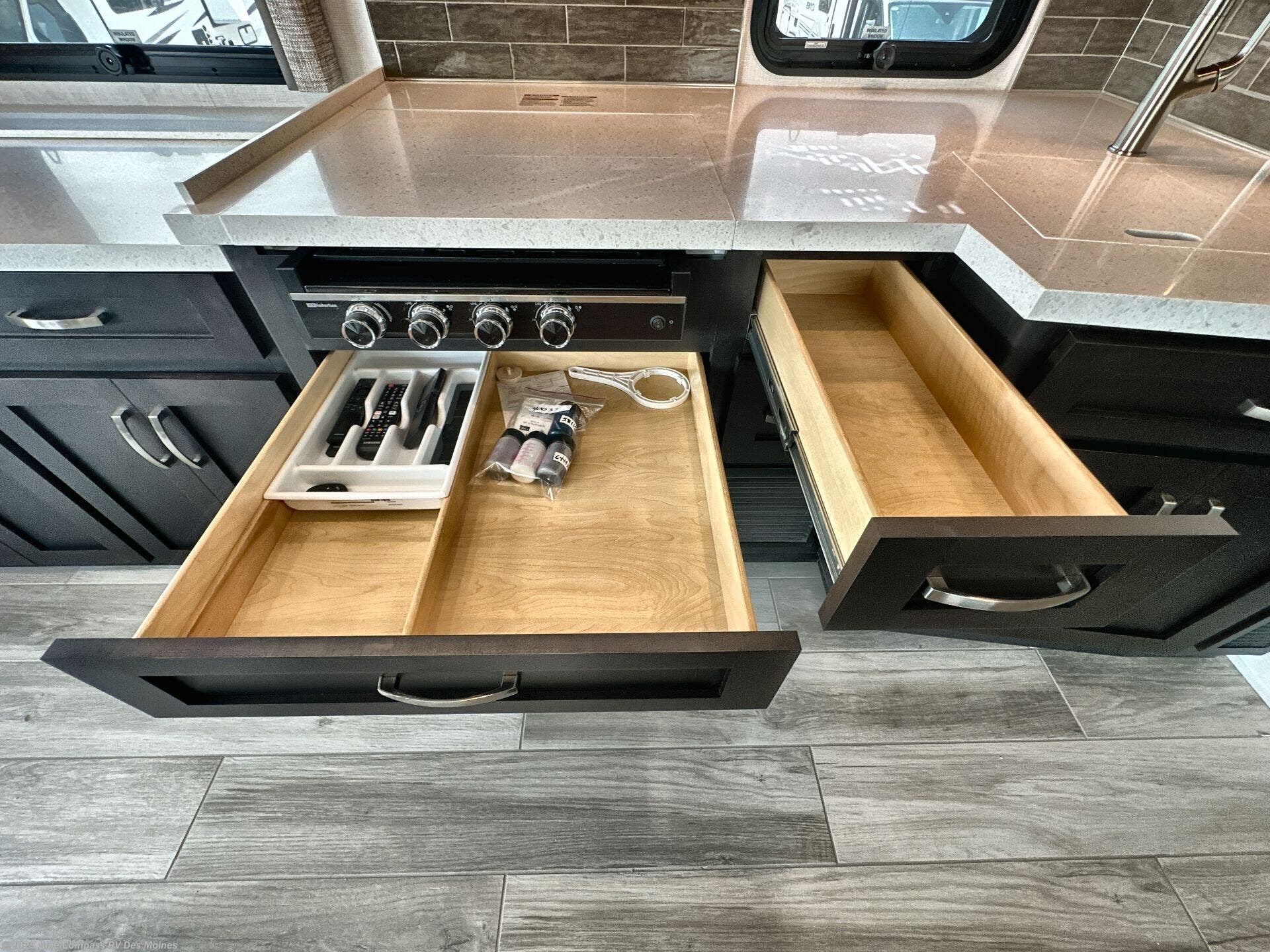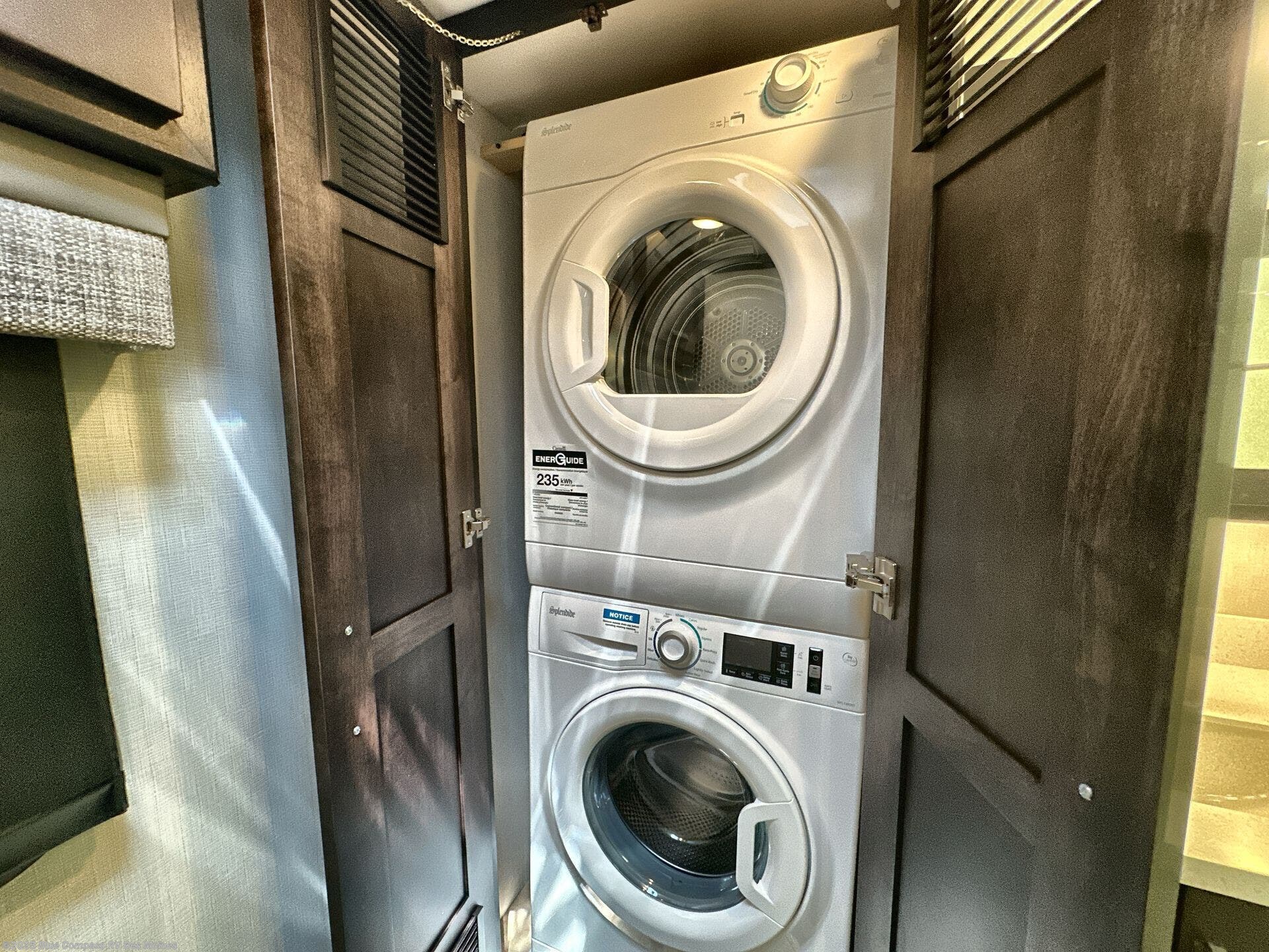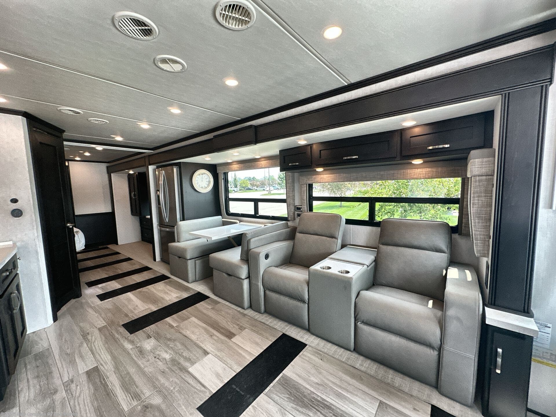You will be met with comfort when you travel in this triple slide out coach! The main living area includes a Jackknife sofa and booth dinette across from a Samsung LED TV on power lift so you can enjoy movie nights. A full kitchen is waiting for you to create delicious meals on the three burner cooktop or in the convection microwave. There is also an air fryer feature you are sure to enjoy plus a 10 cu. ft. Norcold refrigerator and a pantry to keep food stocked. You will love having your own master bedroom that includes a king bed slide out, dual shirt wardrobes and a dresser, plus a Samsung LED TV. The full rear bath is both spacious and accommodating with its 50" x 30" shower plus optional washer and dryer, and your guests can use the mid-coach half bath during the day!