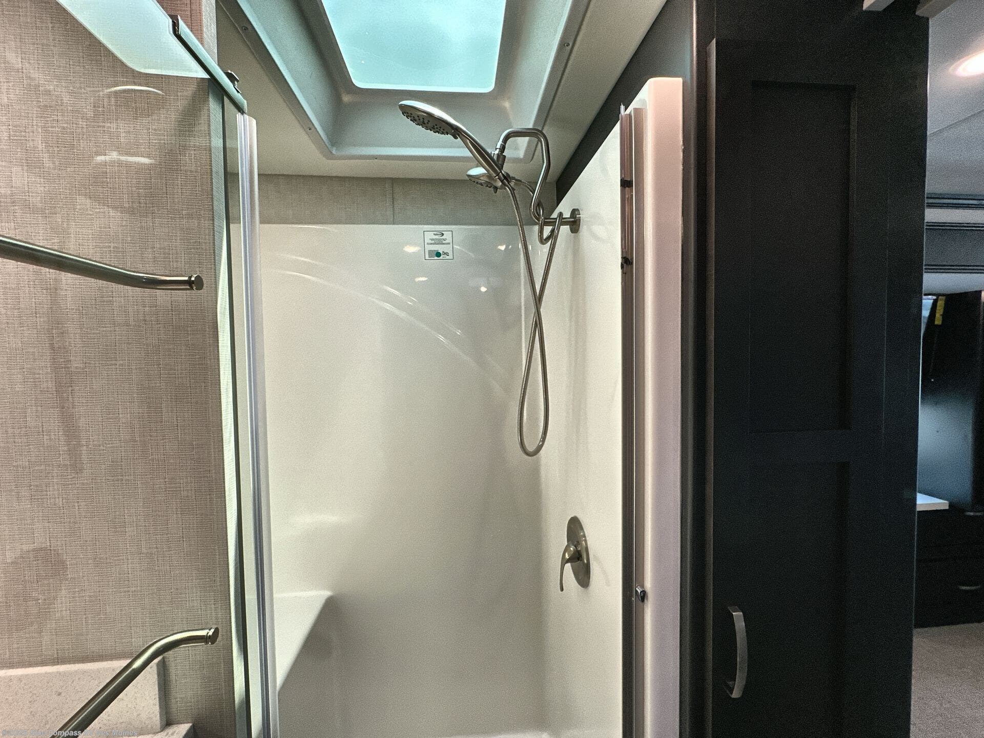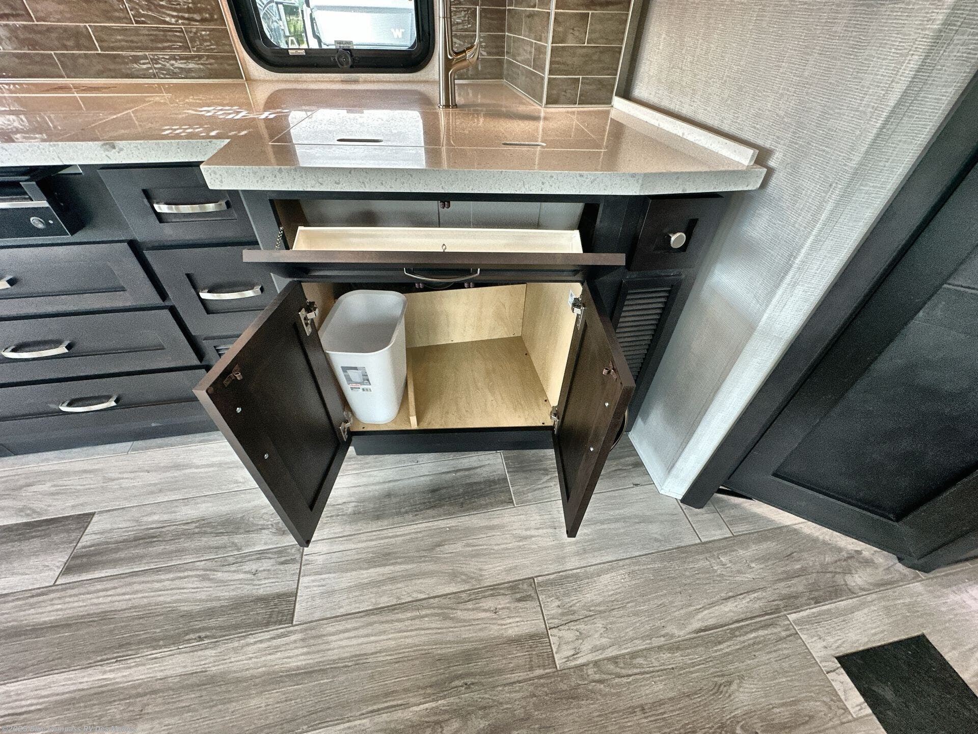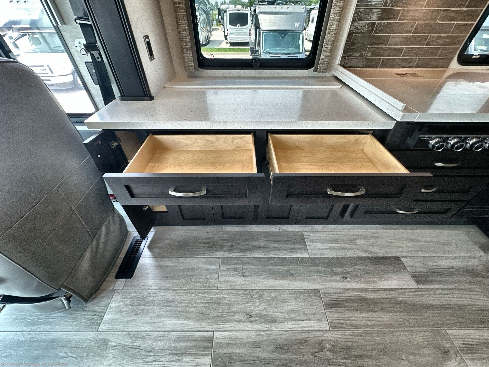 You will be met with comfort when you travel in this triple slide out coach! The main living area includes a Jackknife sofa and booth dinette across from a Samsung LED TV on power lift so you can enjoy movie nights. A full kitchen is waiting for you to create delicious meals on the three burner cooktop or in the convection microwave. There is also an air fryer feature you are sure to enjoy plus a 10 cu. ft. Norcold refrigerator and a pantry to keep food stocked. You will love having your own master bedroom that includes a king bed slide out, dual shirt wardrobes and a dresser, plus a Samsung LED TV. The full rear bath is both spacious and accommodating with its 50" x 30" shower plus optional washer and dryer, and your guests can use the mid-coach half bath during the day!