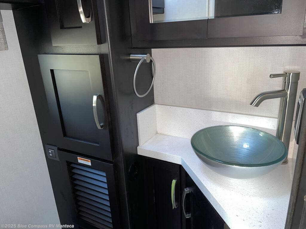 You will be met with comfort when you travel in this triple slide out coach! The main living area includes a Jackknife sofa and booth dinette across from a Samsung LED TV on power lift so you can enjoy movie nights. A full kitchen is waiting for you to create delicious meals on the three burner cooktop or in the convection microwave. There is also an air fryer feature you are sure to enjoy plus a 10 cu. ft. Norcold refrigerator and a pantry to keep food stocked. You will love having your own master bedroom that includes a king bed slide out, dual shirt wardrobes and a dresser, plus a Samsung LED TV. The full rear bath is both spacious and accommodating with its 50" x 30" shower plus optional washer and dryer, and your guests can use the mid-coach half bath during the day!