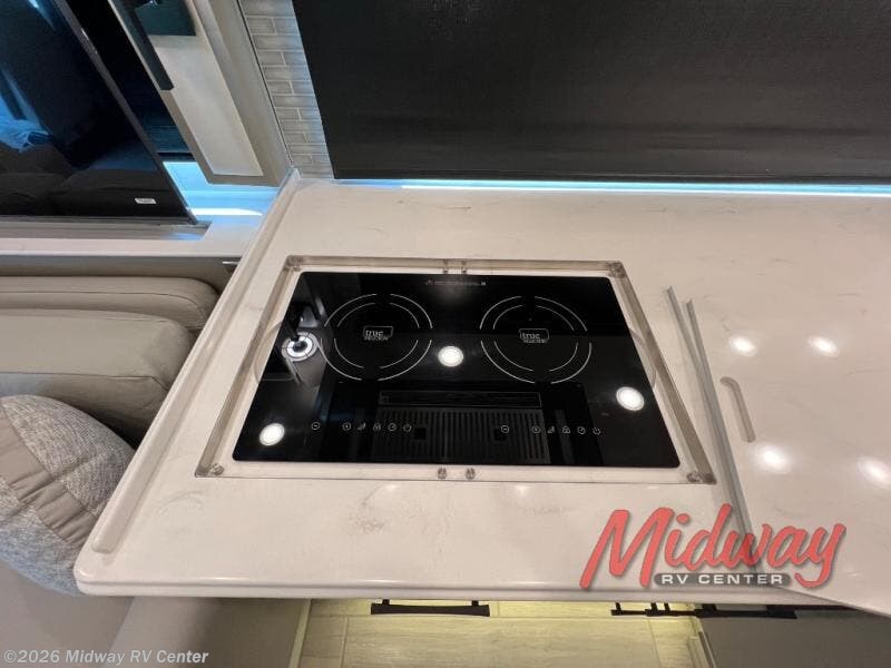 With triple slides including a full-wall slide, this spacious coach will feel just like home! Once you arrive at your destination, lunch can be made on the all-electric induction cooktop or in the stainless steel convection microwave. There is a Euro booth dinette (non-sleeper) where you can dine together, and you'll find additional seating spaces on the hide-a-bed sofa and jack-knife sofa. The mid-coach half bath will be easily accessible to use during the day, and a full rear bath will let you freshen up in the evening. Here, you'll find a 40" x 30" shower with a seat and two wardrobes for towels and clothes. And don't overlook the master bedroom with its retracting king bed slide, dual shirt wardrobes, a dresser, plus a Samsung LED TV to watch movies in bed!
