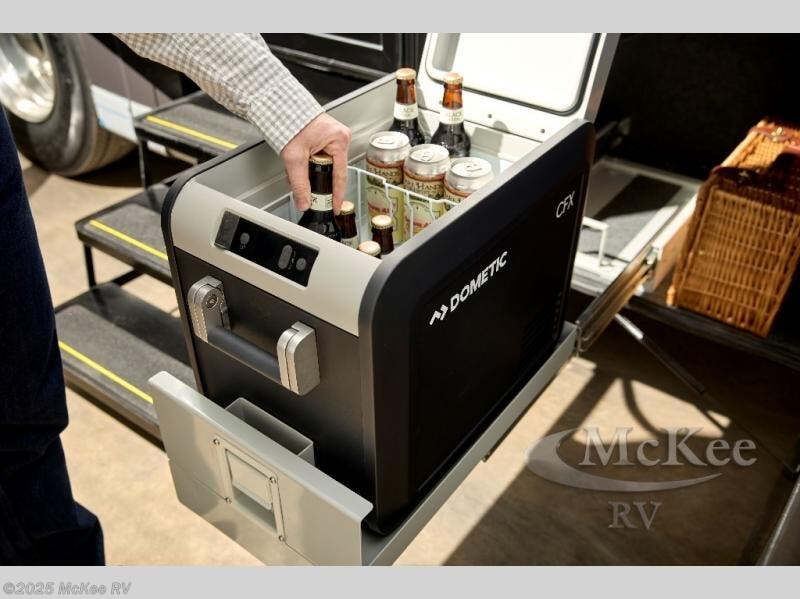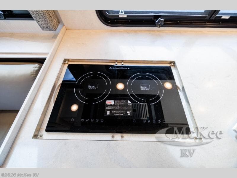 You will feel right at home in this motorhome! The full rear bathroom has a 40" x 32" shower with a seat to freshen up in each morning, a wardrobe and a safe, and a Splendide two-piece stacked washer and dryer. Inside the master suite is a king bed slide for more interior space, a dresser with shirt wardrobes on either side, and a Samsung LED TV. The half bathroom is conveniently next to the kitchen so you can get back to preparing dinner on the all electric flush mount induction cooktop. The hide-a-leaf dinette is a comfortable place to enjoy meals and play card games.
