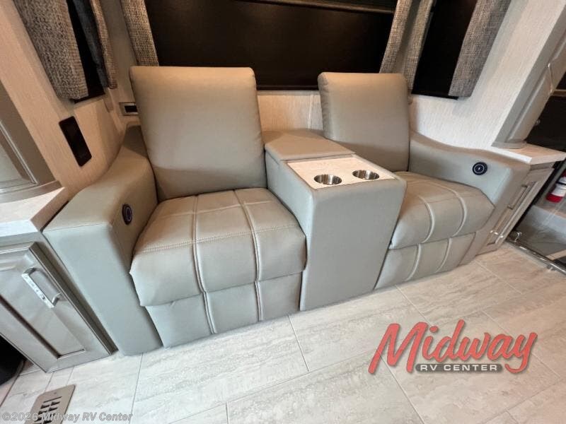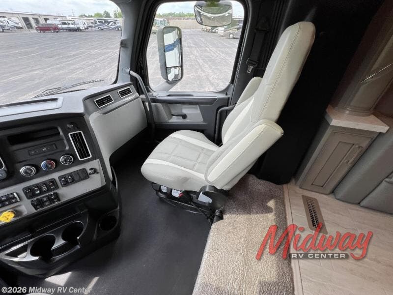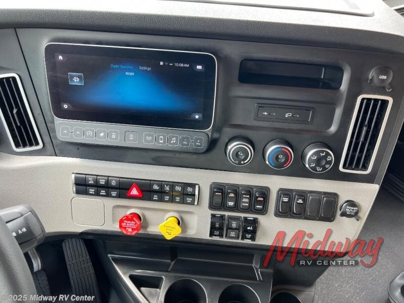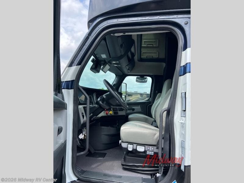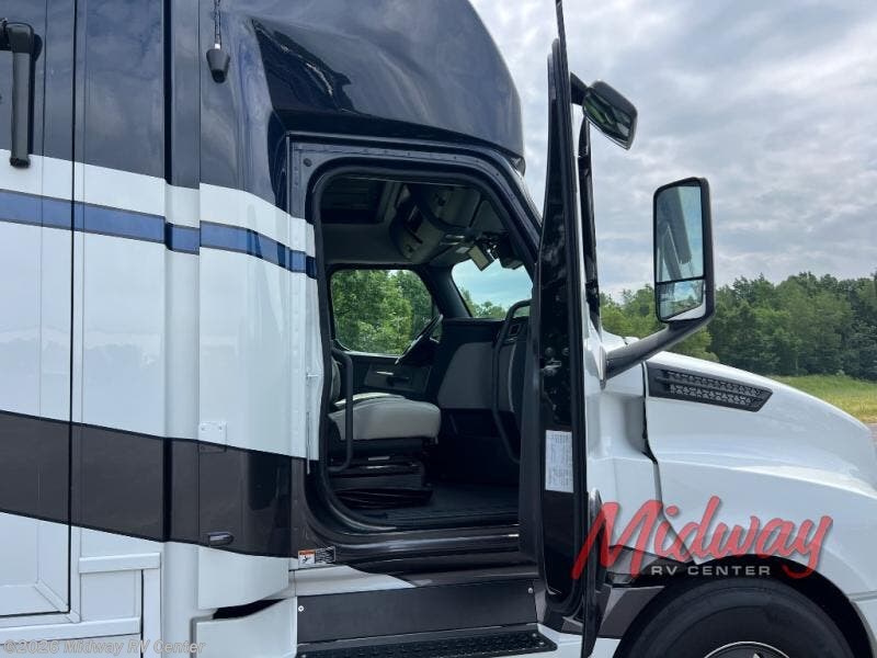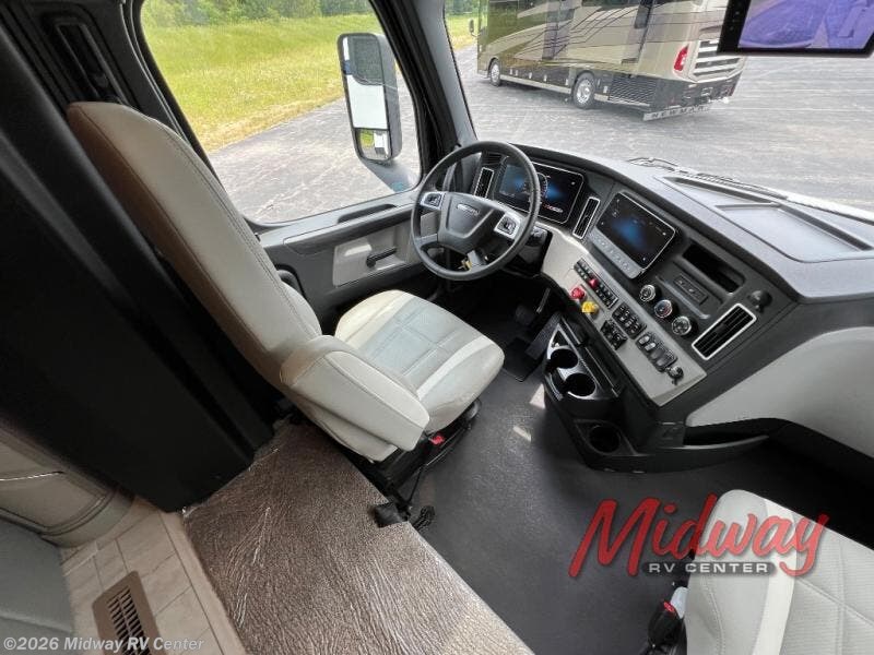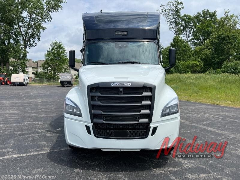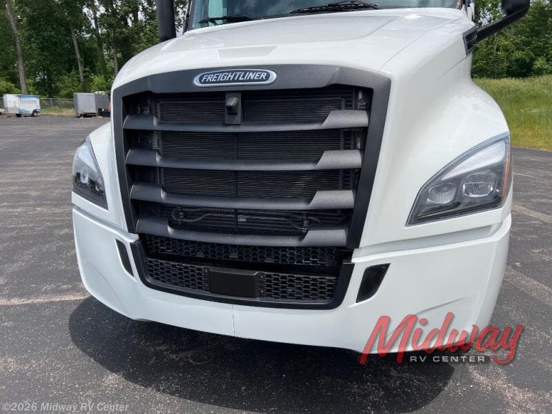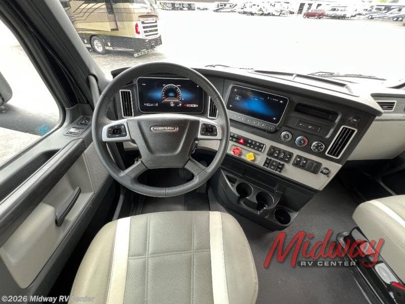 - Freightliner Cascadia Chassis, 600HP, Laughton Full Paint, Saguaro Decor, Morel Glazed Maple Cabinets, Electric Heated Tile Floor, Central Vacuum, Dishwasher, Dometic Freezer on Slides, Rear Camera Prep for Stacker Trailer, Sirius Radio Capable, Splendide 2 Piece Washer/Dryer, Starlink Internet System, Universal Toll Module, Wifi System w/ Everest Router, Premier Aire Mattress, Theater Seating, Power Window Shades, Safe, Fold Down Shower Seat, Hot Water Line to Basement, Chrome Power Baggage Door Locks, Flag Pole Bracket, Carefree Window Awnings, Kitchen Window, Nova Side Awnings