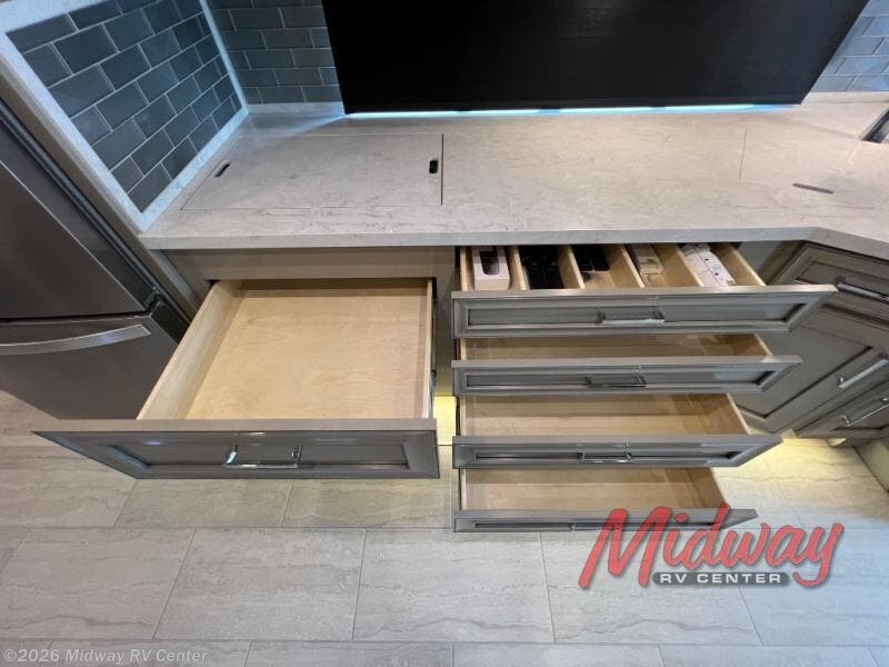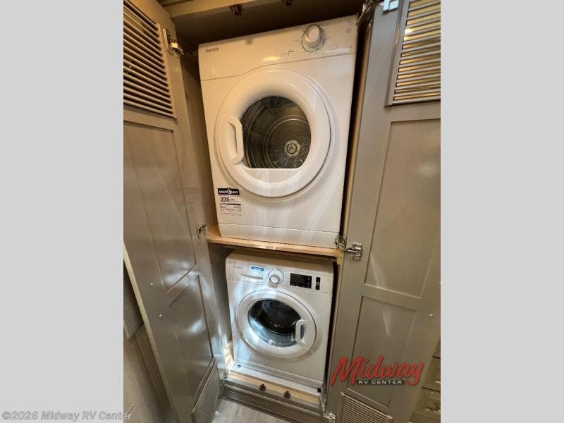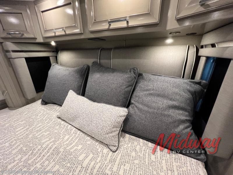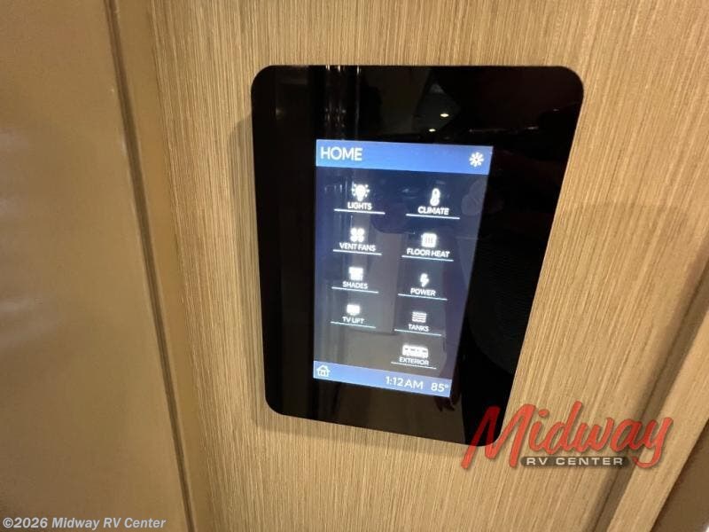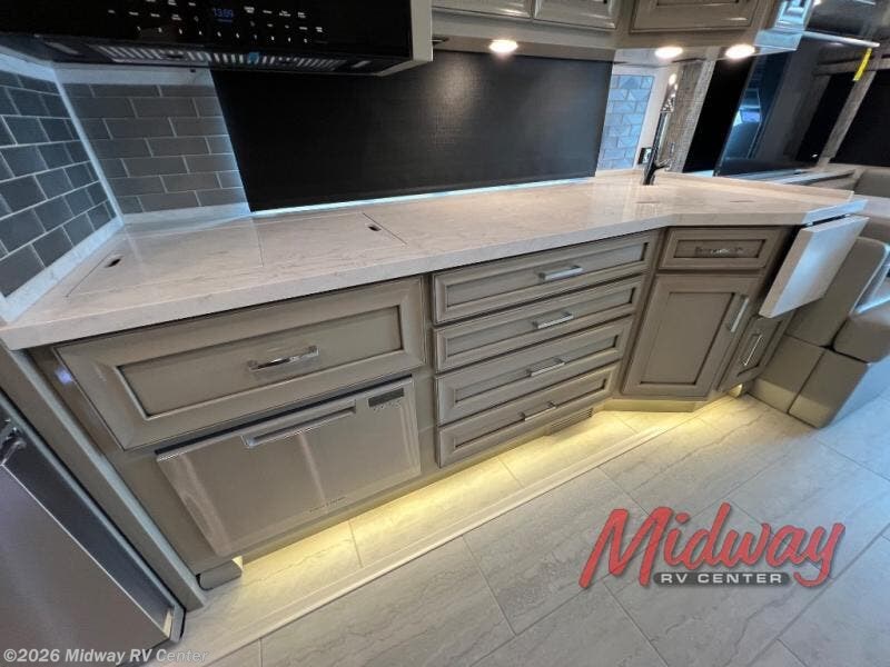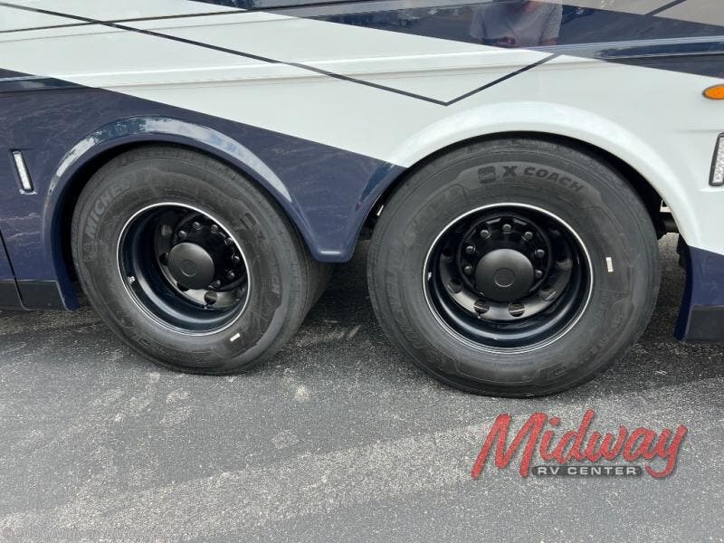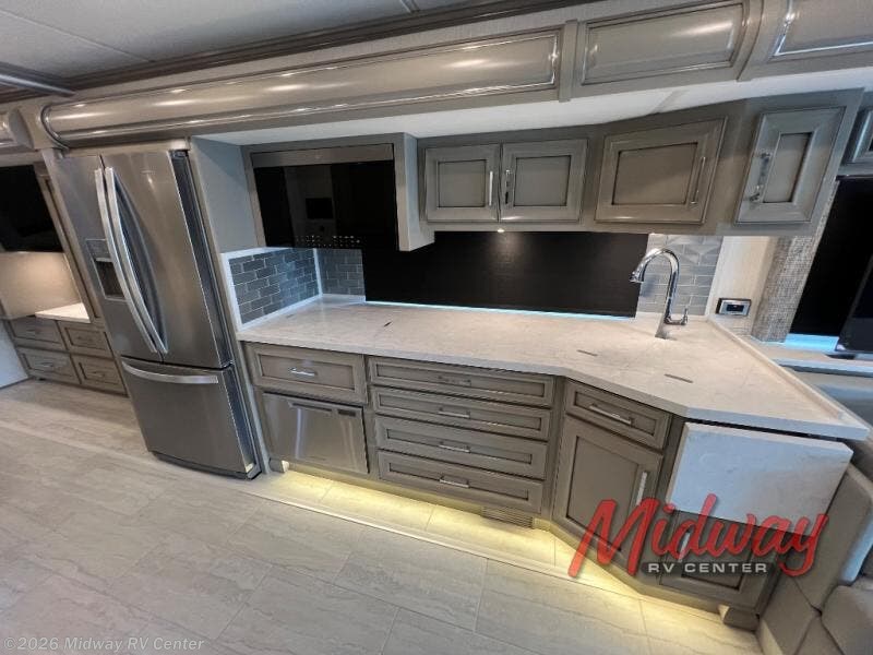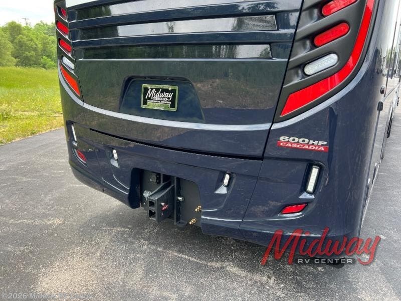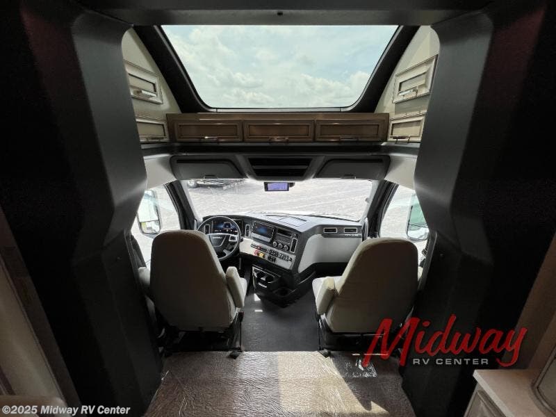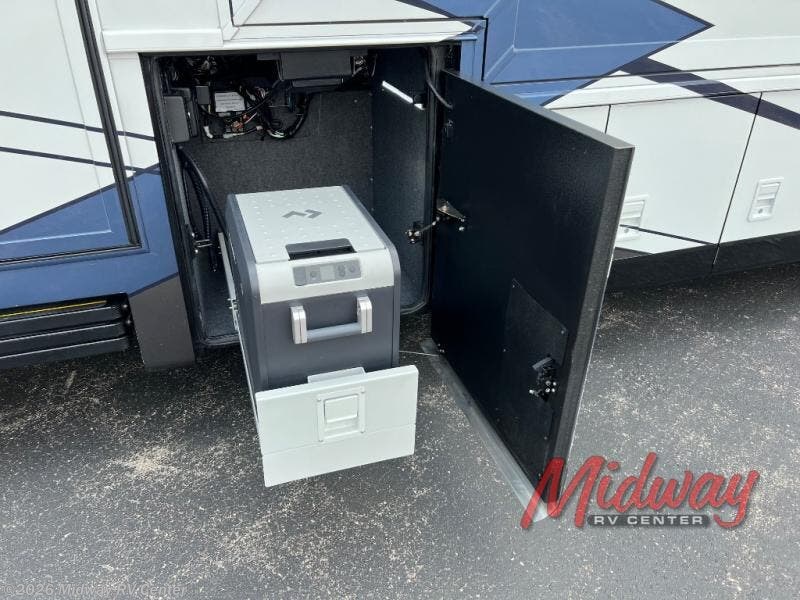 - Freightliner Cascadia Chassis, 600HP, Laughton Full Paint, Saguaro Decor, Morel Glazed Maple Cabinets, Electric Heated Tile Floor, Central Vacuum, Dishwasher, Dometic Freezer on Slides, Rear Camera Prep for Stacker Trailer, Sirius Radio Capable, Splendide 2 Piece Washer/Dryer, Starlink Internet System, Universal Toll Module, Wifi System w/ Everest Router, Premier Aire Mattress, Theater Seating, Power Window Shades, Safe, Fold Down Shower Seat, Hot Water Line to Basement, Chrome Power Baggage Door Locks, Flag Pole Bracket, Carefree Window Awnings, Kitchen Window, Nova Side Awnings