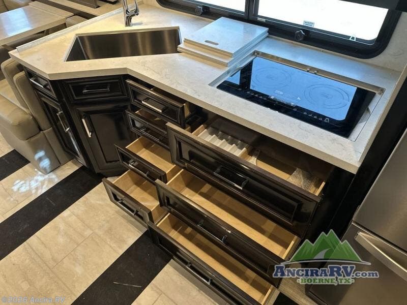 You can be sure to have plenty of space in this coach thanks to the four slide outs! Once you park for the night, your crew can relax on the hide-a-bed sofa across from the LED TV on power lift, or play a game at the booth dinette, and both furniture can double as sleeping space at night. While the chef of your group is preparing dinner on the all electric induction cooktop or in the stainless steel convection microwave, you can grab snacks from the pantry and set them out on the dry bar. The full bath will allow everyone space to freshen up each day, and the rear private bedroom will have you feeling right at home. Here, you'll sleep soundly on the king bed, be able to store your clothes in the dual wardrobes, and watch a movie in bed with the bedroom LED TV. There are even two more wardrobes, with one including washer and dryer prep!