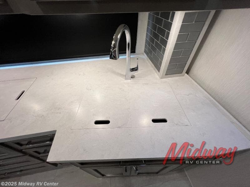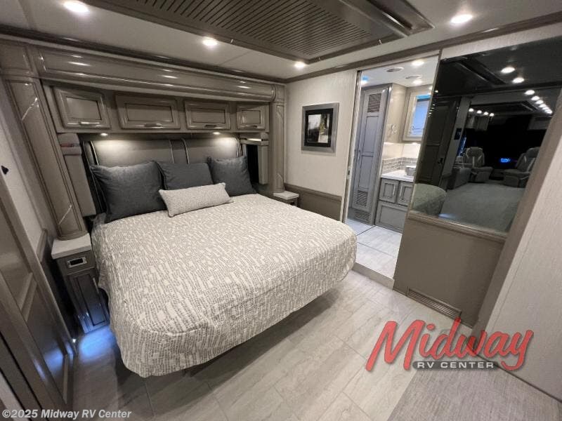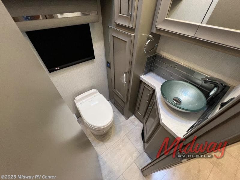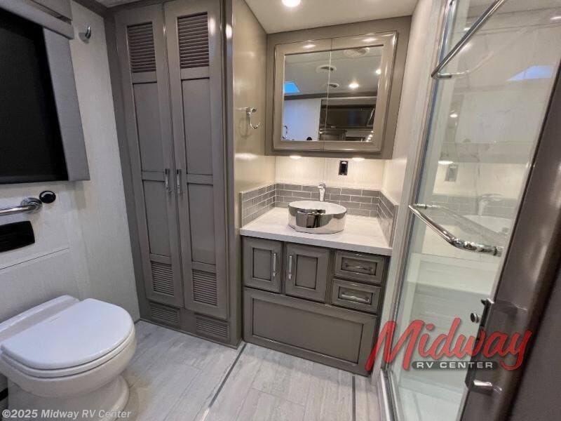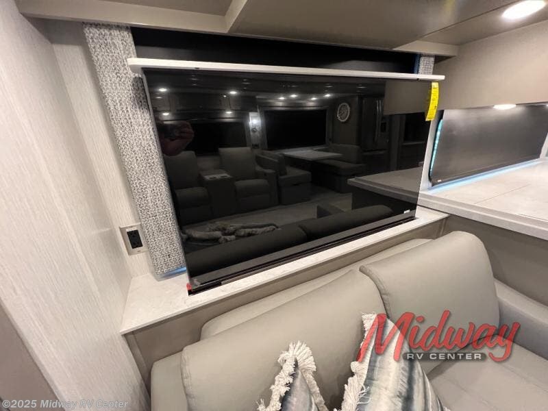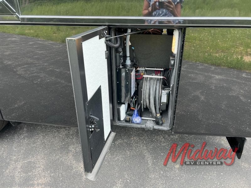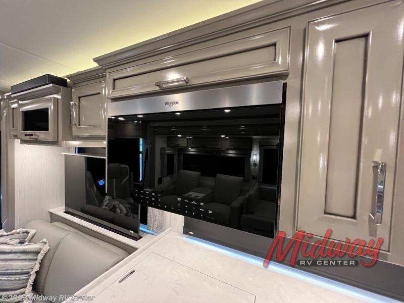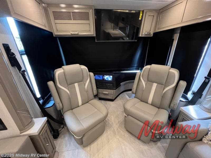 - Freightliner Chassis, Saguaro Decor, Special Order Full Paint, Morel Glazed Maple Cabinets, Onguard Collision System, Electric Heated Tile Floor, Central Vacuum, Sirius Radio Capable, 2 Piece Washer/Dryer, Starlink Internet System, Exterior TV, Front Overhead TV, Universal Toll Module, Winegard Rayzar Antenna, Premier Air Mattress, Theater Seating, Solar Prep, Safe, Hot Water Line to Generator, Chrome Power Baggage Door Locks, Storage Tray, Carefree Window Awnings, Kitchen Window, Nova Side Awnings