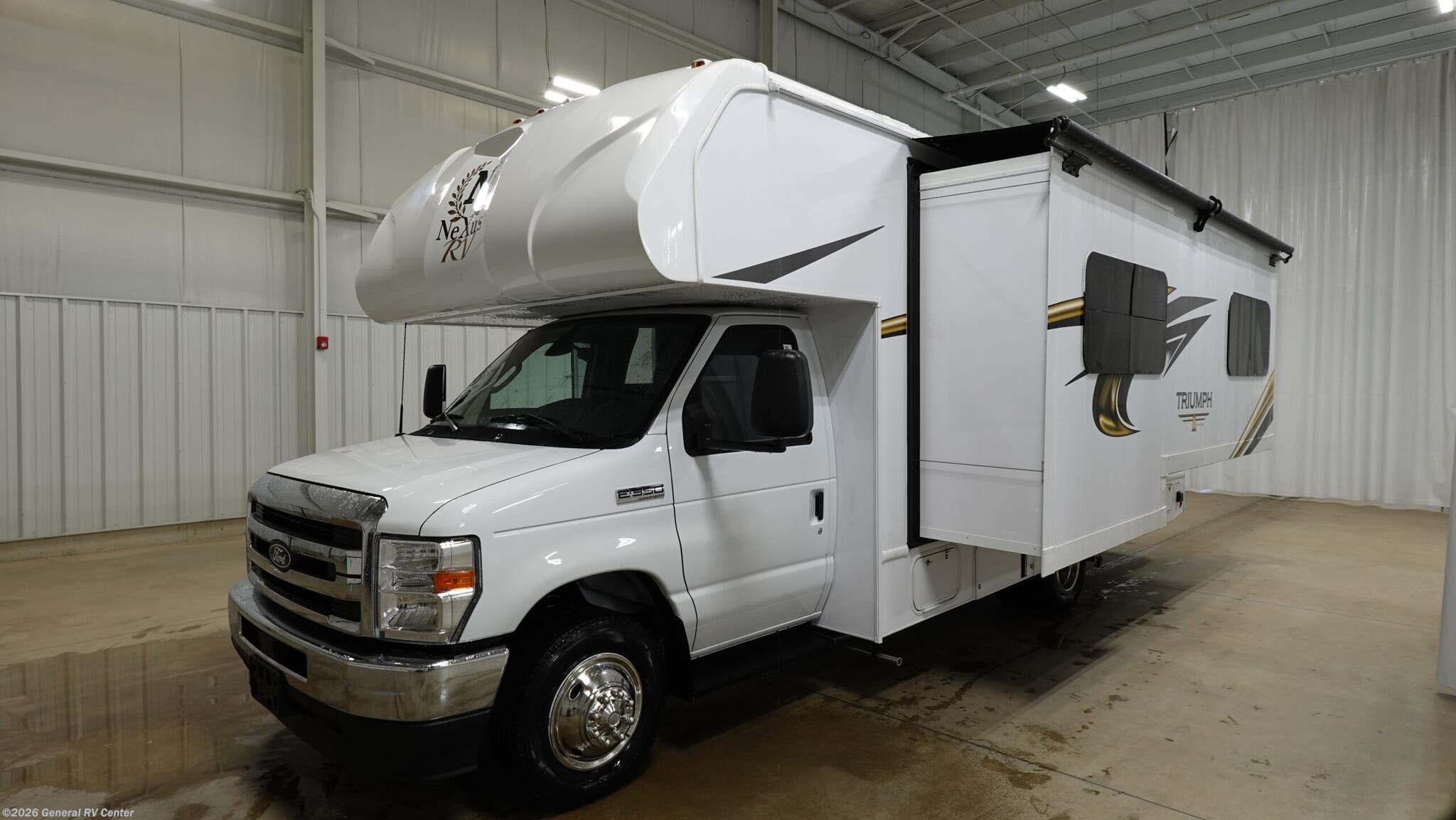 Step into the 2026 NeXus RV Triumph Sport 24TS, where adventure meets comfort in a beautifully compact design. This RV is built on the robust Ford E350 chassis, offering 325 horsepower and 450 torque, making it a powerful companion for all your road trips. With a length of 25 feet, it's perfectly sized for both city streets and open highways. The floorplan is thoughtfully designed with a front living area that invites relaxation, while the center kitchen becomes the heart of your travels, featuring a full-size electric refrigerator, convection cooking, and a three-burner cooktop to whip up your favorite meals on the go. Inside, the Triumph Sport 24TS comfortably sleeps up to six, with a queen bed, a full-size convertible bed, and additional sleeping space in the dinette area. The rear bath provides privacy and convenience with a shower curtain setup. Enjoy the outdoors with the powered retractable awning, perfect for creating shaded retreats wherever you park. With a 40-gallon fresh water capacity and ample gray and black water storage, your journey is as self-sufficient as it is exciting. For more details or to experience this RV in person, visit your nearest General RV dealership.