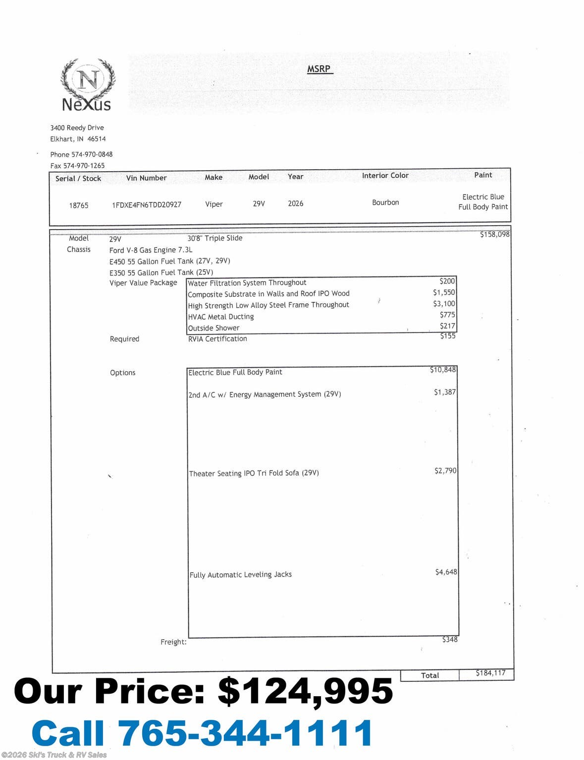 2026 Nexus Viper 29V Class B+ Motor Home; 30 Foot; 3 Slides w/Toppers; Sleeps 4; 30 Amp; Tow Capacity: 7,500 Lbs.; Ford E450 Chassis with 7.3L Gas Motor; Automatic Transmission; LOW MILES: Only 208 Miles; Auto Leveling; 40 Gal. Fresh Water Cap.; 28 Gal. Black Water Cap.; 28 Gal. Gray Water Cap.; One 12.2 Gal. Propane Tank; Two ACs: 13,500 / 13,500 BTUs; 30,000 BTU Furnace; 10 C.F. (12V) Refrigerator; On Demand Water Heater; Microwave; 3-Burner Stove; Two TV Jacks; 32 In. TV; AM/FM; Speakers; Stainless Steel Sink; Booth Dinette; Theater Seats; Queen Bed; One Bathroom with Shower; Backup Camera; 4500 Generator; Solar Package; Outside Shower; Full Body Paint; Exterior Storage; Battery Disconnect; Black Tank Flush; Azdel Sidewalls; Tinted Frameless Windows; Roller Shades; Chrome Hub Caps; One Year Limited Warranty; Financing Available; Amazing Class B+ Motor Home for the Price: $124,995. Call Skis Truck & RV Sales at 765-344-1111 or visit us at for more information.