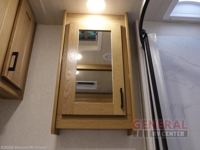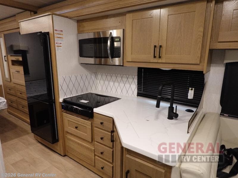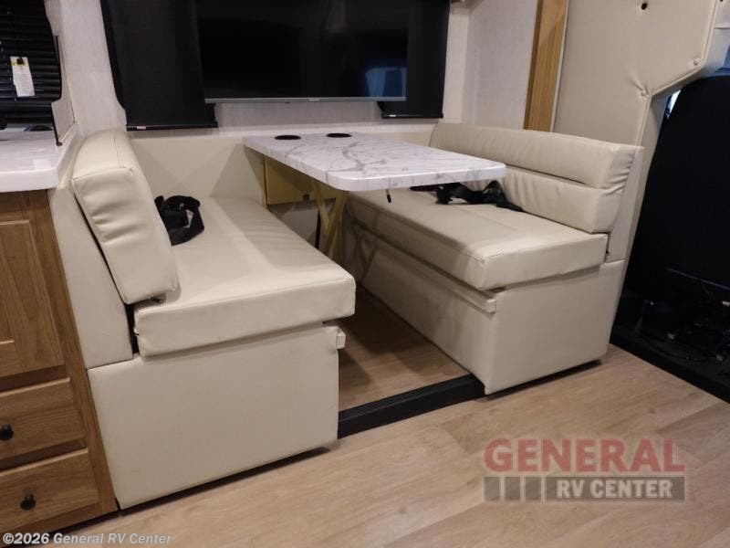The full-wall slide on this coach is what will make it feel more open, just like at home! You can prepare meals on the three burner cooktop, or in the stainless steel microwave. There is a booth dinette to dine at and a 10 cu. ft. 12V refrigerator to store your leftovers. A sofa will also provide seating and sleeping space, along with the bunk over cab! This model includes a full bath with a shower skylight, electric roof vent, and a large medicine cabinet to store your things. When you're ready for bed, head to the rear bedroom for a great night's rest on the bed and there is bedroom wardrobe to keep your items tidy!