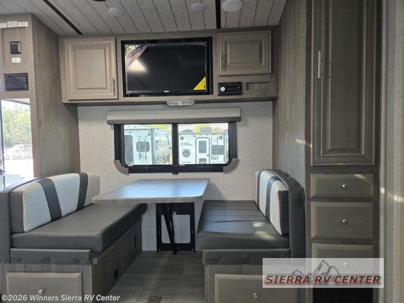 You will be enchanted by this travel trailer's amenities! The full rear bathroom provides a private and convenient space for freshening up. The kitchen has a 12V refrigerator for keeping food and drinks fresh, a booth dinette for dining and socializing, and a three-burner cooktop for creating your favorite meals. Plus, overhead cabinets are placed throughout the trailer for ample storage of cookware and dishes. The living area boasts a spacious 62” sofa for relaxation, a mud bench for cleaning and storing outdoor gear, and a coat rack for hanging jackets and accessories. This unit's cozy front bedroom features two wardrobes on each side of the bed and a wardrobe slide out for storing clothing and essentials.