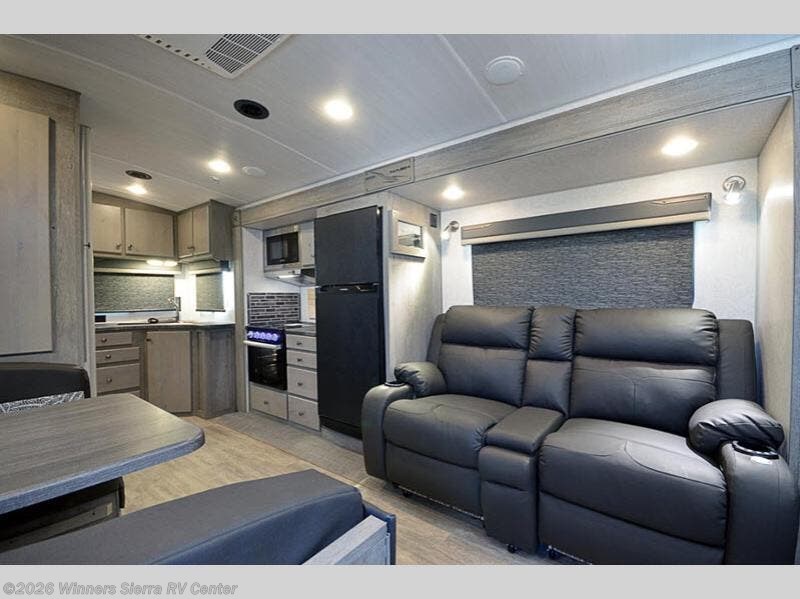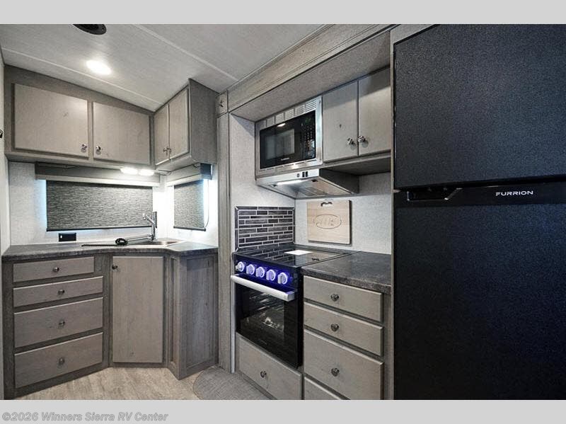 Escape to the campground in this travel trailer for three. The front queen bed includes dual wardrobes to keep your clothes tidy and overhead cabinets for your belongings. You can relax on the theater seating within the large slide out, and the booth dinette can convert to a 40" x 76" sleeping area for guests. The rear of this unit is shared with the full bath and the kitchen counter with a stainless-steel sink. You can prepare meals on the three-burner range and keep food fresh in the 10-cu. ft. 12V refrigerator.