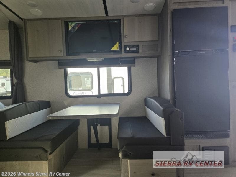 Weekend trips to the campground are made complete in this spacious travel trailer that can sleep four each night. You'll have the front RV queen bed to yourselves, along with dual bedside wardrobes for your things. If you have any guests, they can sleep on the tri-fold sofa within the slide out, and there is an additional wardrobe here as well. The Slide & Dine table with folding dinette chairs provides a place to dine together each day, or you can choose the optional booth dinette that will convert to additional sleeping space. The full kitchen will let you make meals each day and the full rear bath is sure to come in handy when you need to freshen up after hiking!