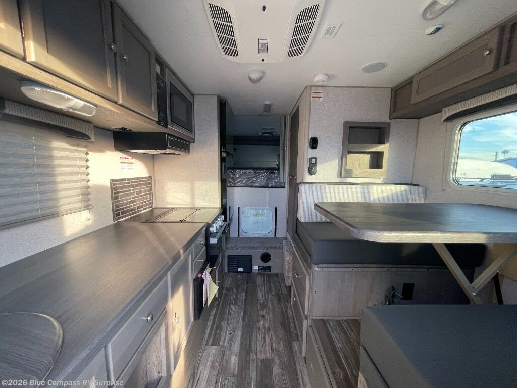 Make your weekend excursions easier than ever in this cozy truck camper for three to four. Since there is a 58" x 80" queen bed up front, you won't have to sleep on the floor, and your guests can sleep on the booth dinette that converts to a 40" x 72" sleeping area. Get cleaned up each day in the convenient wet bath that includes a medicine cabinet and an exhaust fan to keep everything fresh. There is a three burner cooktop and residential-style microwave with an air fryer to prepare meals each day, plus an 8 cu. ft. 12V refrigerator for perishables. This model also includes three wardrobes around the bed for more storage place plus a TV location if you want to add the optional 24" 12V LED TV!