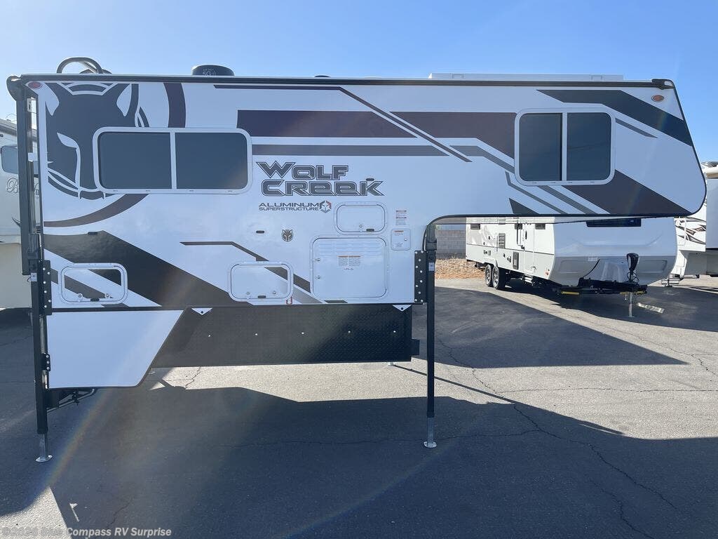 With any Wolf Creek truck camper by Northwood you can camp year around thanks to the high density block foam insulation, thermal pane windows, and the multi-layered substrate walls. The durable fully welded, thick-wall aluminum frame construction will add durability, and the Corona treated fiberglass will help combat leaks so you can enjoy your camper for years to come. Each model includes fabric night shade window treatments, custom one-piece formed countertops and dinette table, hardwood cabinet doors, and many more comforts. You will love the high value features included within the Wolf Pack, such as a Fox Landing ready rear bumper, a premium vent, electric jacks, and outside speakers.