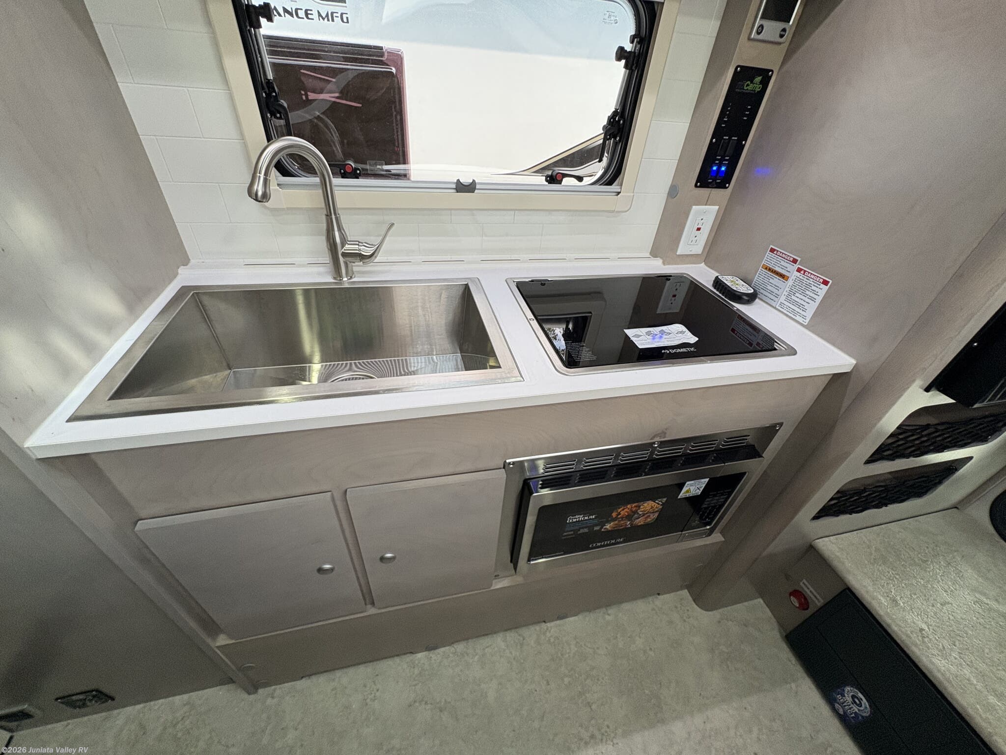 - Enclosed Water Tank and Water Heaters: Tankless demand gas water heater, water heater, and heated underbelly for cold-weather camping