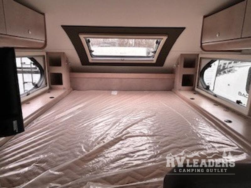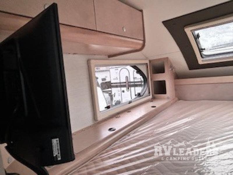 You will find a pass-thru window on this Cirrus truck camper. The exterior has a Maggie roof rack for bringing along extra gear, and there is a motorized 120" side awning to protect you while you're living life outside. The convection microwave/oven is going to make your meal prep easier and faster, and the air conditioning will keep this camper's interior at a desirable temperature even when it's hot outside. This model also comes with a Bluetooth media center with 19" TV and a great sleeping area with the Froli sleep system.