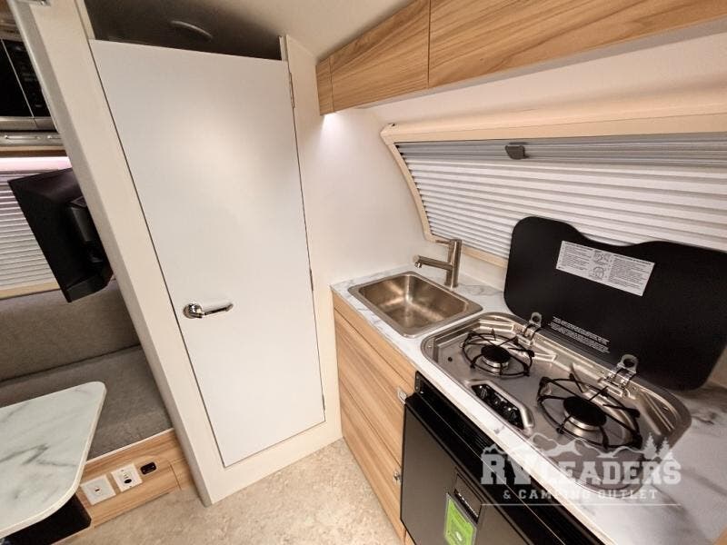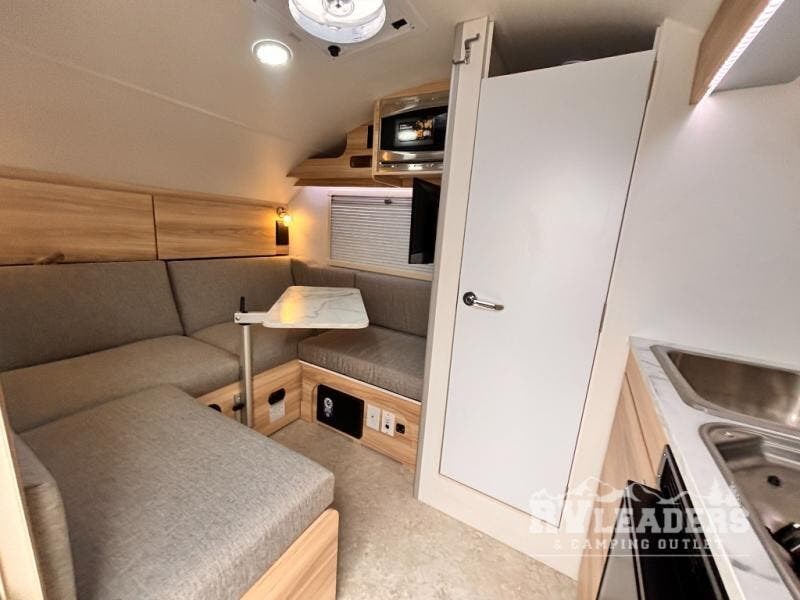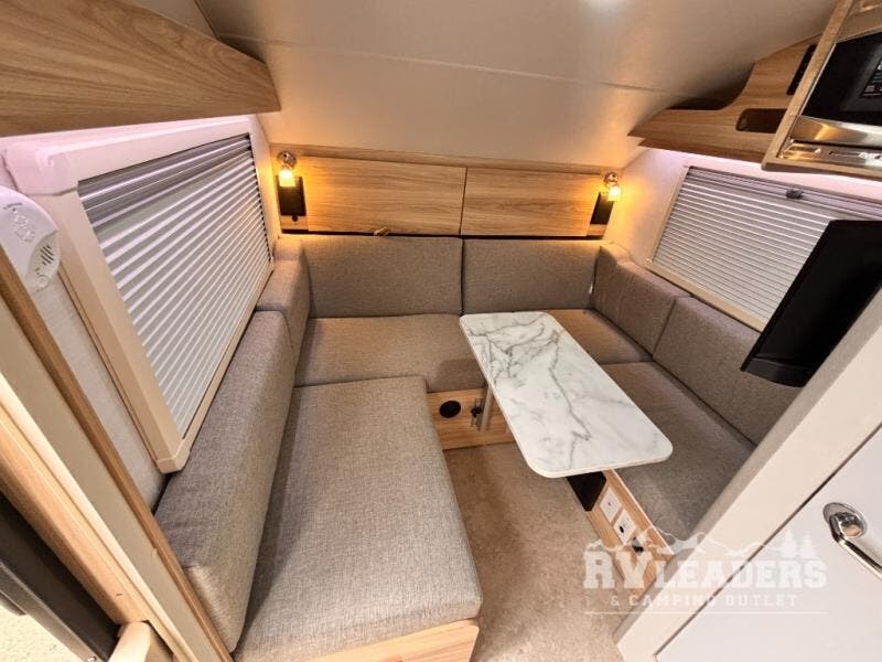 With any TAB 320 teardrop trailer by nuCamp RV, the interior offers premium soft-close cabinetry, a front window, plus a wet bath with a cassette toilet and a molded sink. They are also built with composite flooring and a molded underbelly shield for protection against rock and debris during your journeys. The iconic teardrop design offers an easy-to-tow unit with amenities found in much bigger trailers. Some other highlights include the Alde heating/hot water system, the central air conditioner, 180-watt solar panel, and the Nautilus water system with an external shower.