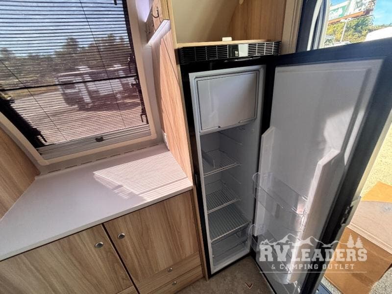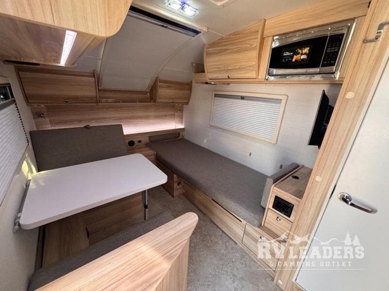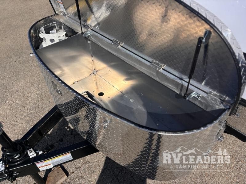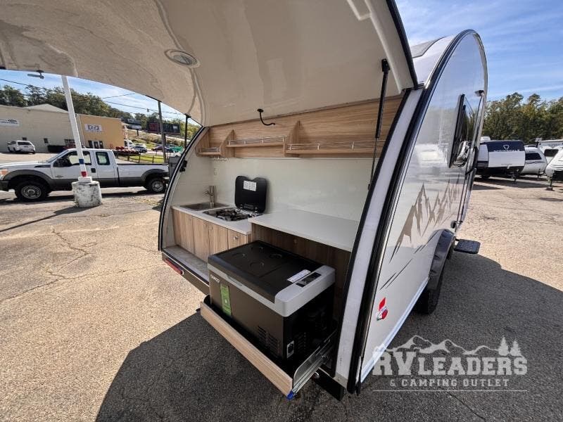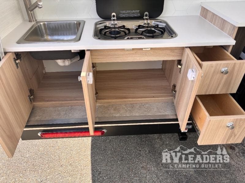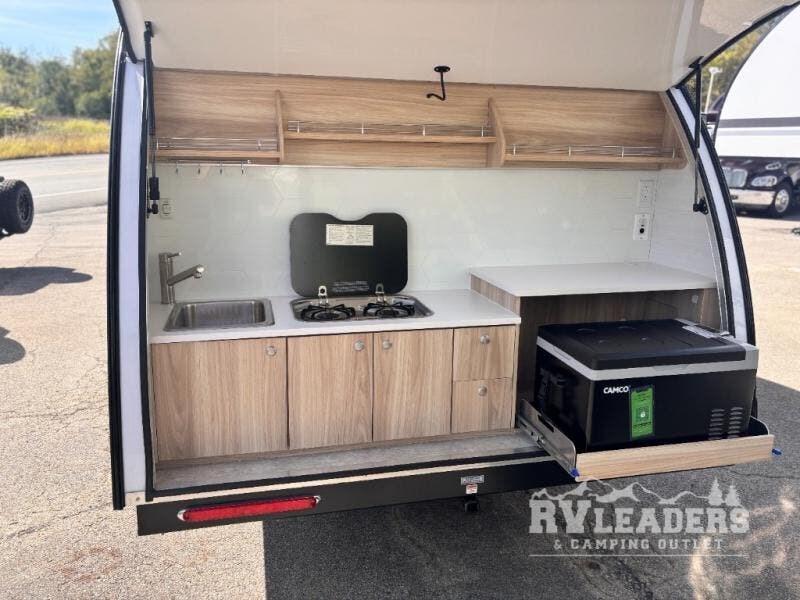 You're going to love camping in this teardrop clamshell trailer! Once you arrive at the campground, you can make lunch on the exterior rear hatch kitchen. There is a two-burner glass-top stove and a 30L 12-volt cooler here to quickly make lunch and grab a cold drink. The interior 5 cu. ft. 12-volt compressor refrigerator will provide more food storage, and an optional microwave can be added inside for the option to heat up quick meals indoors. You're sure to get a great night's rest on the twin-size bed, and the booth dinette can convert to a second twin-size bed so you can sleep two comfortably. The optional Black Canyon Upgrade can be added that includes a solar upgrade to dual 190W panels, holding tank heaters and underglow lights.