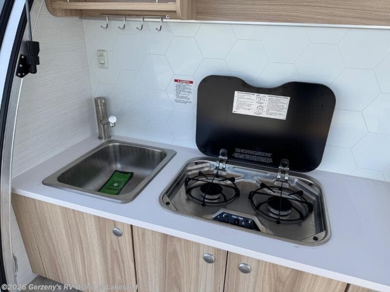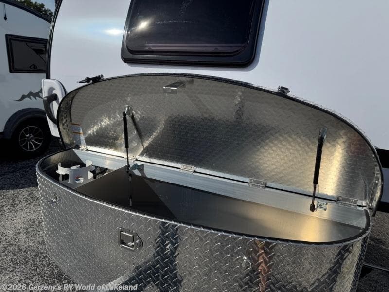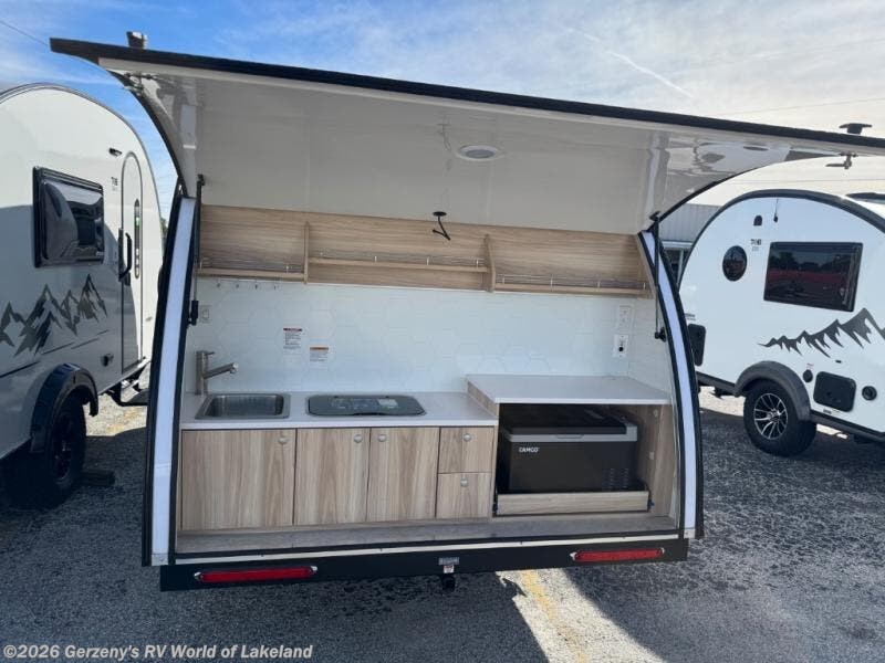 The TAB 360 CS teardrop trailer by nuCamp RV lets you take comfort with you wherever you roam! Since the kitchen has been moved outdoors with a hatch door, you'll enjoy a more spacious interior, while still experiencing an easy tow. Outside, there are aggressive off-road tires, a Nautilus water system with an external shower, plus a diamond plate storage tub. You'll love the look of the premium soft-close cabinetry, and the composite flooring will be easy to keep clean. There is also an Alde heating/hot water system, dual stargazer windows, and a power roof fan to name a few more conveniences. The Convenience Package includes a 190-watt solar panel and an external solar port, plus a 100Ah 12V lithium battery, an intelligent battery detection converter and a Bluetooth Smartshunt battery monitor. The optional Battle Born Lithium Battery Upgrade can be added that includes a 270Ah 12V lithium battery bank with internal heat and a 3,000-watt MultiPlus inverter/charger for even more power options!