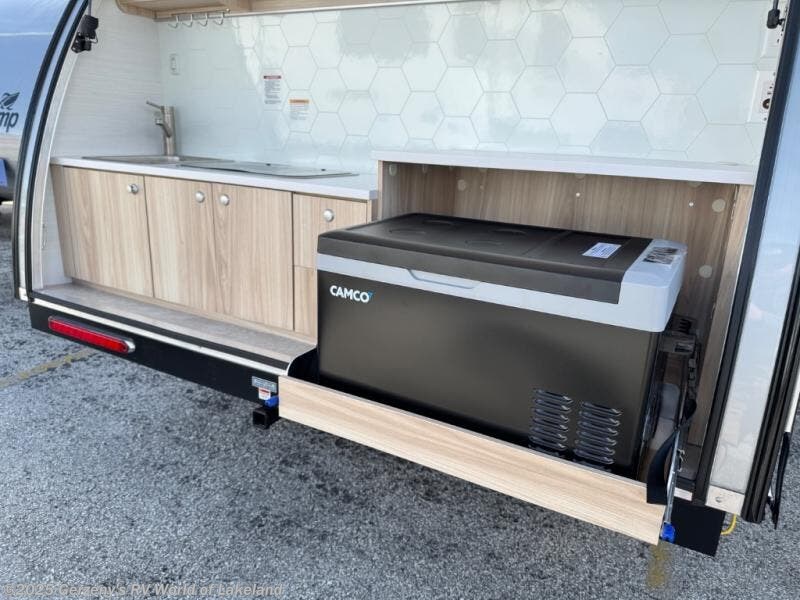 The TAB 360 CS teardrop trailer by nuCamp RV lets you take comfort with you wherever you roam! Since the kitchen has been moved outdoors with a hatch door, you'll enjoy a more spacious interior, while still experiencing an easy tow. Outside, there are aggressive off-road tires, a Nautilus water system with an external shower, plus a diamond plate storage tub. You'll love the look of the premium soft-close cabinetry, and the composite flooring will be easy to keep clean. There is also an Alde heating/hot water system, dual stargazer windows, and a power roof fan to name a few more conveniences. The Convenience Package includes a 190-watt solar panel and an external solar port, plus a 100Ah 12V lithium battery, an intelligent battery detection converter and a Bluetooth Smartshunt battery monitor. The optional Battle Born Lithium Battery Upgrade can be added that includes a 270Ah 12V lithium battery bank with internal heat and a 3,000-watt MultiPlus inverter/charger for even more power options!