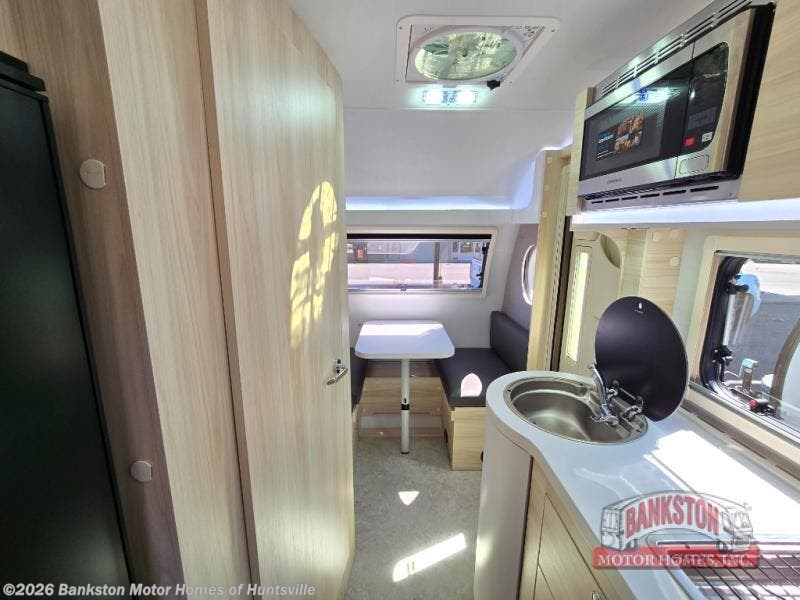 This teardrop trailer offers sleeping space for three with two sleeping areas; one up front and one in the rear. The dinette allows you to eat and relax during the day, and at night this space becomes sleeping space for one. And if you're needing even more sleeping space, you can choose the optional bunk floorplan! The queen-size sleeping area is located on the opposite side with the wet bath in between for convenience for all. The galley kitchen will give the cook a place to make warm meals and store leftovers in the 4.6 cu. ft. 12V compressor refrigerator. Everyone can watch the 24" TV through the Bluetooth media center before bedtime, or in the morning as you all plan your next activity. And the Alde central heating/hot water system, as well as central air conditioning will keep you comfortable wherever you set up. When the optional Black Canyon upgrade is chosen on this model, you'll enjoy an additional 310-watt solar panel, holding tank heaters, underglow lights and an XL diamond plate storage tub!