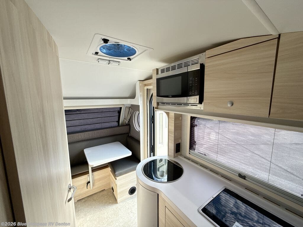 The TAB 400 by nuCamp RV is mighty in essentials and spacious for a teardrop trailer! There is a Froli sleep system, a spacious wet bath, a galley kitchen and plenty of storage plus a dinette. Inside you will enjoy the Bluetooth media center, premium soft-close cabinetry, and an expansive picture window. You'll also find composite flooring, a rail table, and a power roof fan to name a few more comforts. The Convenience Package comes with a 310-watt solar panel, a 1,200-watt power inverter, a 100AH 12-volt lithium battery, and more features to help you camp off grid! Along with the optional Black Canyon Upgrade, you can also choose the optional Lithium Battery Upgrade, an optional microwave, and an optional Maxxair fan to further customize your camper!