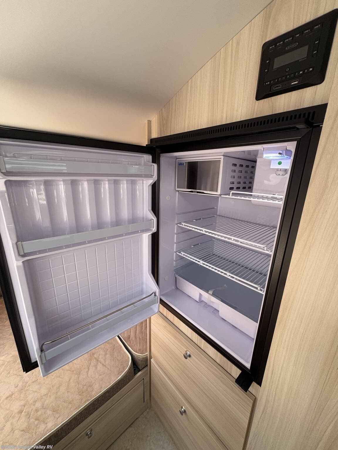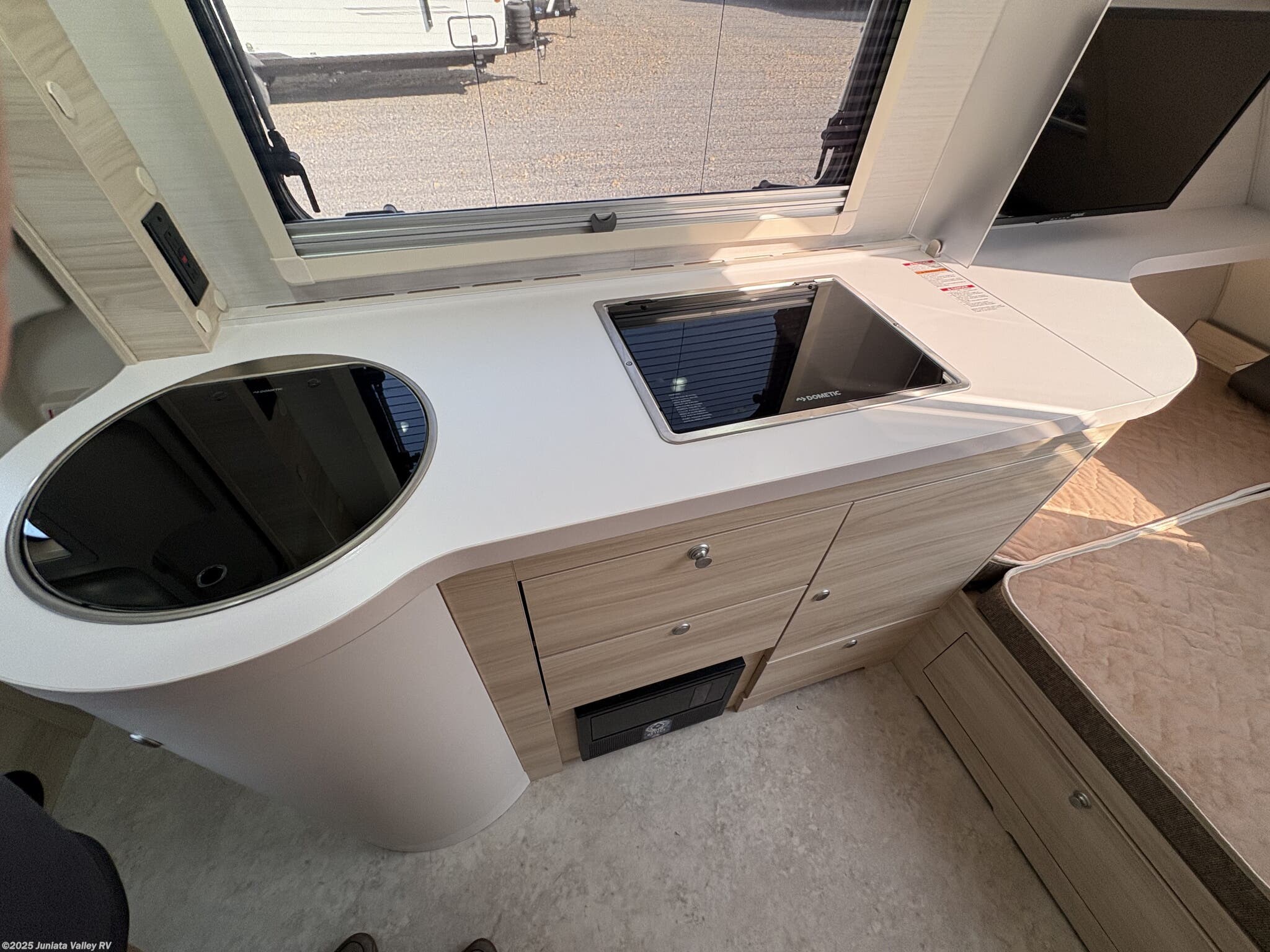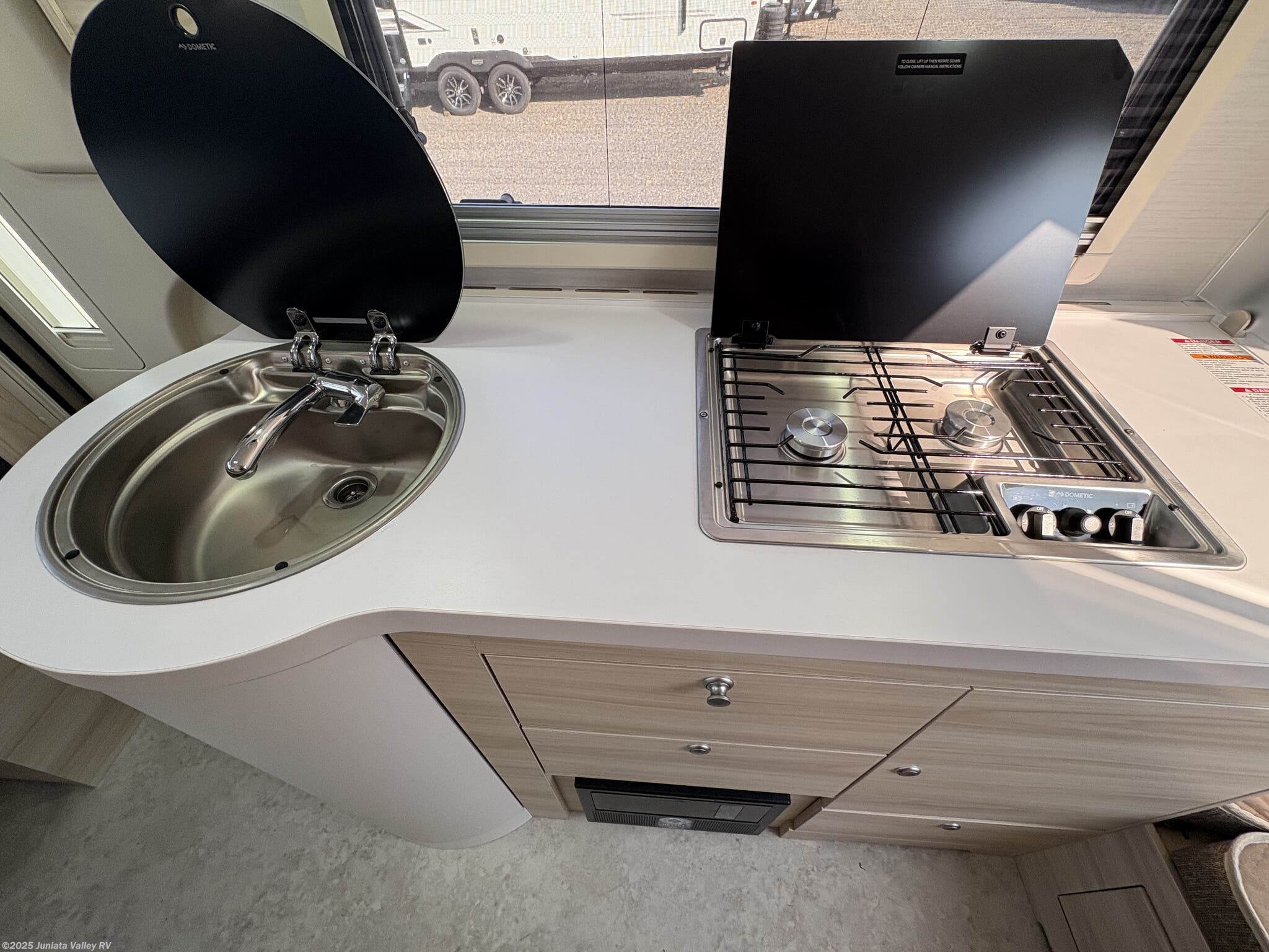 - Kitchen: Solid surface countertops, kitchen sink, microwave, 12V refrigerator, stove top burner, stove cover