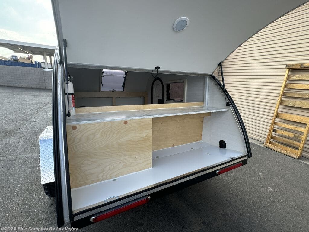 At the end of a long week, it will be easier than ever to hitch up this single axle teardrop trailer and head out! There are dual entry doors with porthole windows so you can see outdoors, plus there is a front stargazer window with a shade. The 3-speed fan and air conditioner will keep you comfortable all summer long, and there are 12-volt/110 USB outlets to keep your phone or camera charged. Once you've opened the rear hatch door, you can whip up some eggs on your electric griddle you brought along, and there is space under the countertop for your cooler or other essentials.
