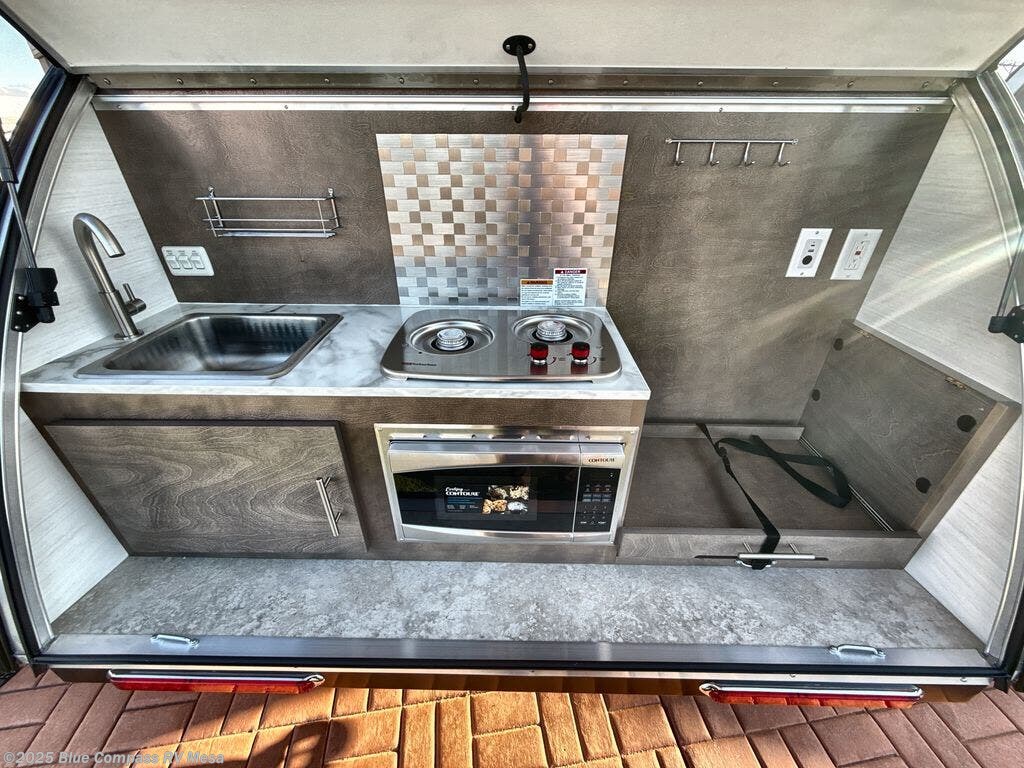 With any nuCamp RV TAG teardrop trailer, you can bring some of the comforts of home with you as you easily tow this lightweight trailer to the campgrounds. The outdoor kitchen includes a stainless steel sink and two-burner stove so you won't have to cook over a campfire each day. Inside, you'll find a composite floor, deluxe Amish cabinetry, sleeping accommodations, and a power roof fan to keep you comfortable. You will also appreciate the Convenience Package that comes with a 180-watt solar panel, a portable Bluetooth speaker, a 100 Ah 12-volt Lithium battery, and more!