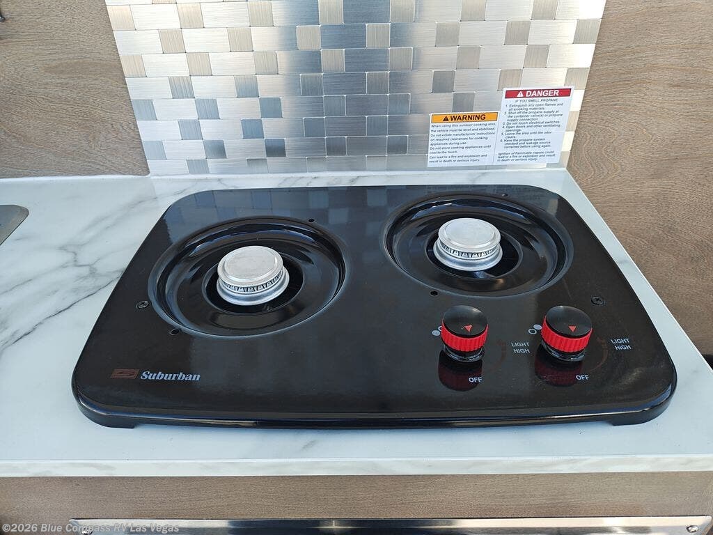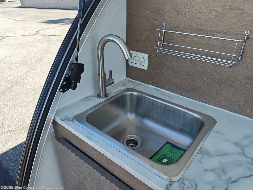 With any nuCamp RV TAG teardrop trailer, you can bring some of the comforts of home with you as you easily tow this lightweight trailer to the campgrounds. The outdoor kitchen includes a stainless steel sink and two-burner stove so you won't have to cook over a campfire each day. Inside, you'll find a composite floor, deluxe Amish cabinetry, sleeping accommodations, and a power roof fan to keep you comfortable. You will also appreciate the Convenience Package that comes with a 180-watt solar panel, a portable Bluetooth speaker, a 100 Ah 12-volt Lithium battery, and more!