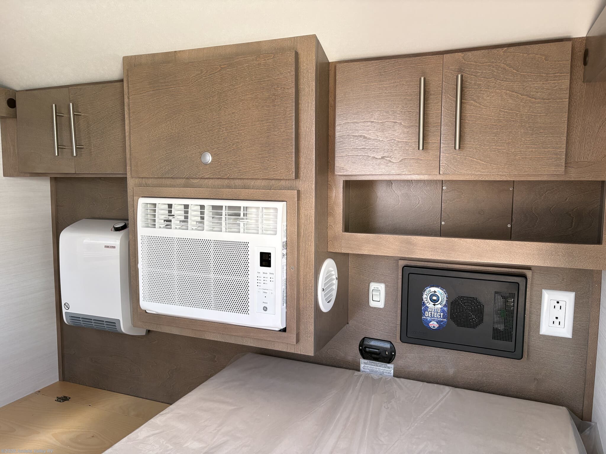 Alloy Wheels, Detachable Power Cord, Enclosed Underbelly, External Shower, Fiberglass Sidewalls, Front Overhead Storage, Heated Underbelly, Keyless Entry, Roof Vent, Spare Tire Kit, Stabilizer Jacks, Tinted Windows -