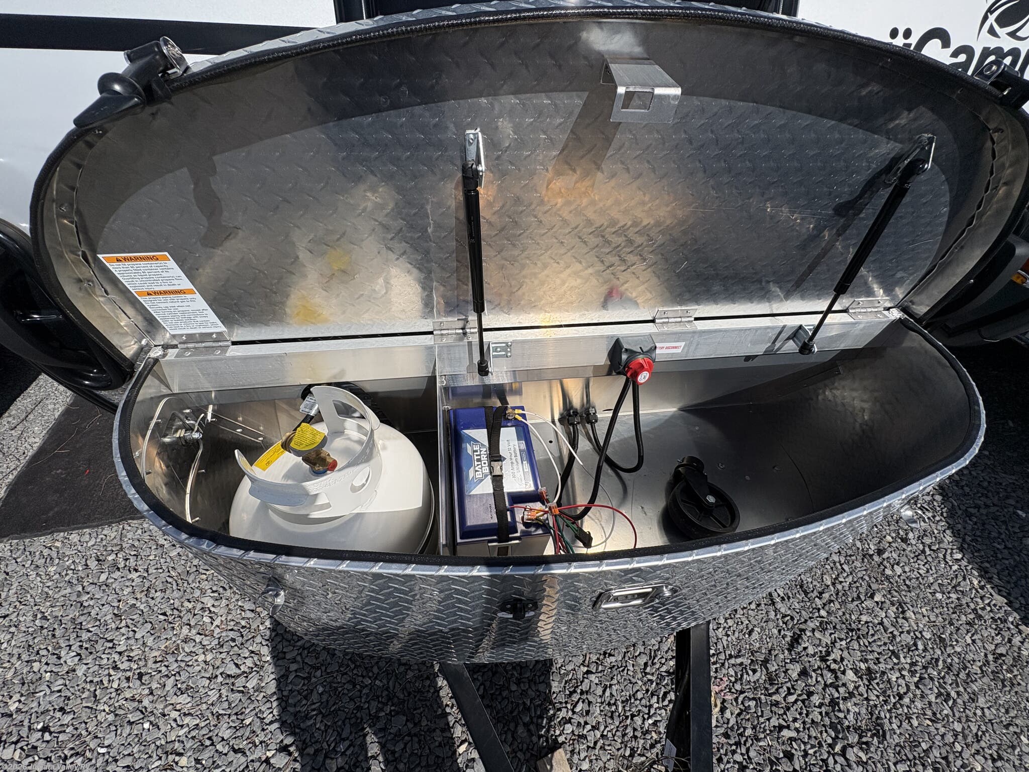 Life on the go is smoother with practical systems and useful upgrades. Enjoy onboard cooking with a stove top burner, meal prep with a microwave, and food storage from a refrigerator plus a 12V refrigerator option. For comfort, the trailer includes air conditioning with 30 Amp service, along with solar panels for added off-grid capability.