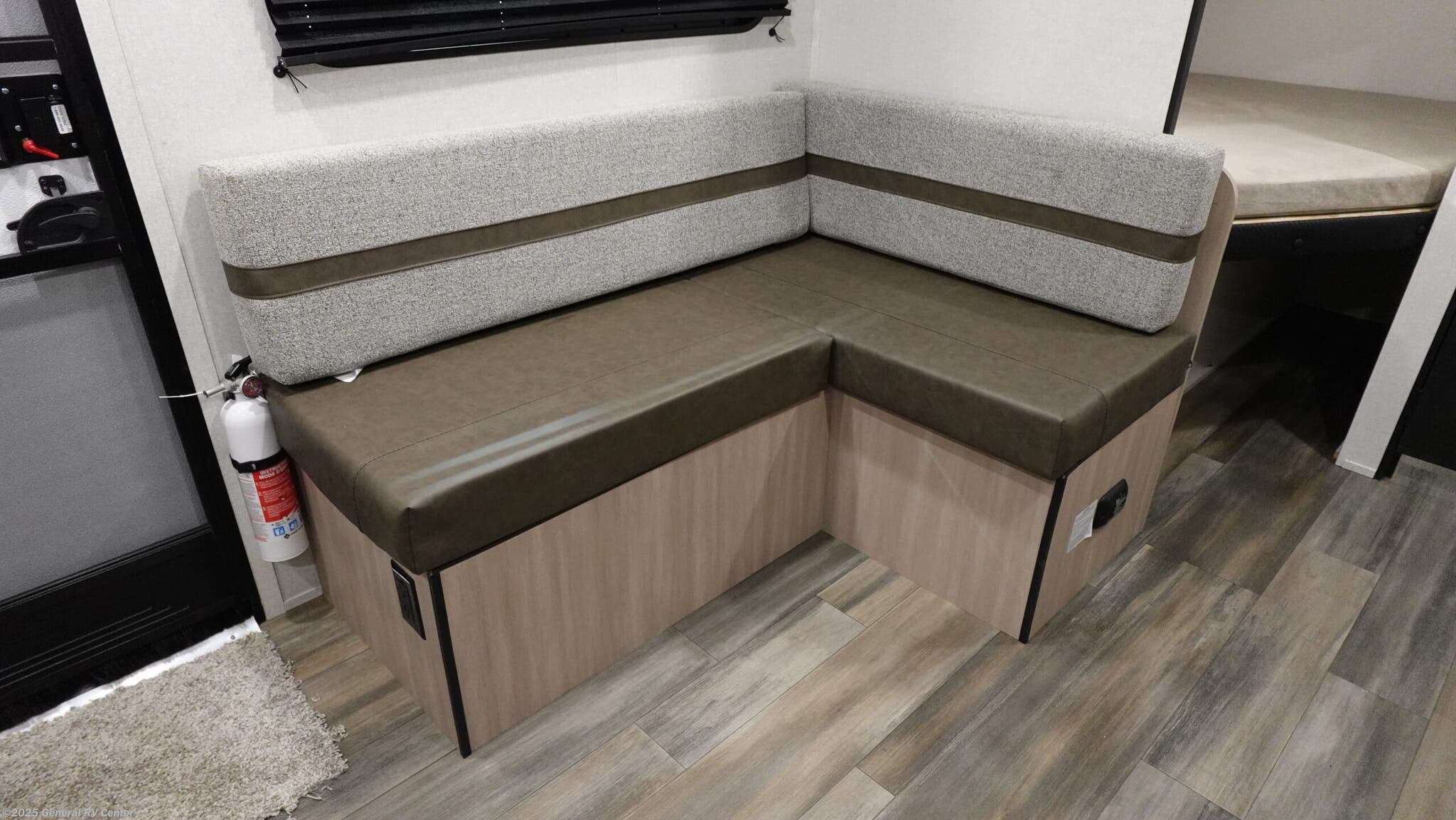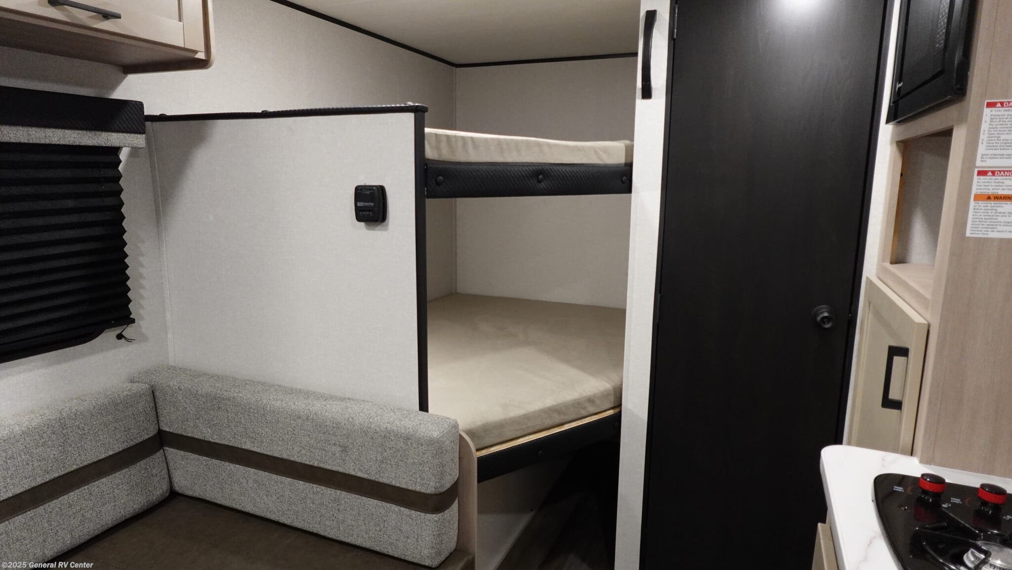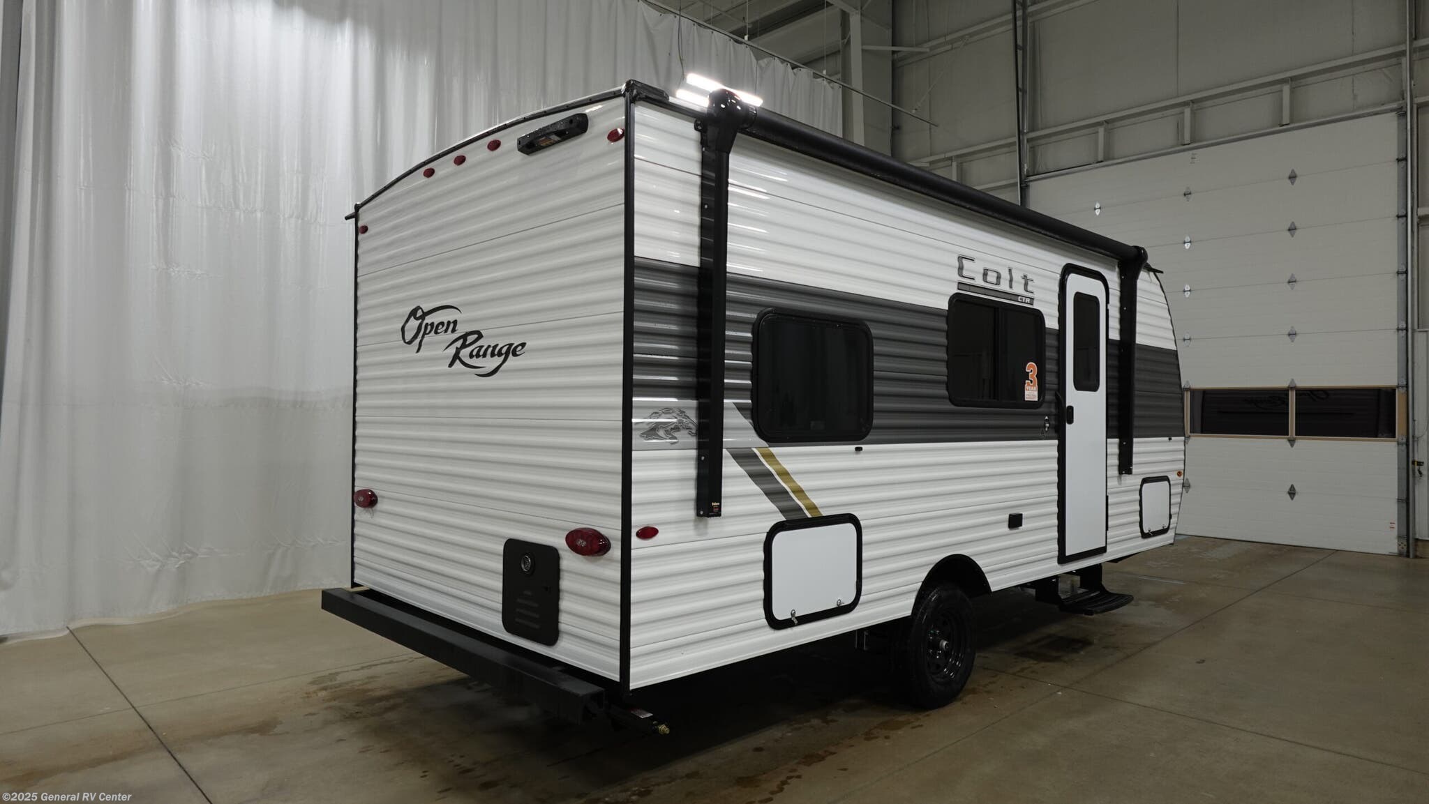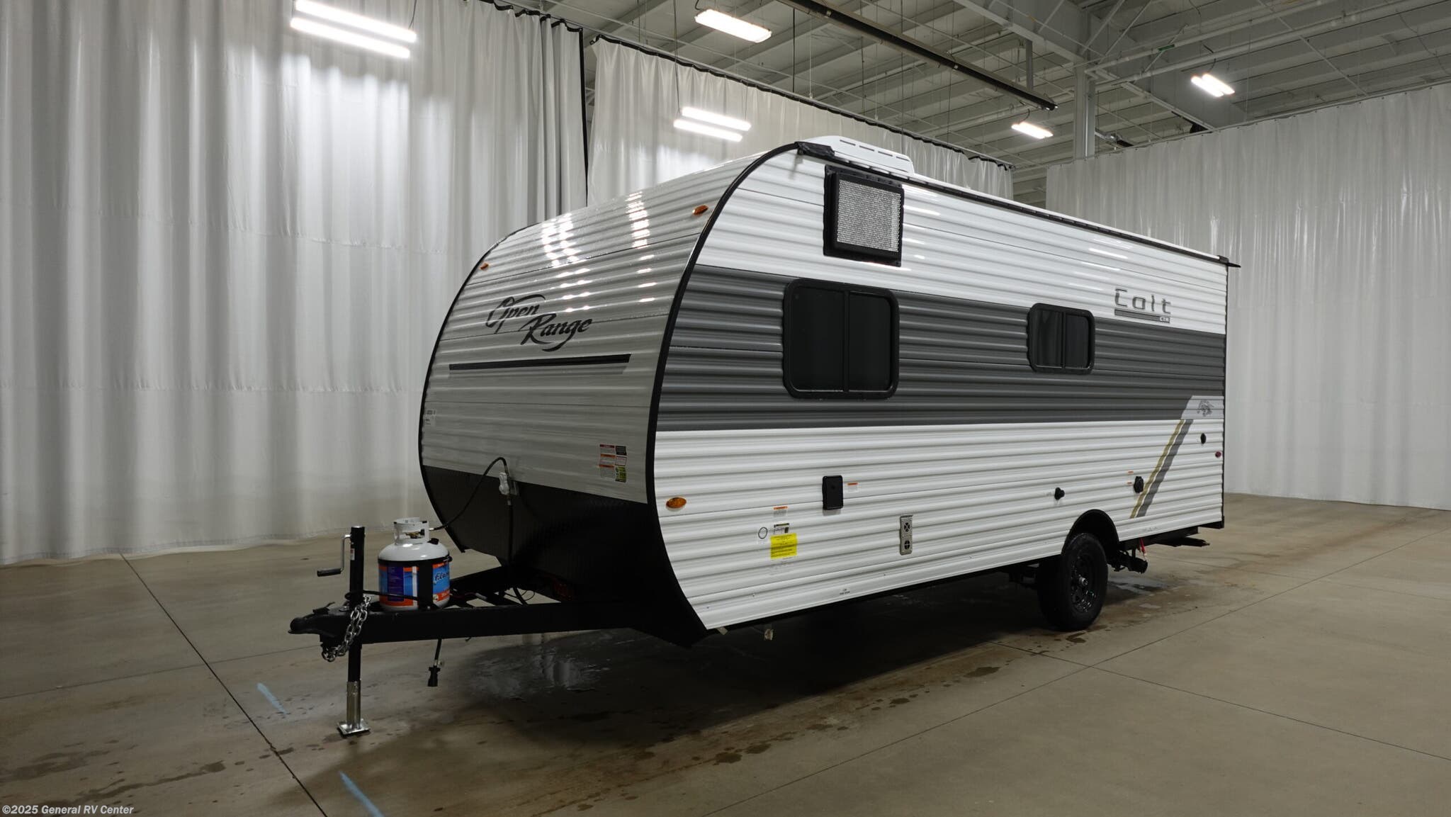 Open Range RV Colt travel trailer 17DB - CTR Edition highlights: Double-Size Bunk Beds Overhead Cabinets L-Shaped Dinette 40" Shower Front Queen Bed This easy to tow travel trailer features compact sleeping spaces thanks to the double-size bunk beds in the rear corner, and the private bath is right next to the bunks for easy nighttime use! You'll have the front queen bed to yourselves, along with a wardrobe, nightstand, and overhead shelf for your things. A two-burner cooktop and microwave oven will let you make meals each day, and there is a 12V refrigerator to keep your cold items fresh. Outside, you'll enjoy the 10' power awning for added shade, and there are two exterior storage compartments to keep fishing poles, hiking gear and more! With any Colt travel trailer by Open Range RV, you can be sure you're getting a budget-friendly unit designed to fit your lifestyle! Each one is built to last with a PVC roofing membrane and built-in A-frame, plus there are nitrogen-filled radial tires and self-adjusting electric brakes for easy towing. You will appreciate the utilities that include 30-amp service, an A/C unit, and an on-demand tankless water heater. A few interior comforts include vinyl flooring throughout, solid hardwood cabinet doors, and residential grade kitchen countertops to make your space feel more like home.