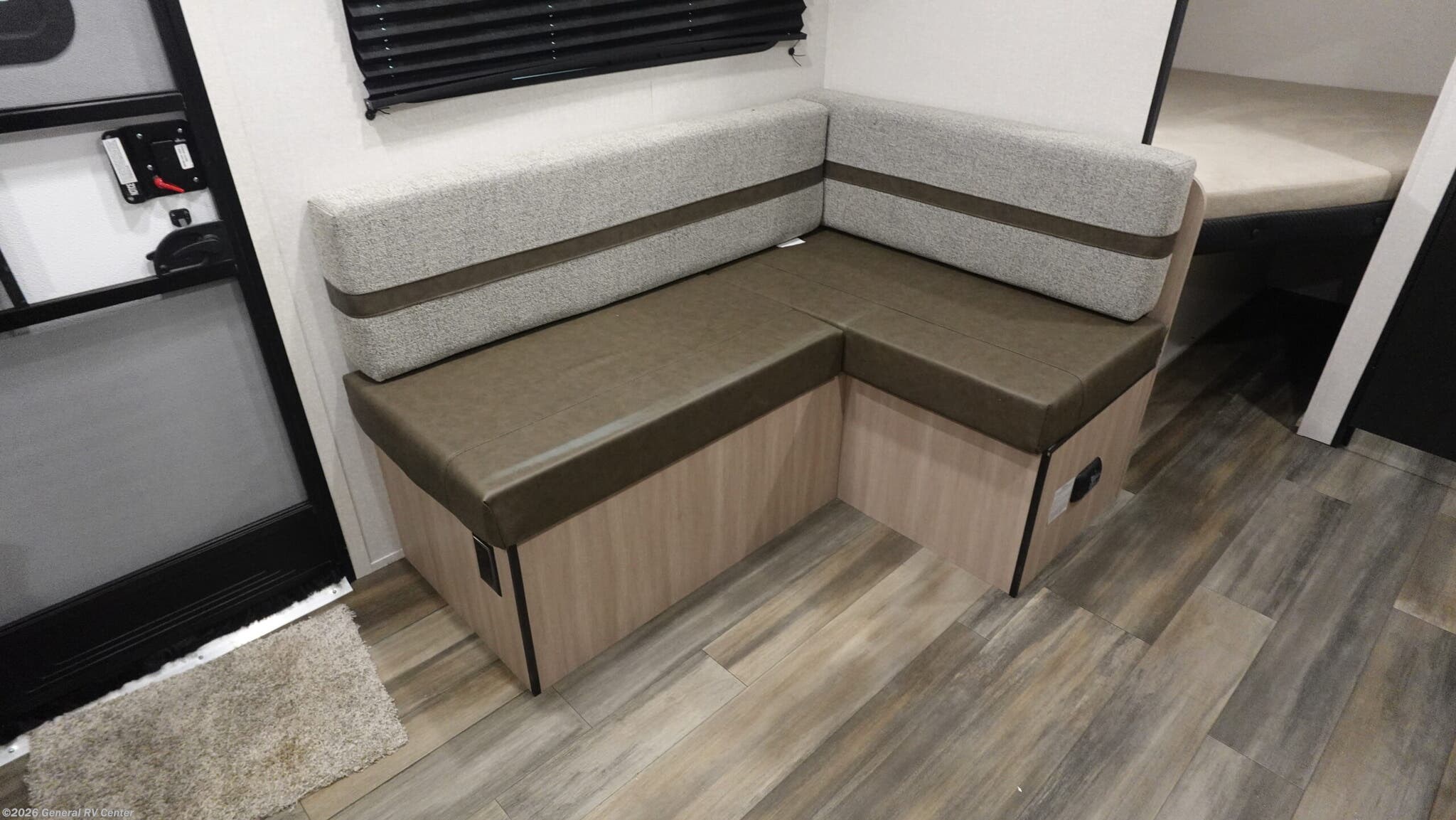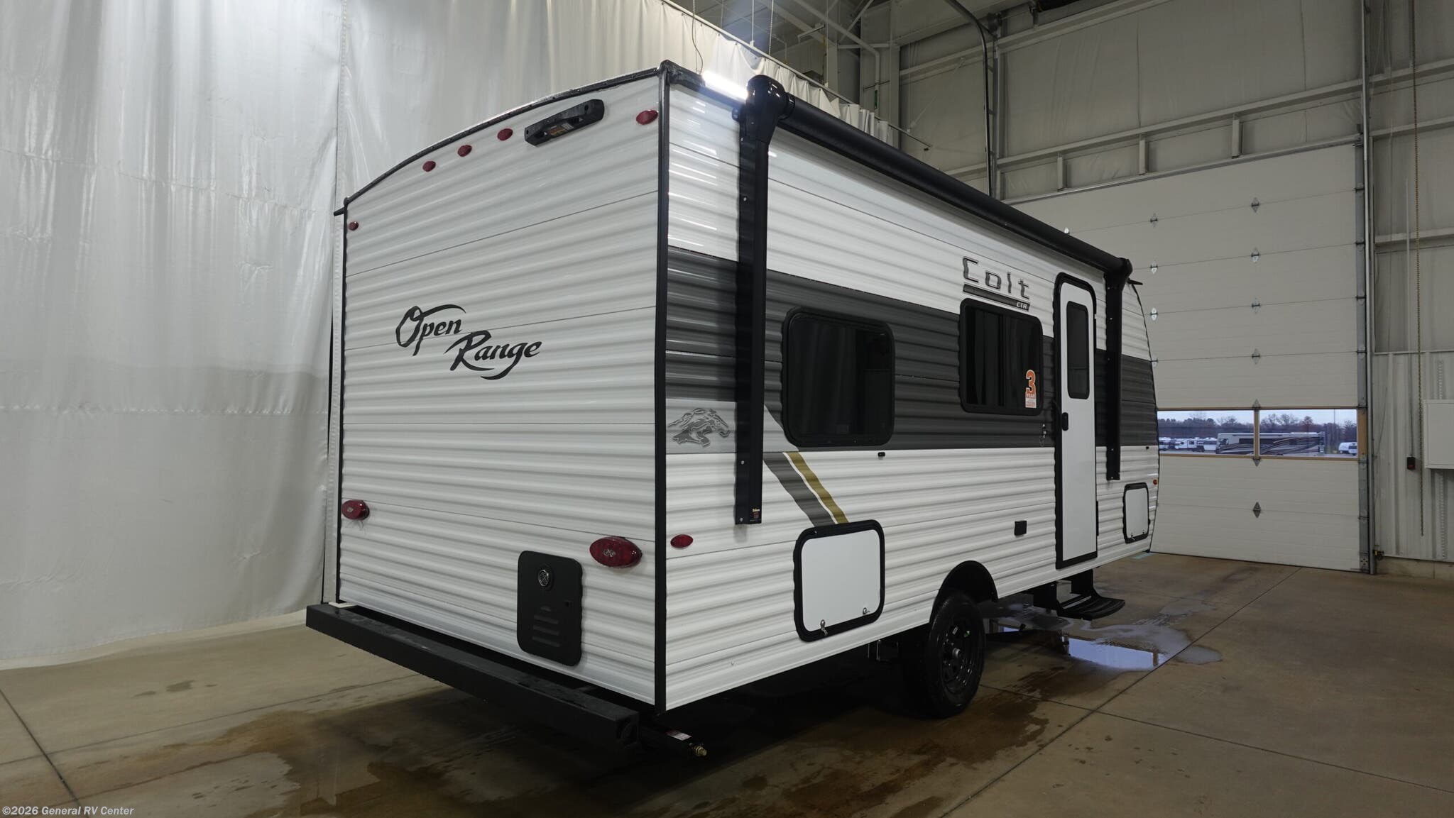 Open Range RV Colt travel trailer 17DB - CTR Edition highlights: Double-Size Bunk Beds Overhead Cabinets L-Shaped Dinette 40" Shower Front Queen Bed This easy to tow travel trailer features compact sleeping spaces thanks to the double-size bunk beds in the rear corner, and the private bath is right next to the bunks for easy nighttime use! You'll have the front queen bed to yourselves, along with a wardrobe, nightstand, and overhead shelf for your things. A two-burner cooktop and microwave oven will let you make meals each day, and there is a 12V refrigerator to keep your cold items fresh. Outside, you'll enjoy the 10' power awning for added shade, and there are two exterior storage compartments to keep fishing poles, hiking gear and more! With any Colt travel trailer by Open Range RV, you can be sure you're getting a budget-friendly unit designed to fit your lifestyle! Each one is built to last with a PVC roofing membrane and built-in A-frame, plus there are nitrogen-filled radial tires and self-adjusting electric brakes for easy towing. You will appreciate the utilities that include 30-amp service, an A/C unit, and an on-demand tankless water heater. A few interior comforts include vinyl flooring throughout, solid hardwood cabinet doors, and residential grade kitchen countertops to make your space feel more like home.